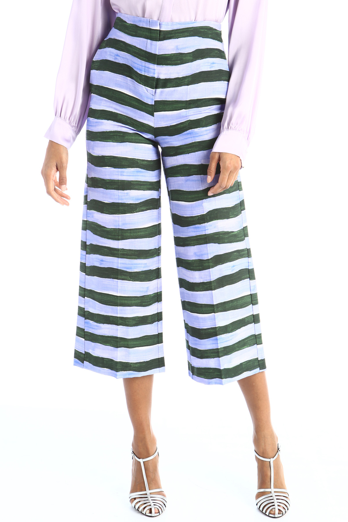 Pantaloni cropped dalla linea ampia realizzati in stuioa di cotone stampato, con tasche laterali inserite nella cucitura e a filetto dietro. Allacciatura nascosta tramite zip.