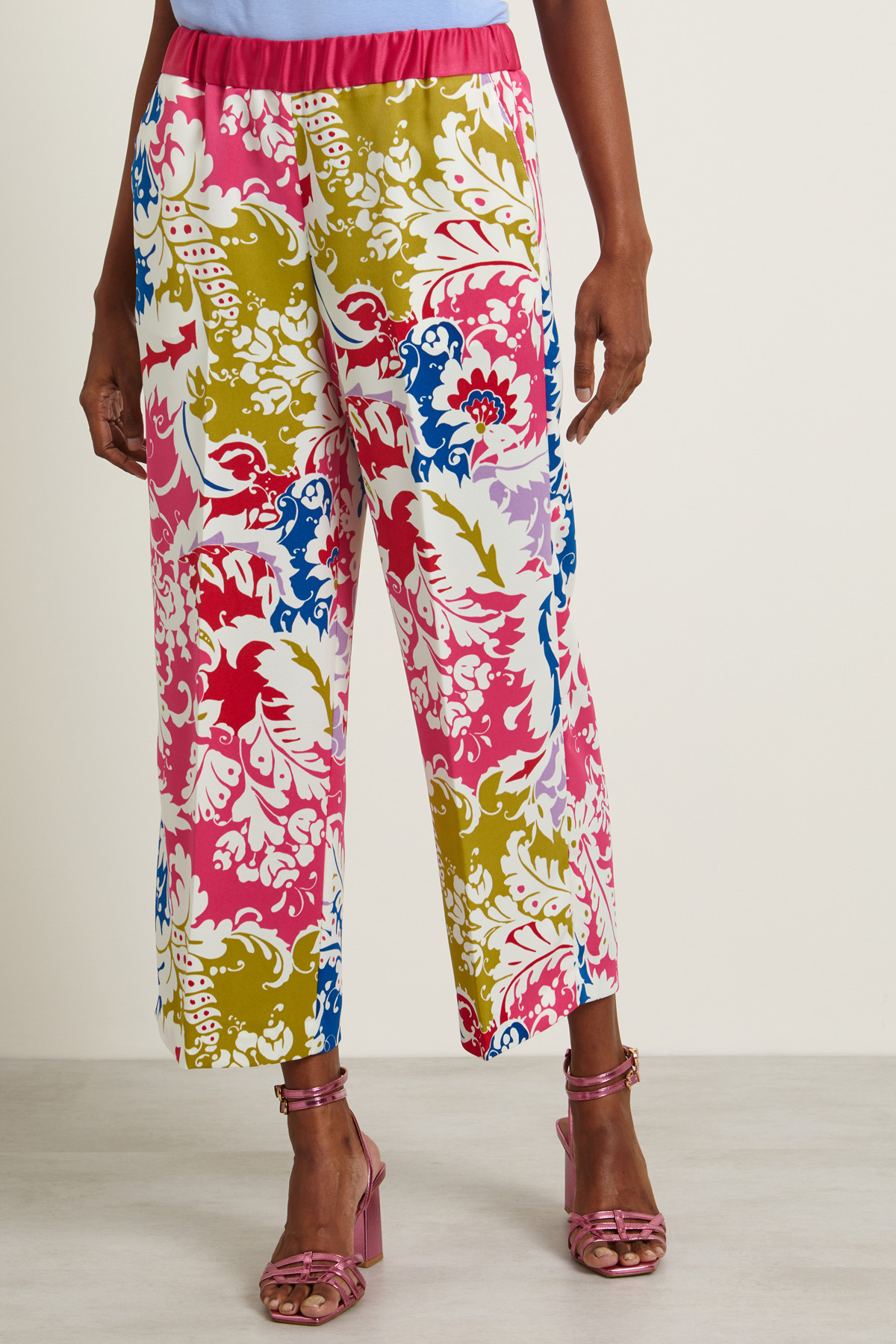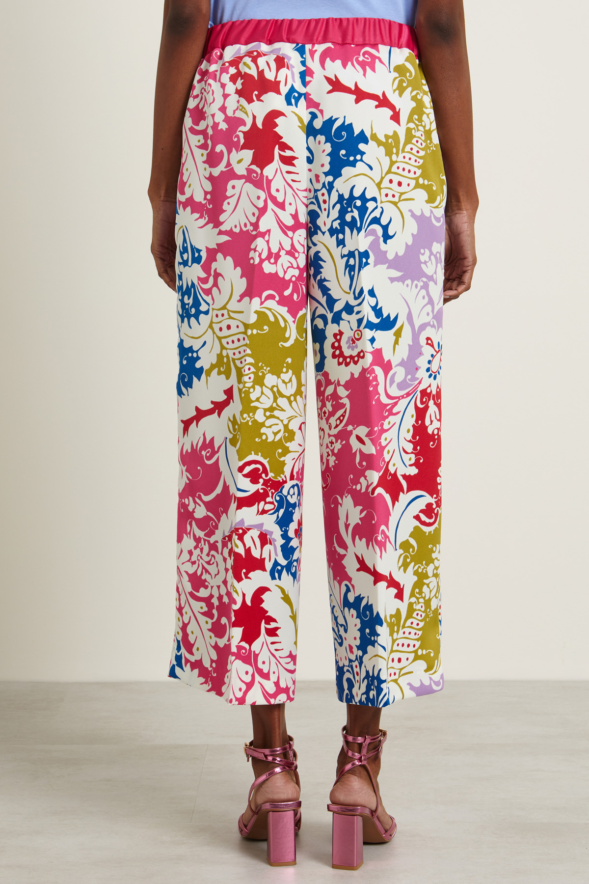 Pantaloni dalla linea svasata realizzati in envers satin stampato con inserto elastico in vita e tasche alla francese.