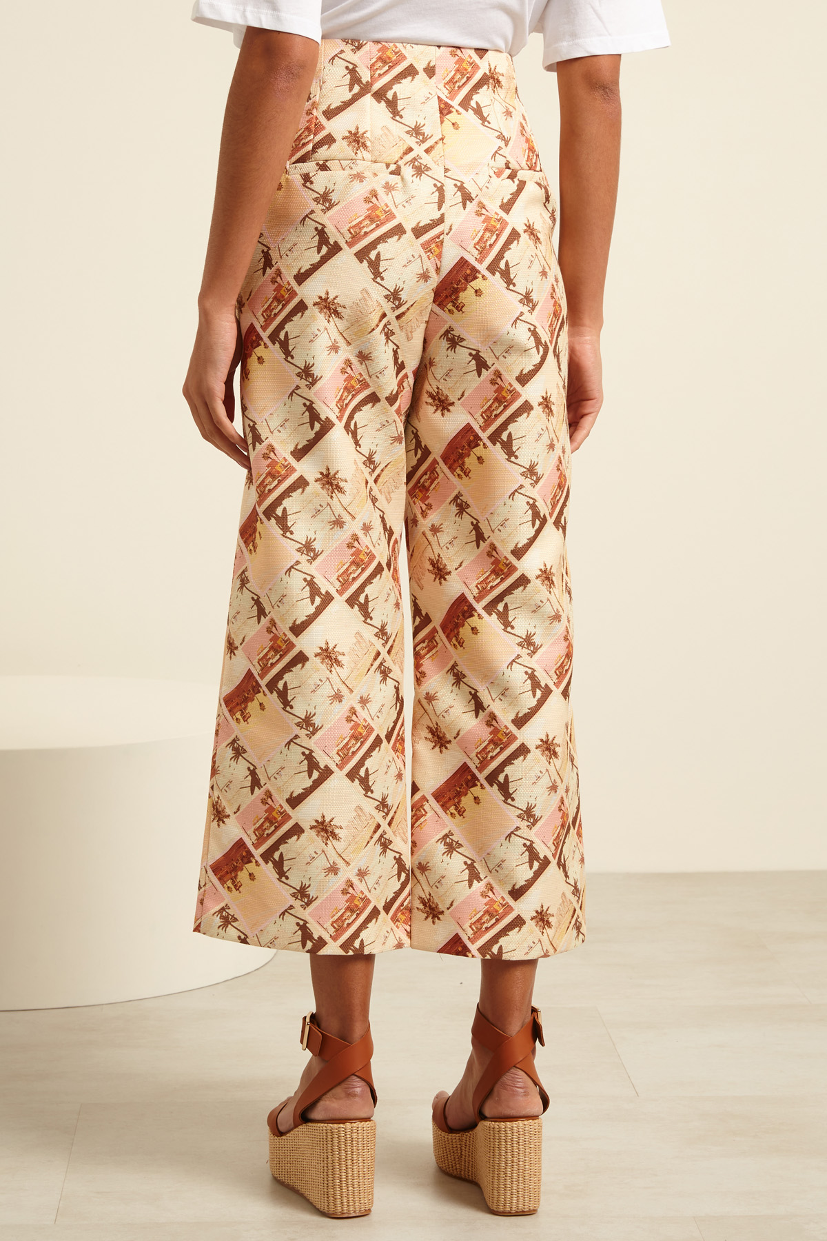 Pantaloni a vita alta dalla linea ampia realizzati in stuoia stampata, con pinces in vita, tasche laterali alla francese e a filetto nel retro. Allacciatura nascosta tramite zip, bottone e gancio.
