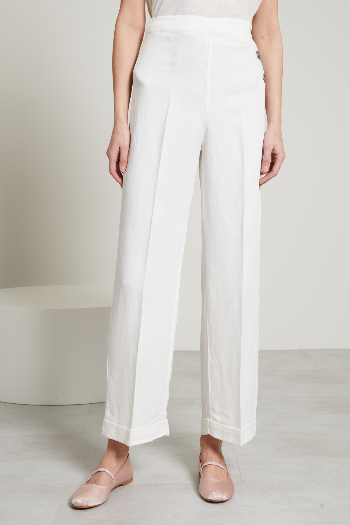 Pantaloni dalla linea morbida e dritta realizzati in tessuto armaturato di fibra naturale e lino, con tasche applicate nel retro, orlo con risvolto e allacciatura tramite bottoni a vista sul fianco.