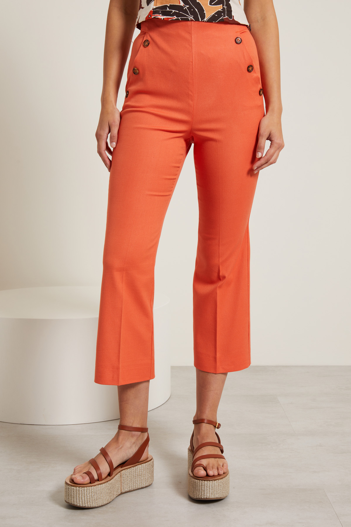 Pantaloni cropped dalla linea flare realizzati in tela armaturata di cotone e viscosa stretch, con vita alta, tasche alla francese e motivo di bottoni decorativi. Allacciatura tramite zip invisibile sul fianco.