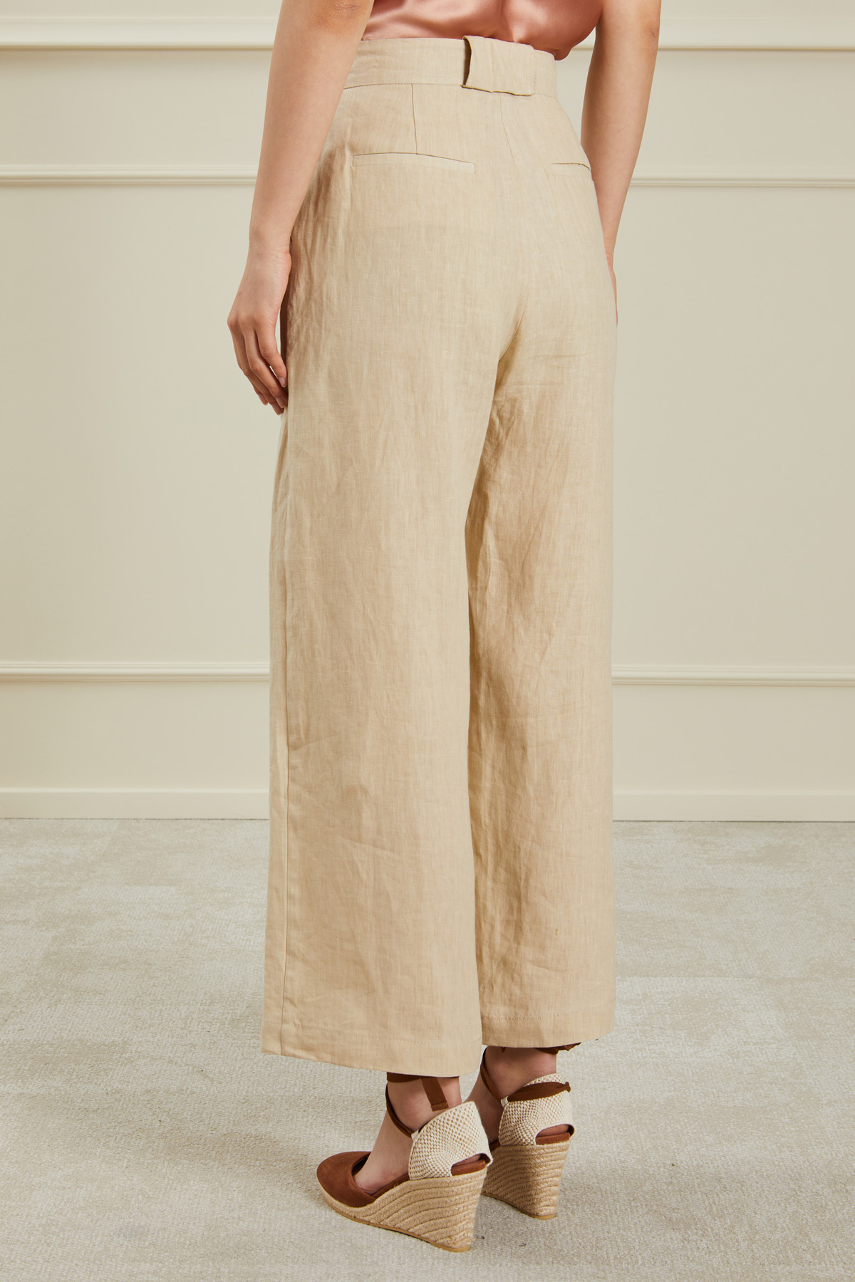 Pantaloni dalla linea ampia realizzati in tela di puro lino, con maxi passanti e dettaglio di pieghe cucite in vita, tasche alla francese sul davanti e a filetto nel retro, allacciatura nascosta tramite zip, bottone e ganci.