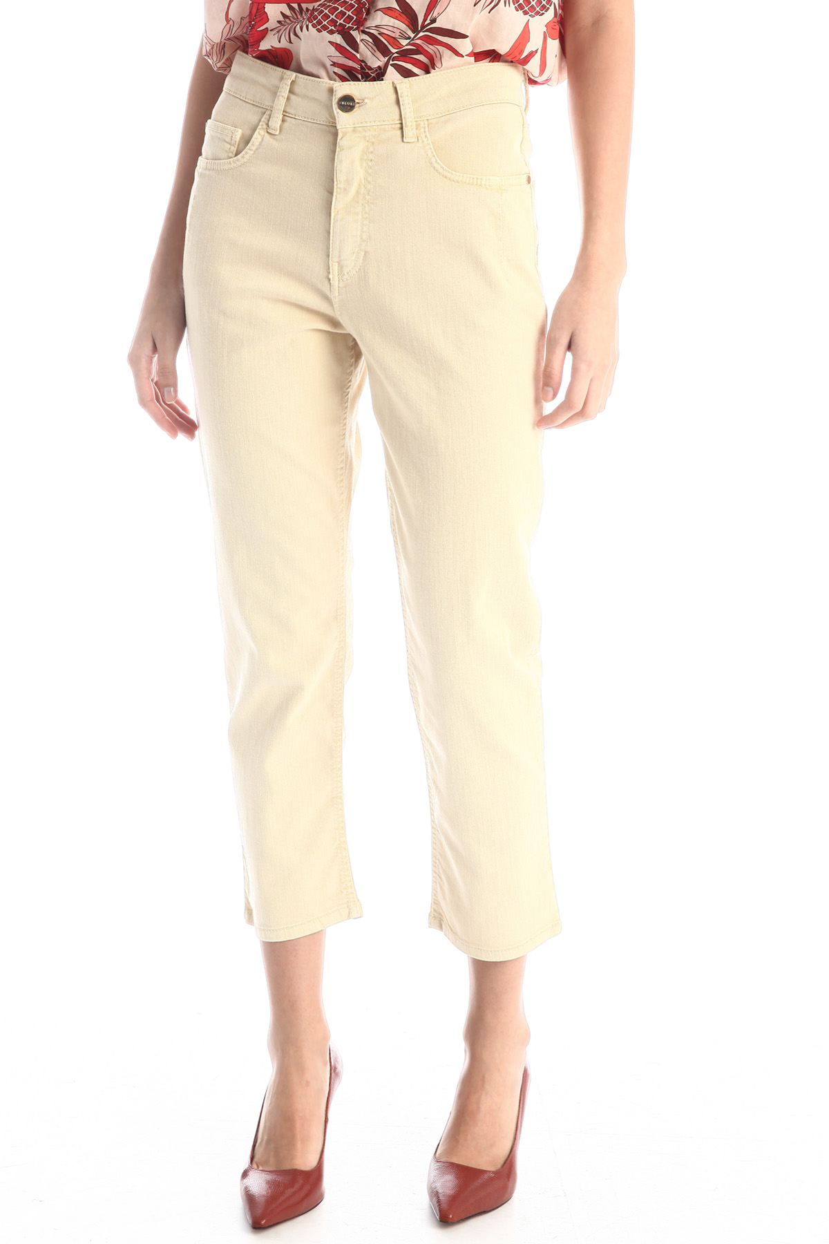 Pantaloni slim realizzati in bull di misto cotone stretch, con passanti in vita, cinque tasche e allacciatura tramite zip nascosta e bottone metallico.