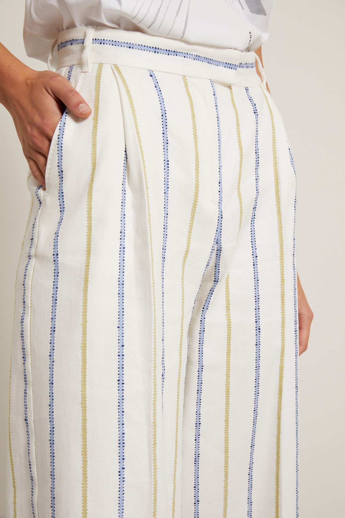 Pantaloni a palazzo realizzati in tessuto diagonale di misto cotone, lino e viscosa stretch gessato, con passanti in vita, pieghe cucite e tasche alla francese sul davanti. Allacciatura nascosta tramite zip, bottone e gancio.