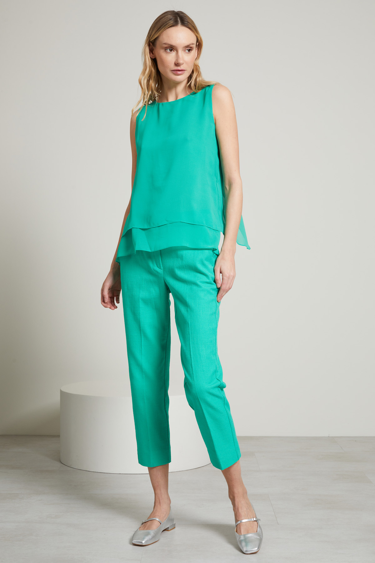Pantaloni a sigaretta realizzati in tela armaturata di misto cotone stretch, con passanti in vita, tasche alla francese e piega stirata sul davanti. Allacciatura nascosta tramite zip bottone e gancio.