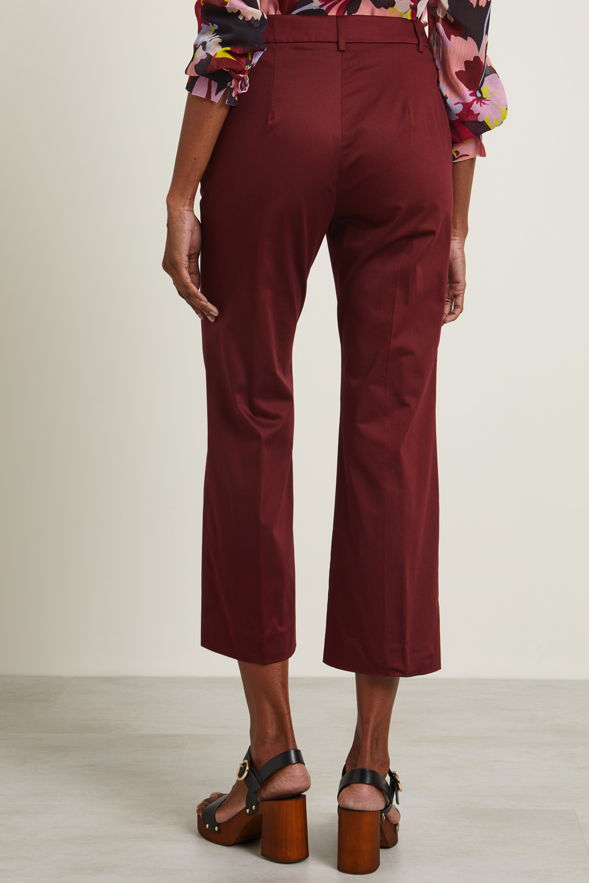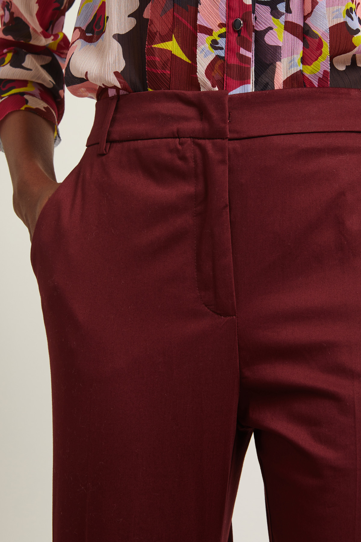Pantaloni dalla linea leggermente flare realizzati in raso di cotone stretch con passanti in vita e tasche alla francese. Allacciatura tramite zip, bottone e gancio.