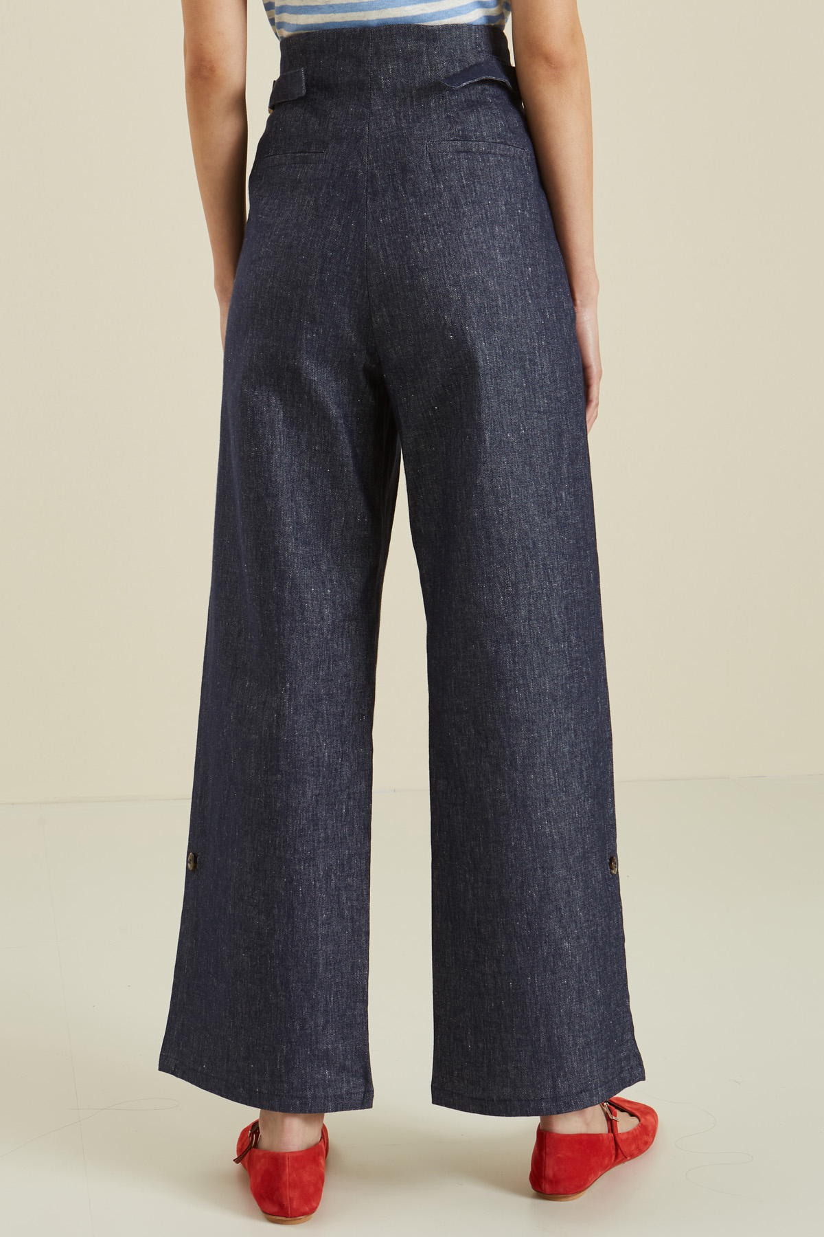 Jeans a gamba larga realizzati in denim di cotone e lino, con cinturini in denim regolabili da fibbie in resina in vita, tasche alla francese ai fianchi e a filetto dietro. Chiusura nascosta tramite zip, gancio e bottone.