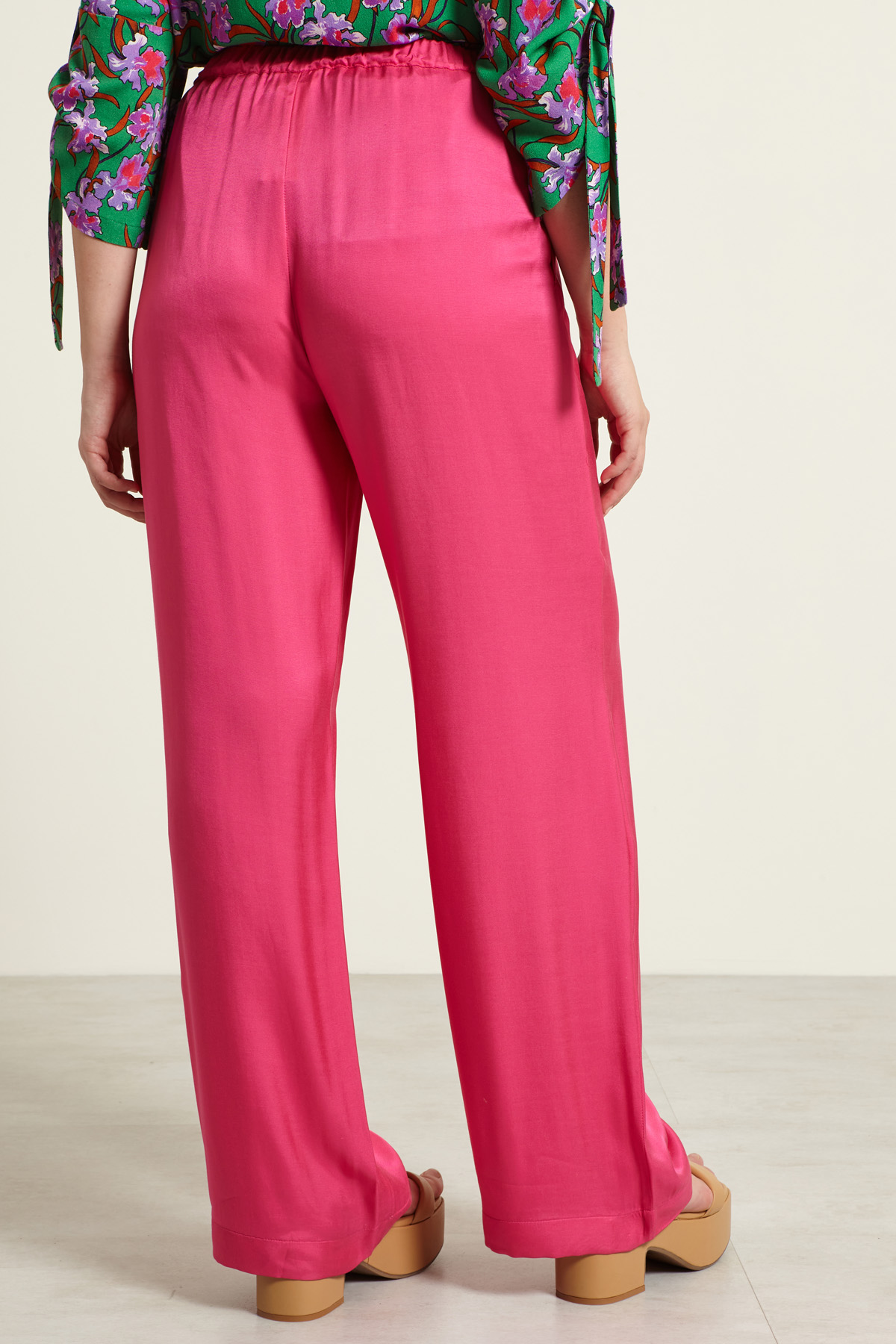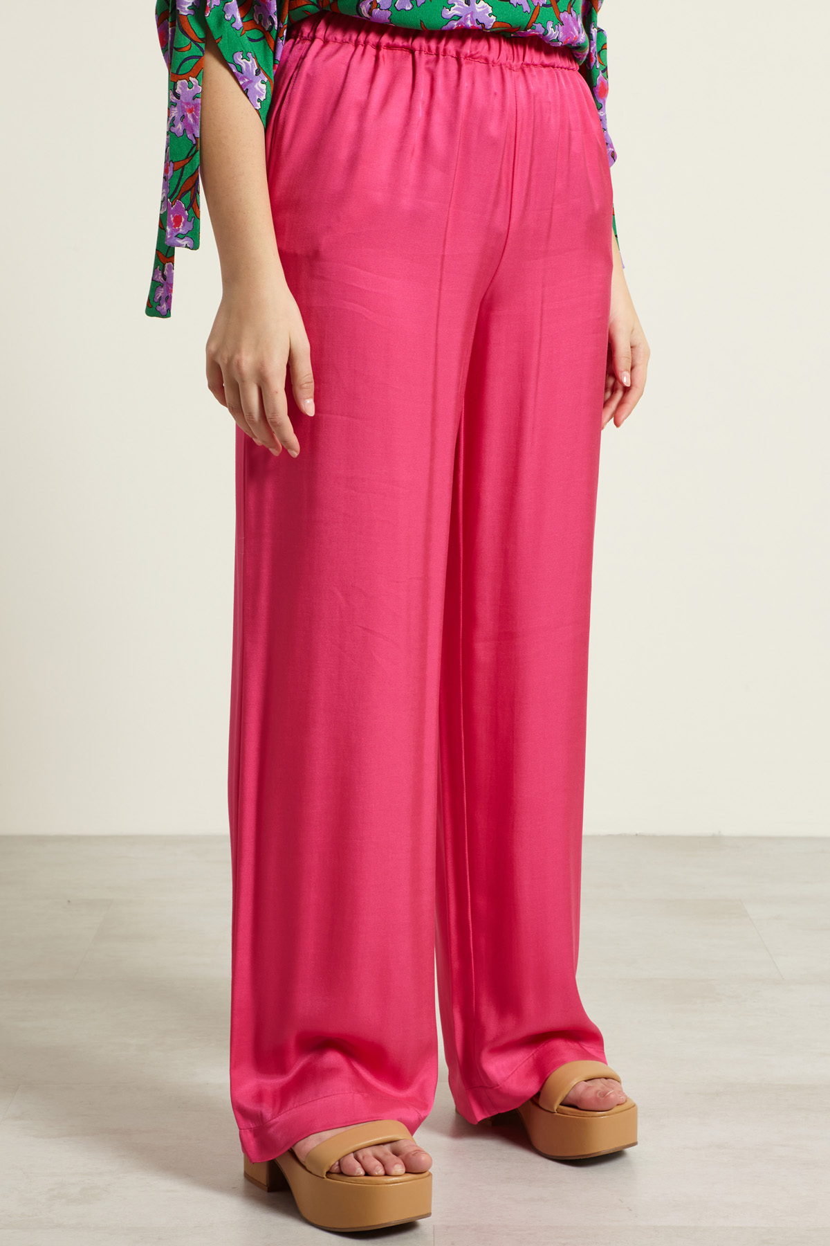 Pantaloni a palazzo dalla linea fluida realizzati in twill di pura viscosa, con inserto elastico in vita e tasche laterali inserite in cucitura.