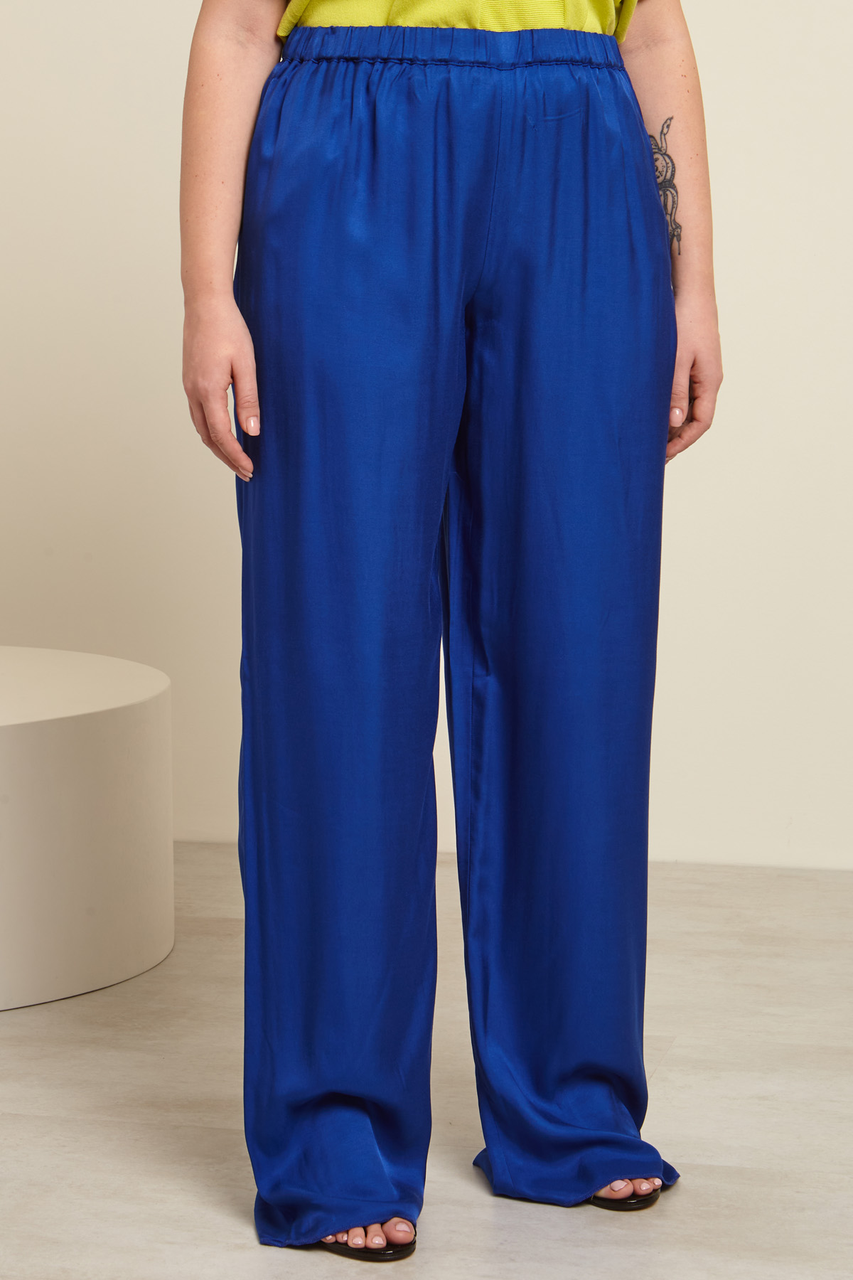Pantaloni a palazzo dalla linea fluida realizzati in twill di pura viscosa, con inserto elastico in vita e tasche laterali inserite in cucitura.