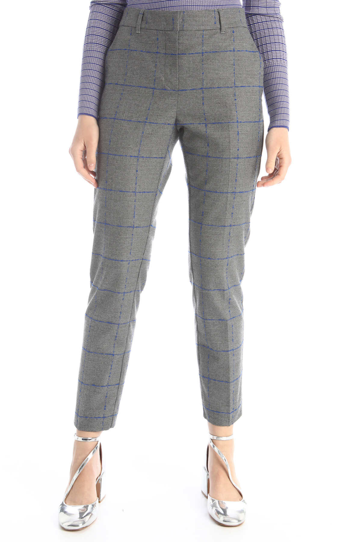 Pantaloni a sigaretta realizzati in flanella di viscosa stretch tinto filo, con inserto bouclè, passanti in vita, tasche laterali alla francese sul davanti e a filetto sul retro, allacciatura tramite zip nascosta, bottone e gancio.
