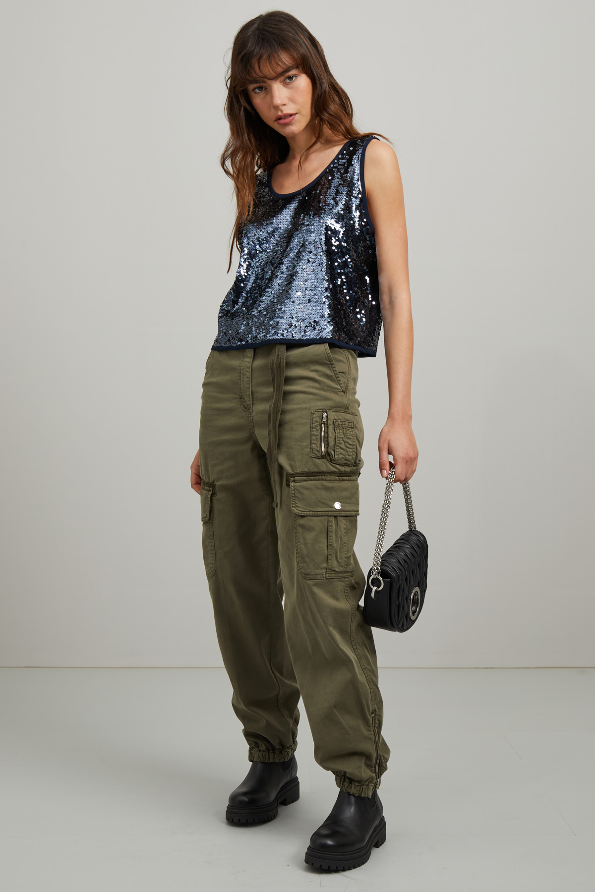 Pantaloni leggermente baggy realizzati in gabardina di cotone stretch, con passanti in vita e cinturini, tasche laterali alla francese, a filetto nel retro e applicate con patta lungo la gamba. Capo dotato di inserti elastici con zip al fondo. Allacciatura tramite zip nascosta e bottone.