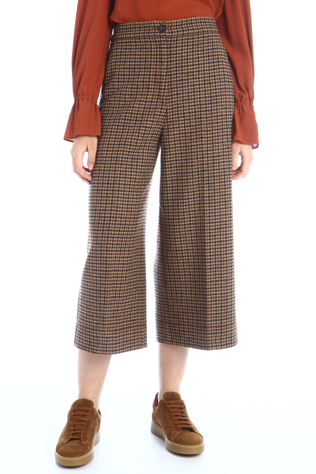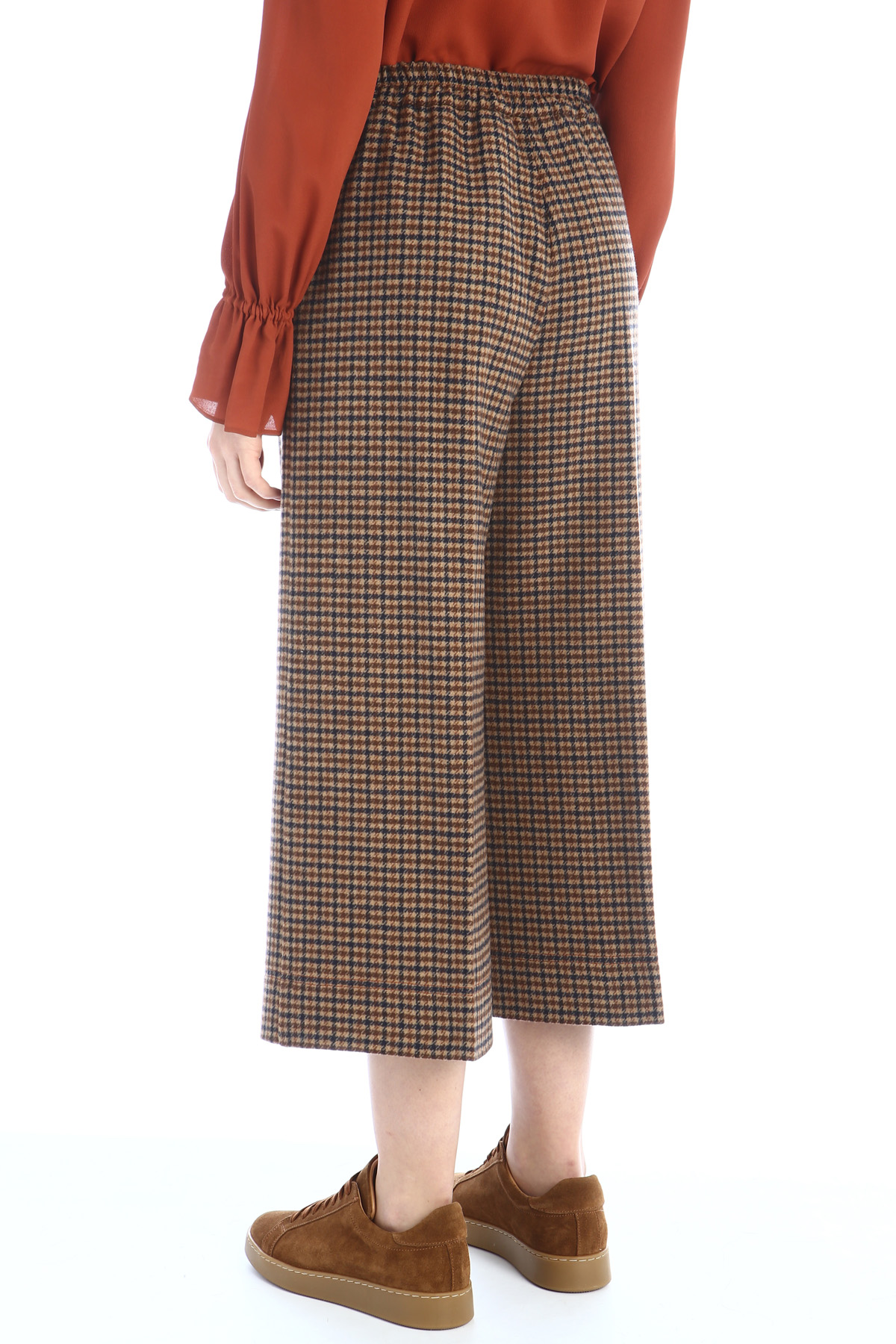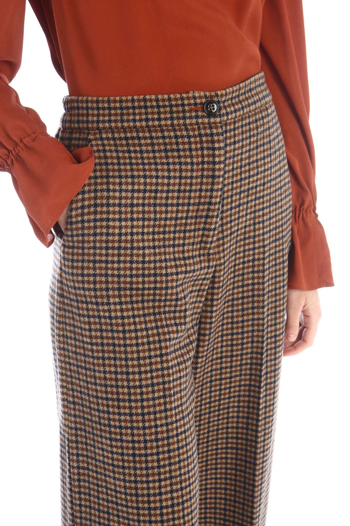 Pantaloni dalla linea ampia realizzati in flanella di misto lana tinto filo, con inserto elastico in vita, tasche laterali alla francese sul davanti, allacciatura tramite zip nascosta e bottone.
