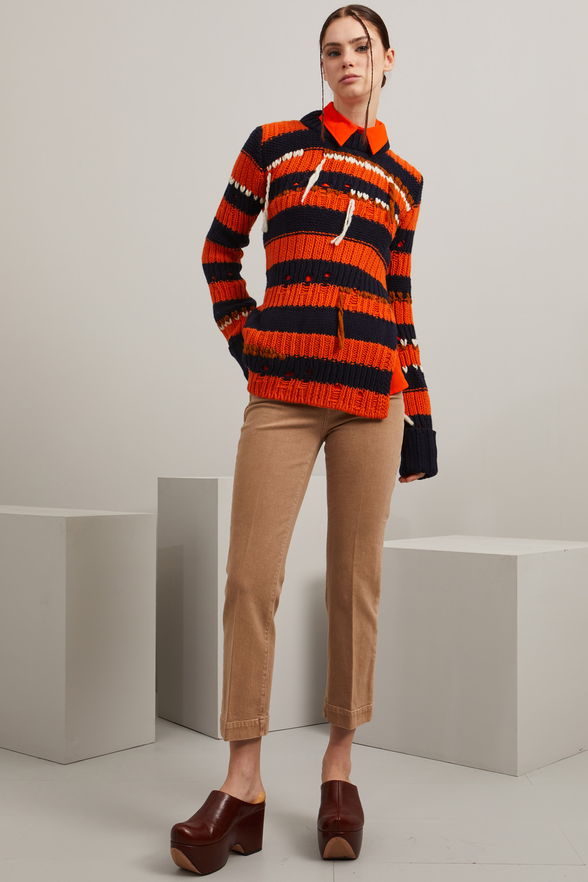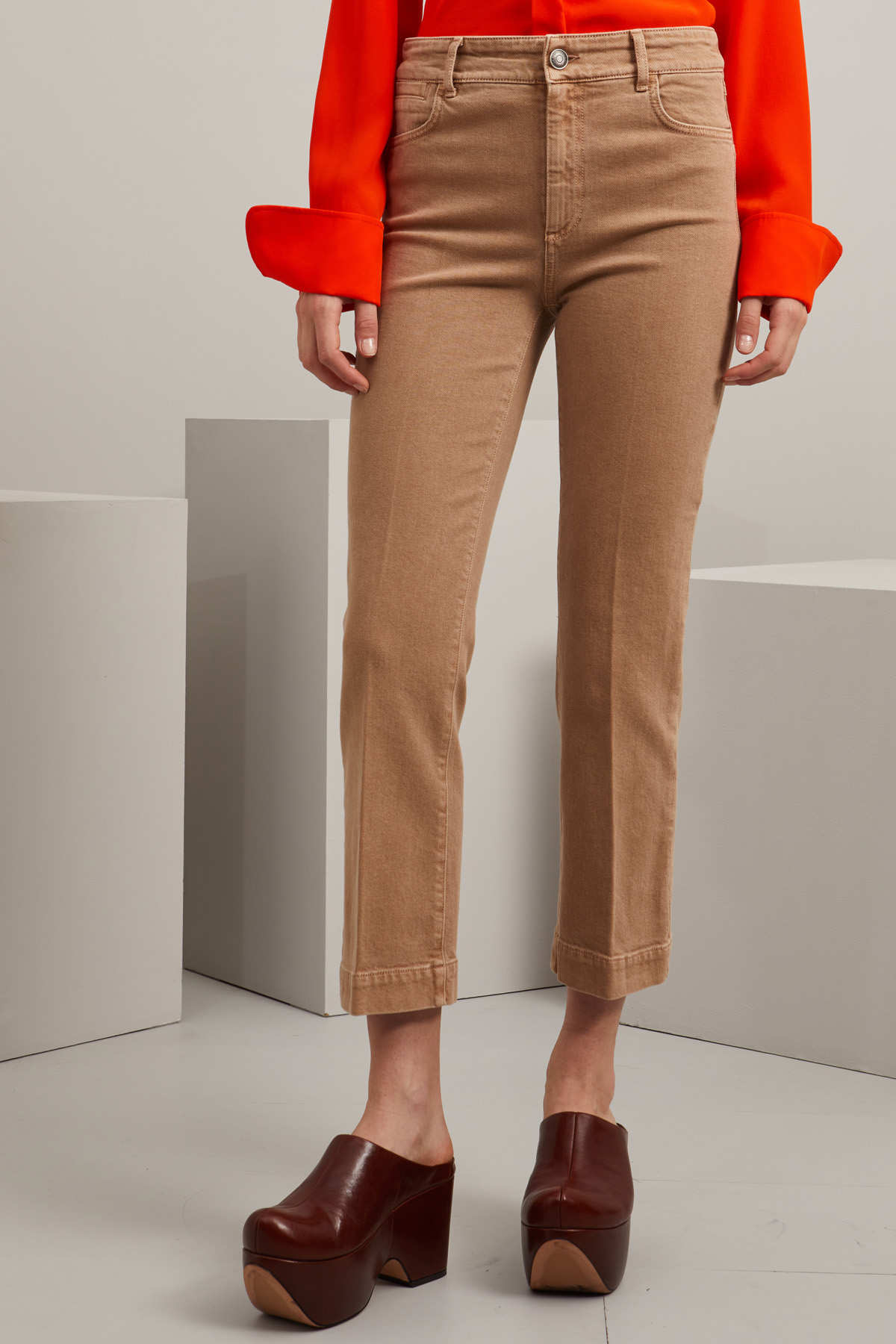 Pantaloni a trombetta realizzati in bull di cotone stretch, con passanti in vita, piega stirata e cinque tasche. Allacciatura tramite zip nascosta e bottone.