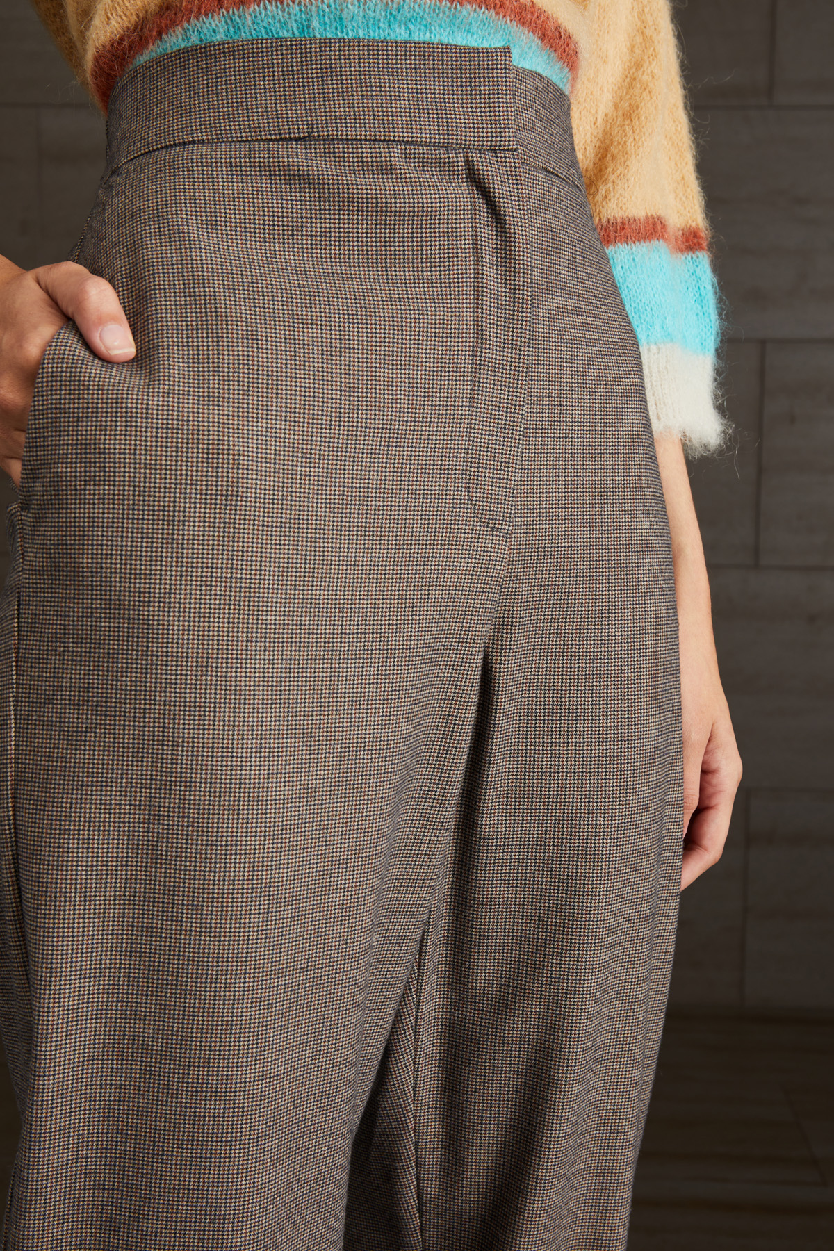 Pantaloni dalla linea stretta al fondo realizzati in tessuto di misto viscosa stretch tinto filo, con inserto elastico nel retro in vita e al fondo, tasche alla francese e allacciatura tramite zip e gancio.