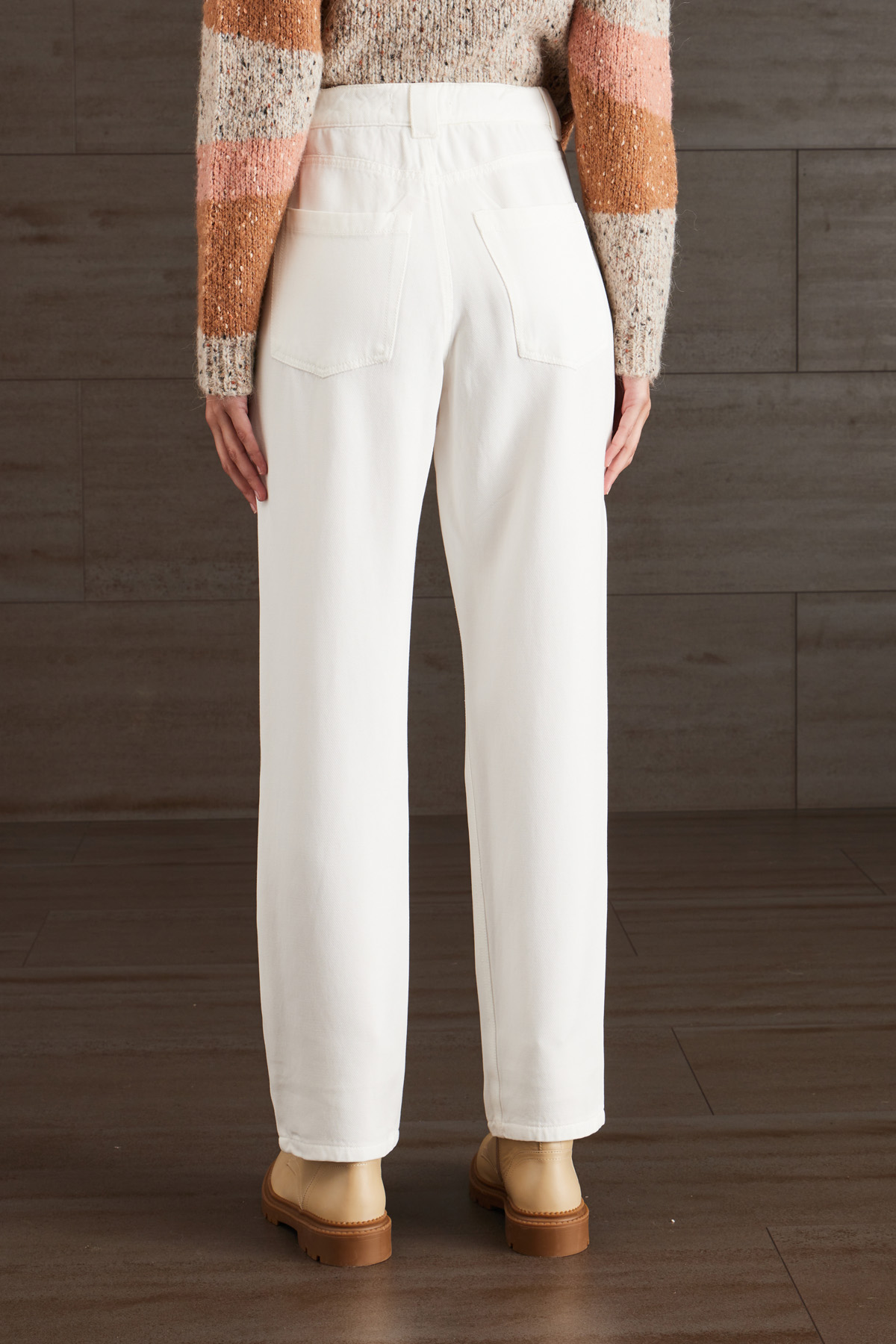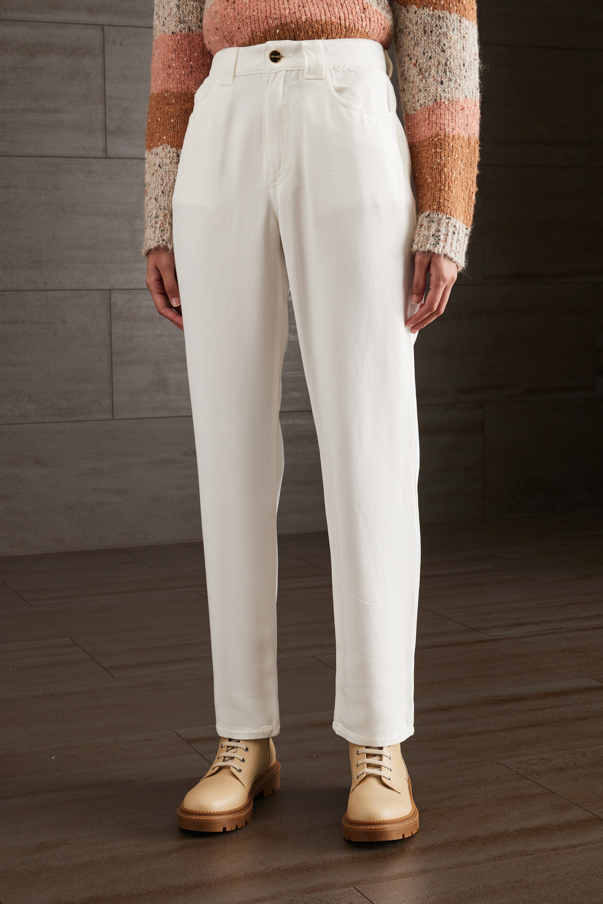 Pantaloni dalla linea dritta realizzati in gabardina, con passanti in vita, cinque tasche e chiusura tramite zip invisibile e bottone metallico.