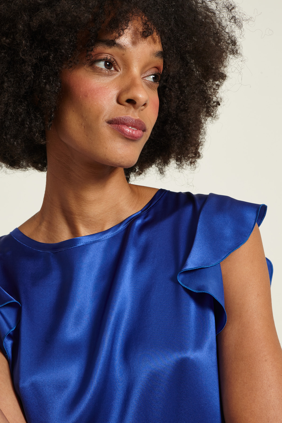 Blusa dalla linea morbida realizzata in raso di pura seta con scollo rotondo e apertura a goccia con bottone, maniche corte ad aletta e spacchi laterali al fondo.