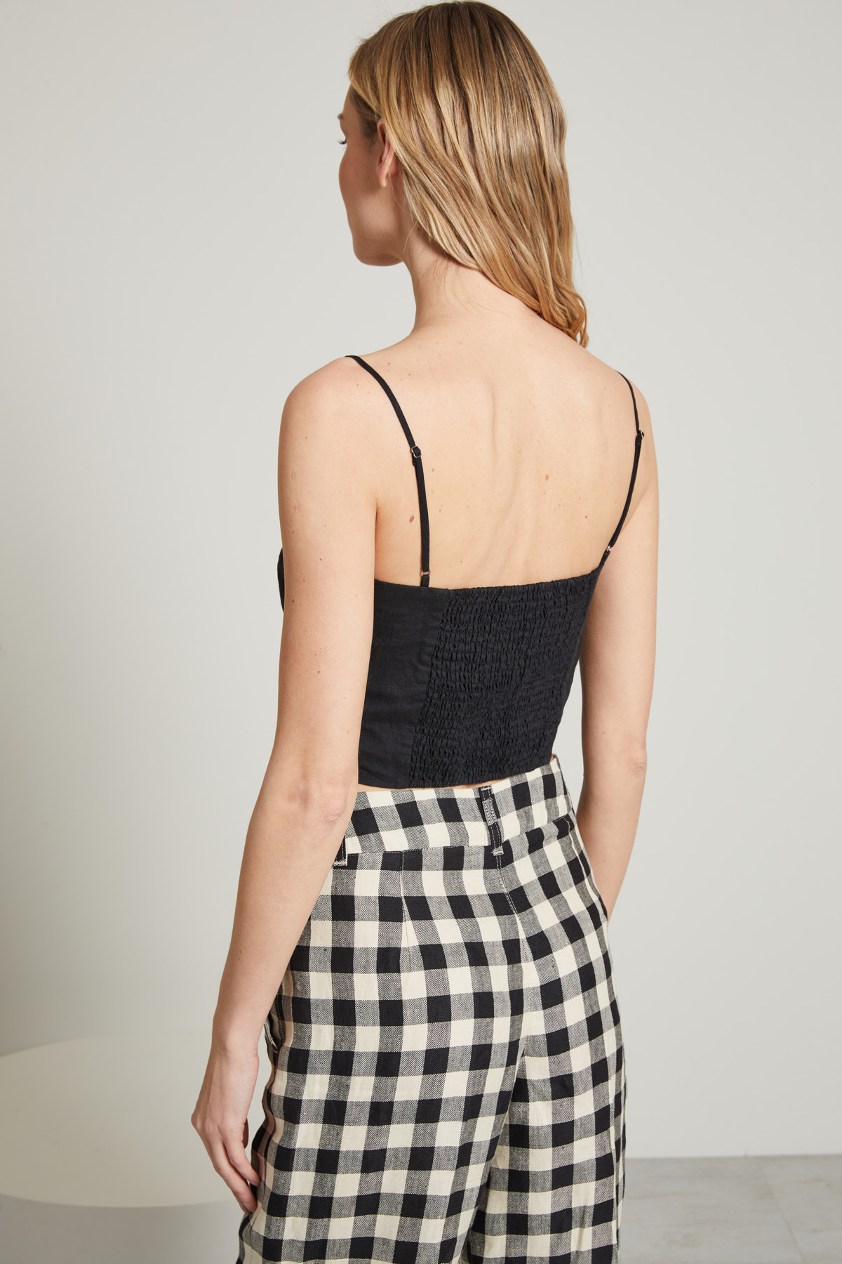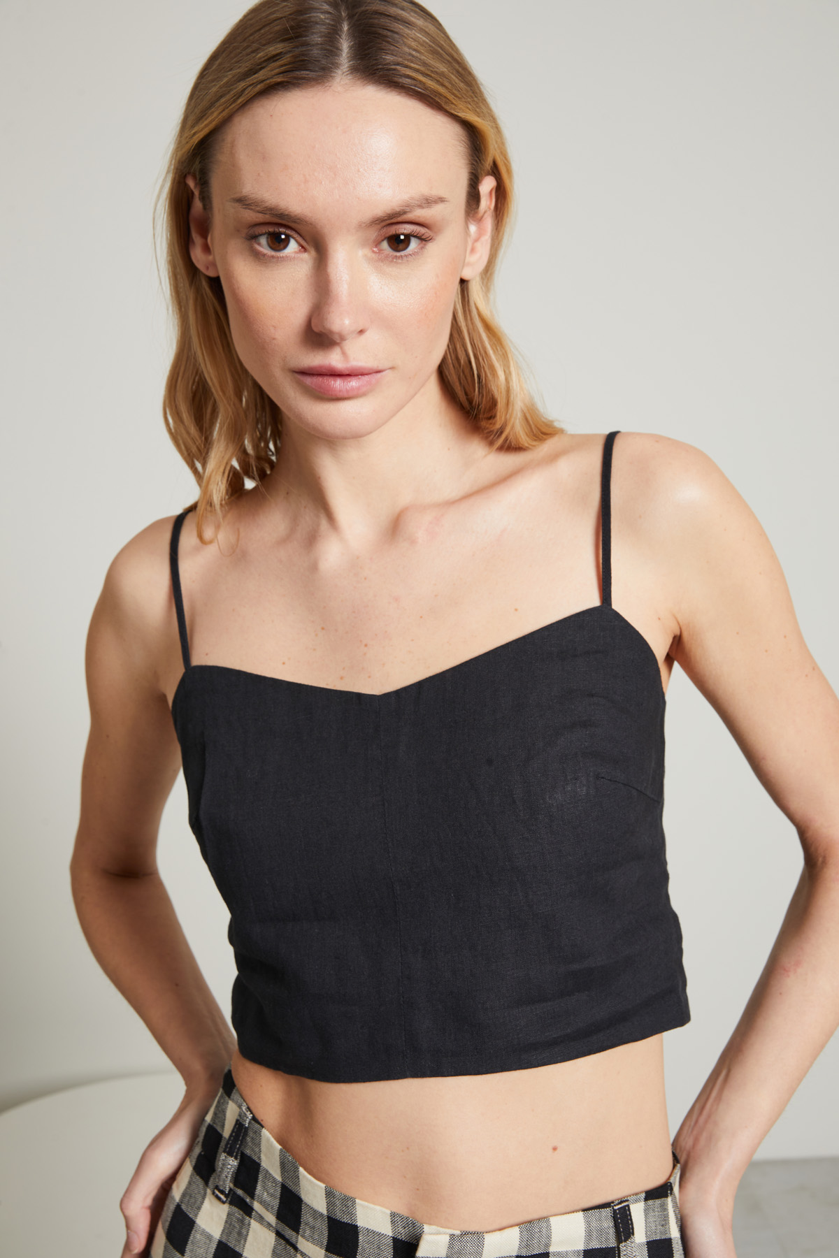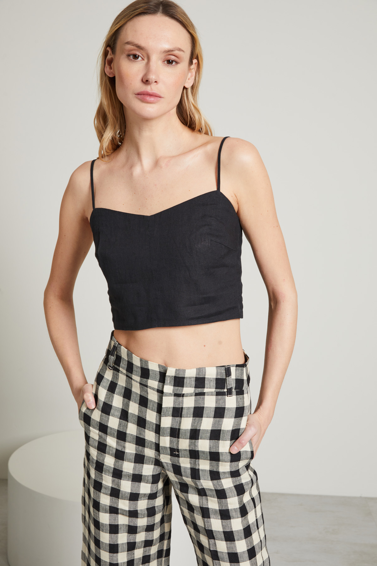 Top cropped smanicato dalla linea aderente realizzato in tela di puro lino, con scollo ampio, spalline sottili regolabili e arricciatura elastica nel retro.