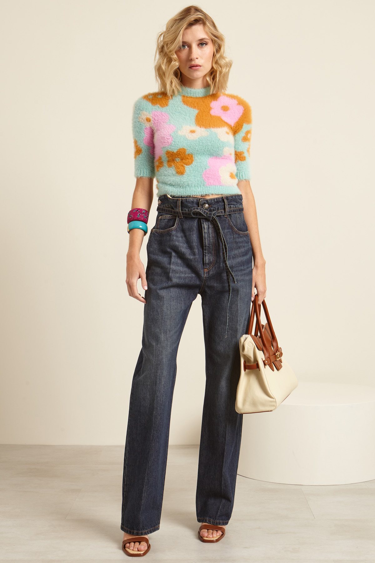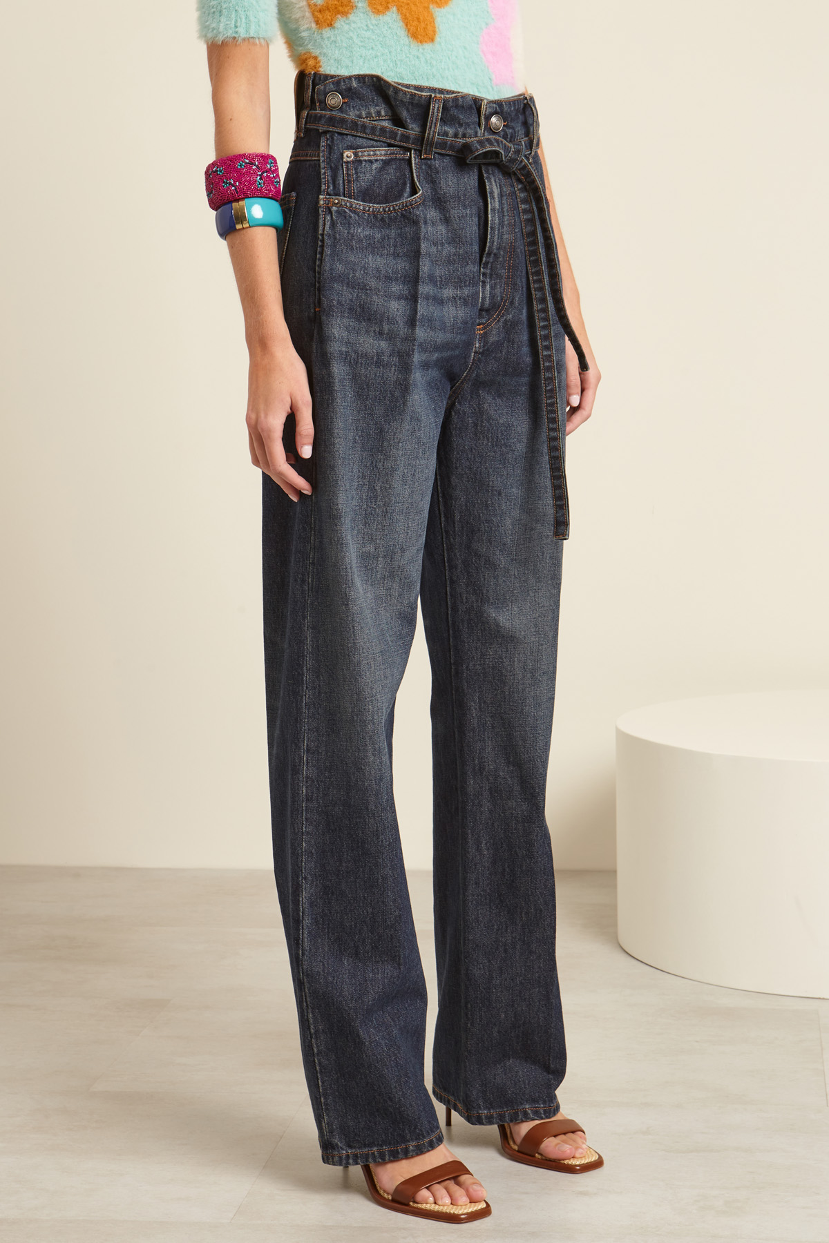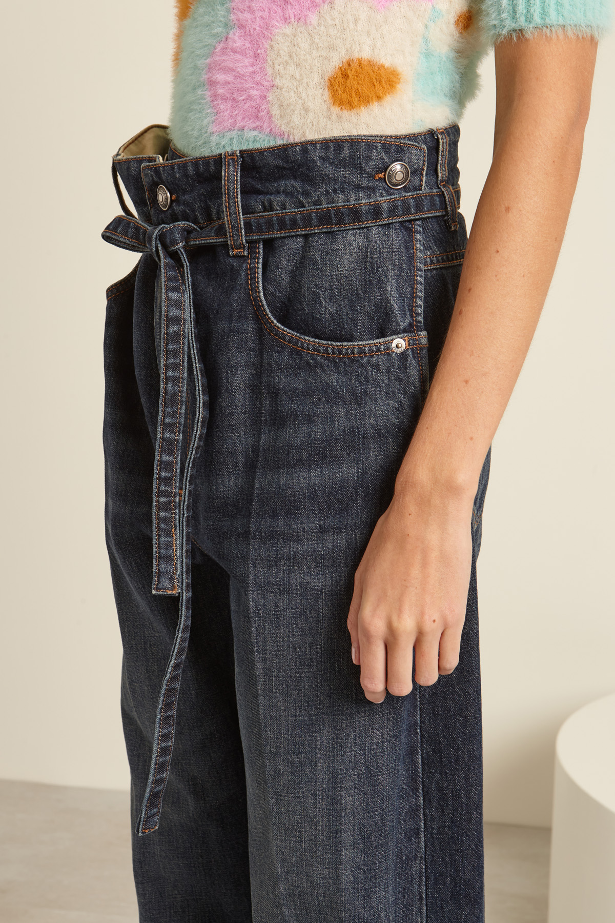 Jens dalla linea morbida realizzati in denim di puro cotone, con passanti in vita e bottoni, cinque tasche. Doppia allacciatura tramite zip nascosta con bottone sul davanti e fascia con bottoni in metallo all'interno. Capo dotato di cintura sottile coordinata.
