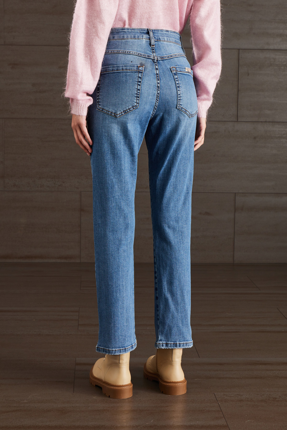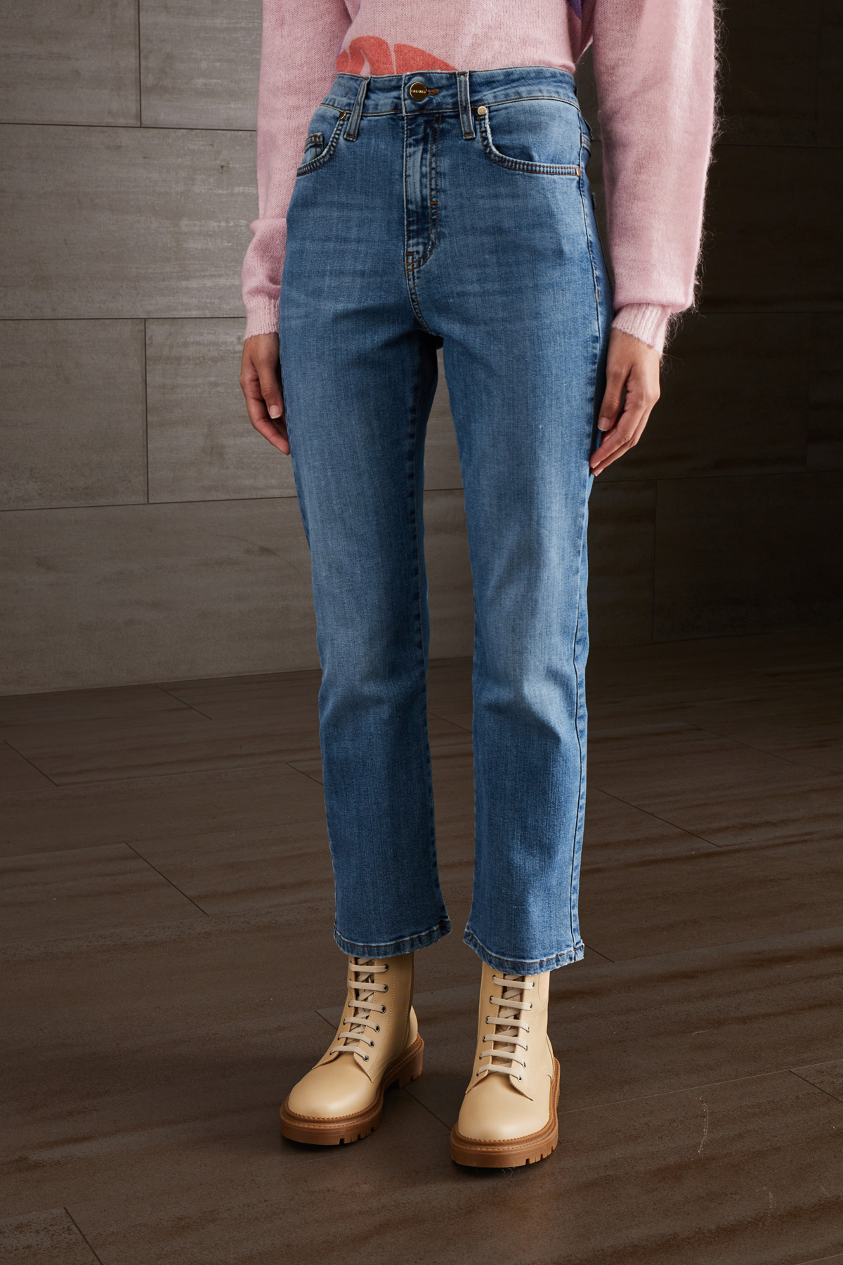 Jeans dalla linea dritta realizzati in denim di cotone stretch, con passanti in vita, cinque tasche e chiusura tramite zip nascosta e bottone metallico.