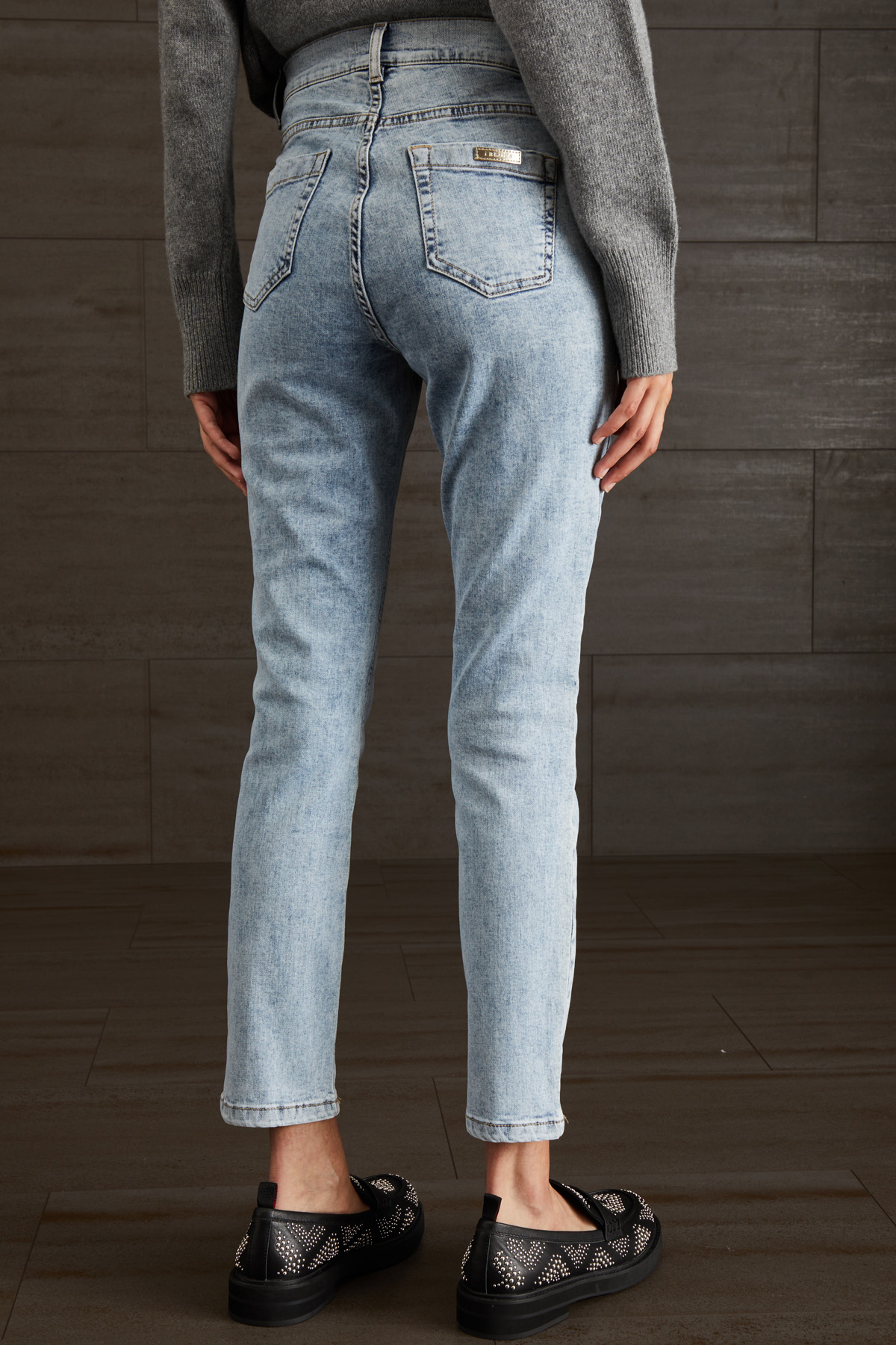 Jeans a sigaretta realizzati in denim di cotone stretch, con passanti in vita, cinque tasche. Allacciatura tramite zip nascosta e bottone.