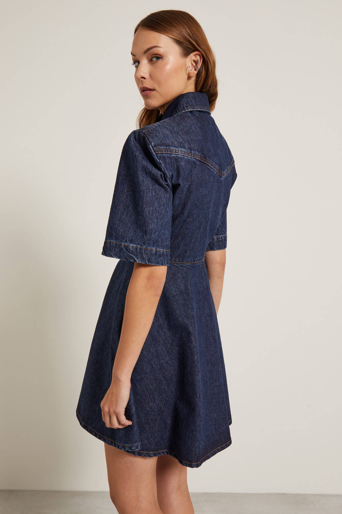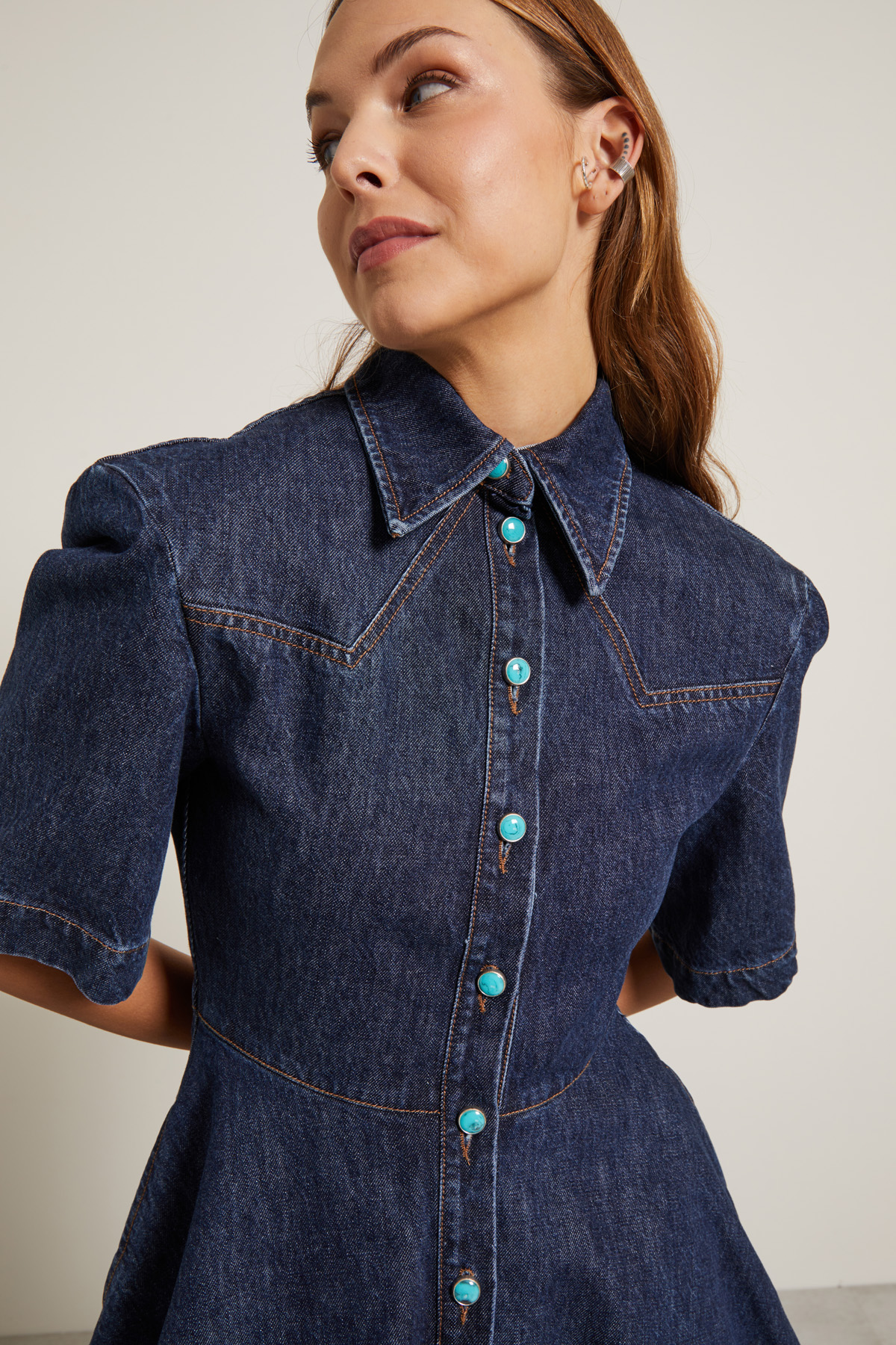 Chemisier corto dalla linea sfiancata realizzato in denim di puro coton, con collo a camicia, spalline imbottite, maniche corte, taglio in vita e tasche laterali inserite in cucitura. Allacciatura a tutta lunghezza tramite bottoni a vista.