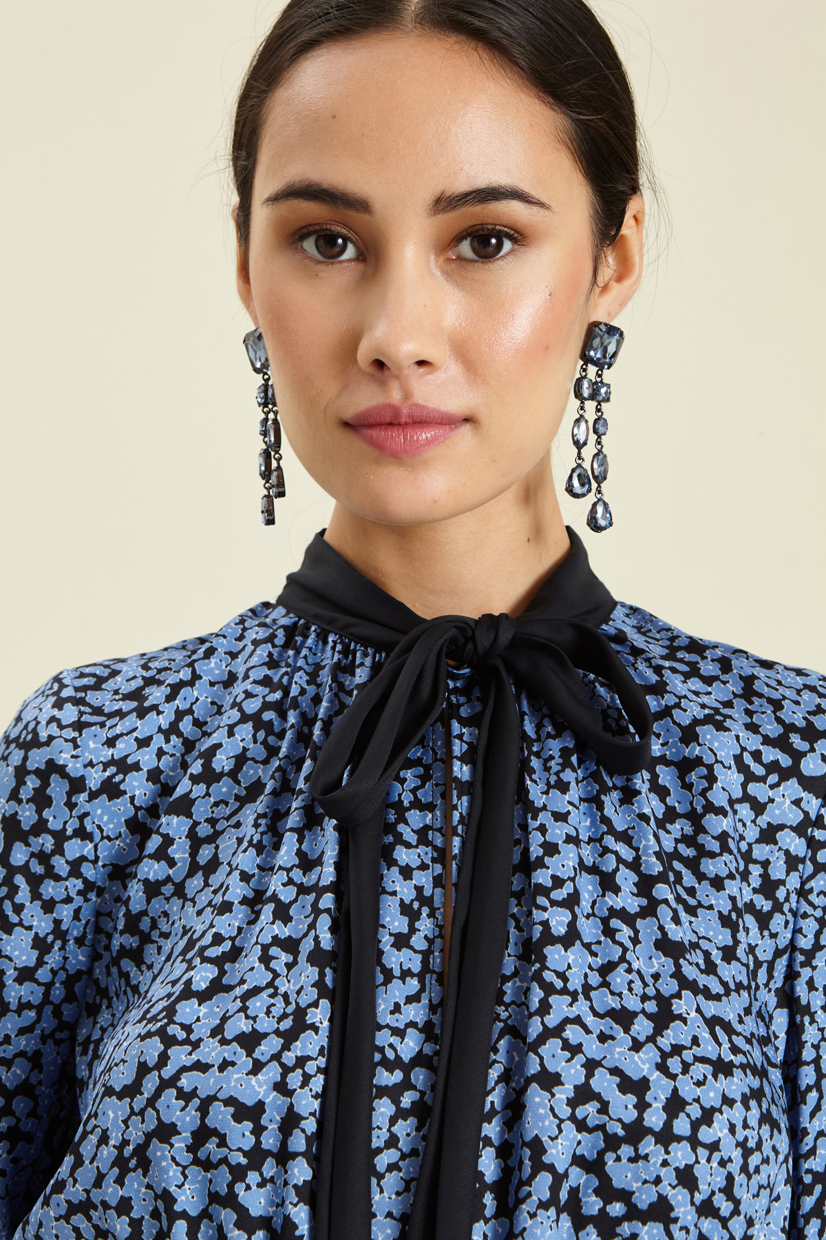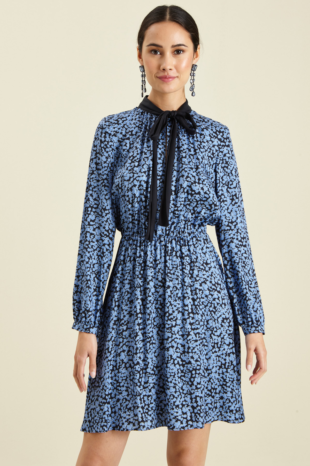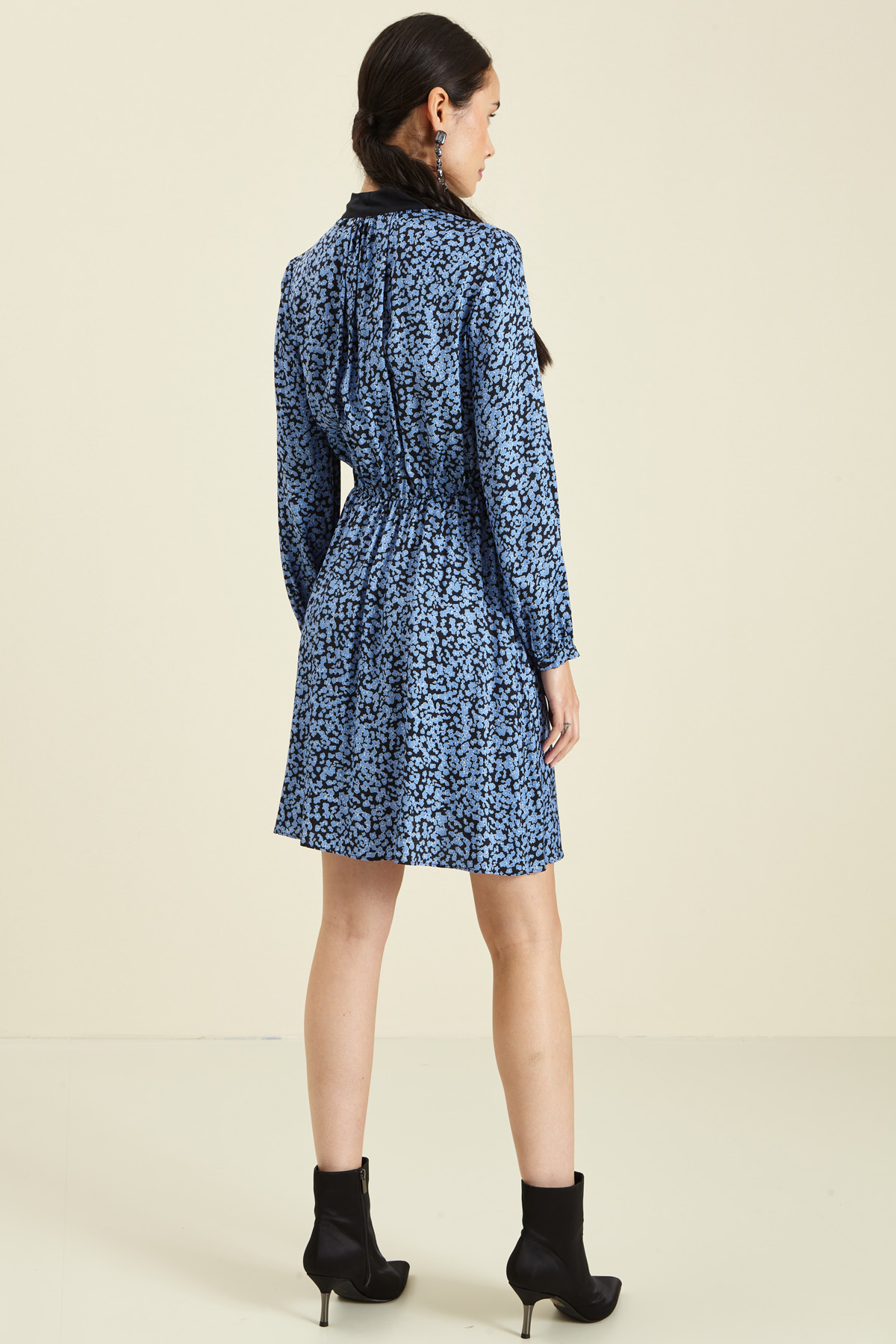 Abito dalla linea stretta in vita realizzato in twill di viscosa, con nastri al collo da annodare e apertura a goccia con bottone, polsino a fondo manica e inserto elastico con arriccio in vita.