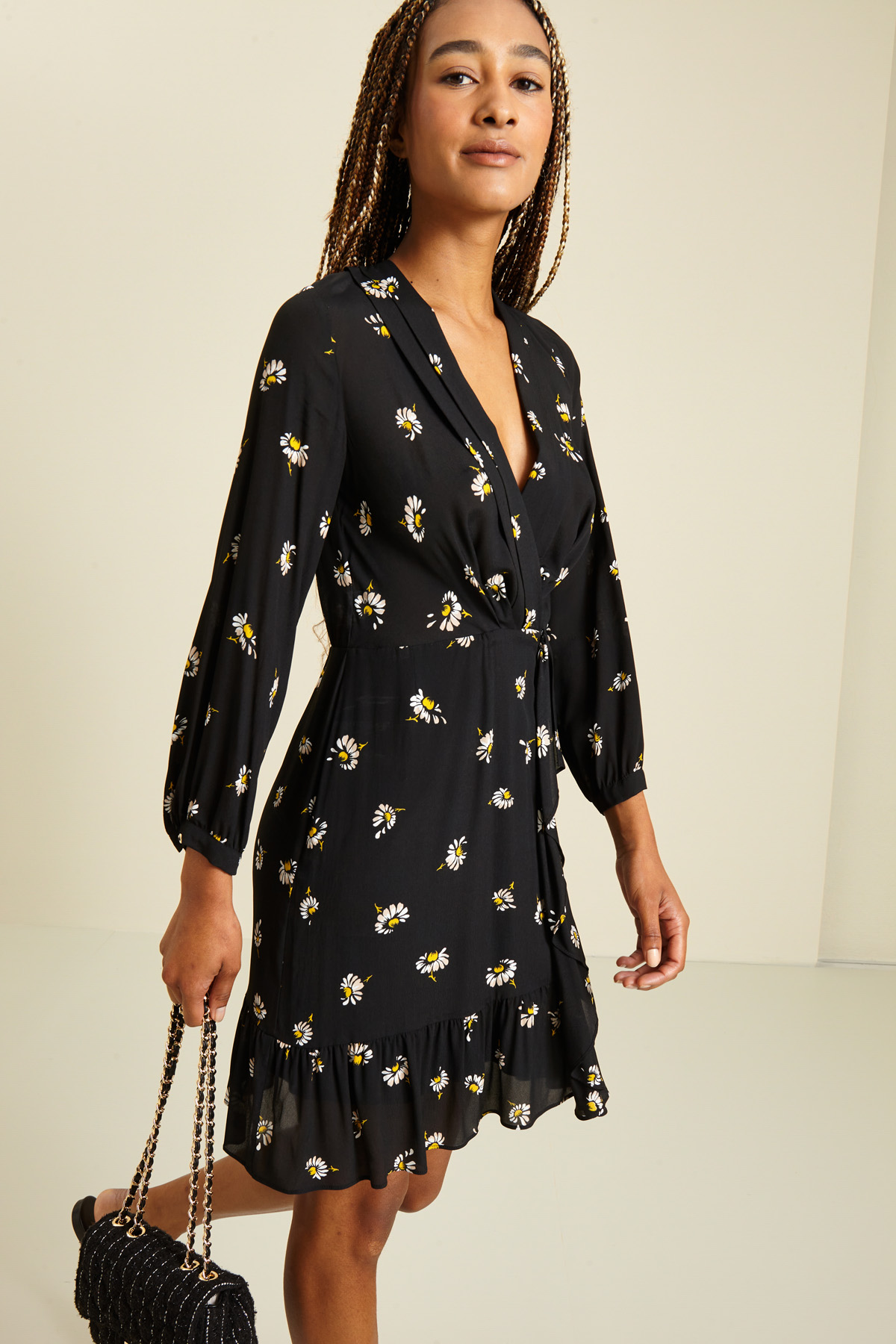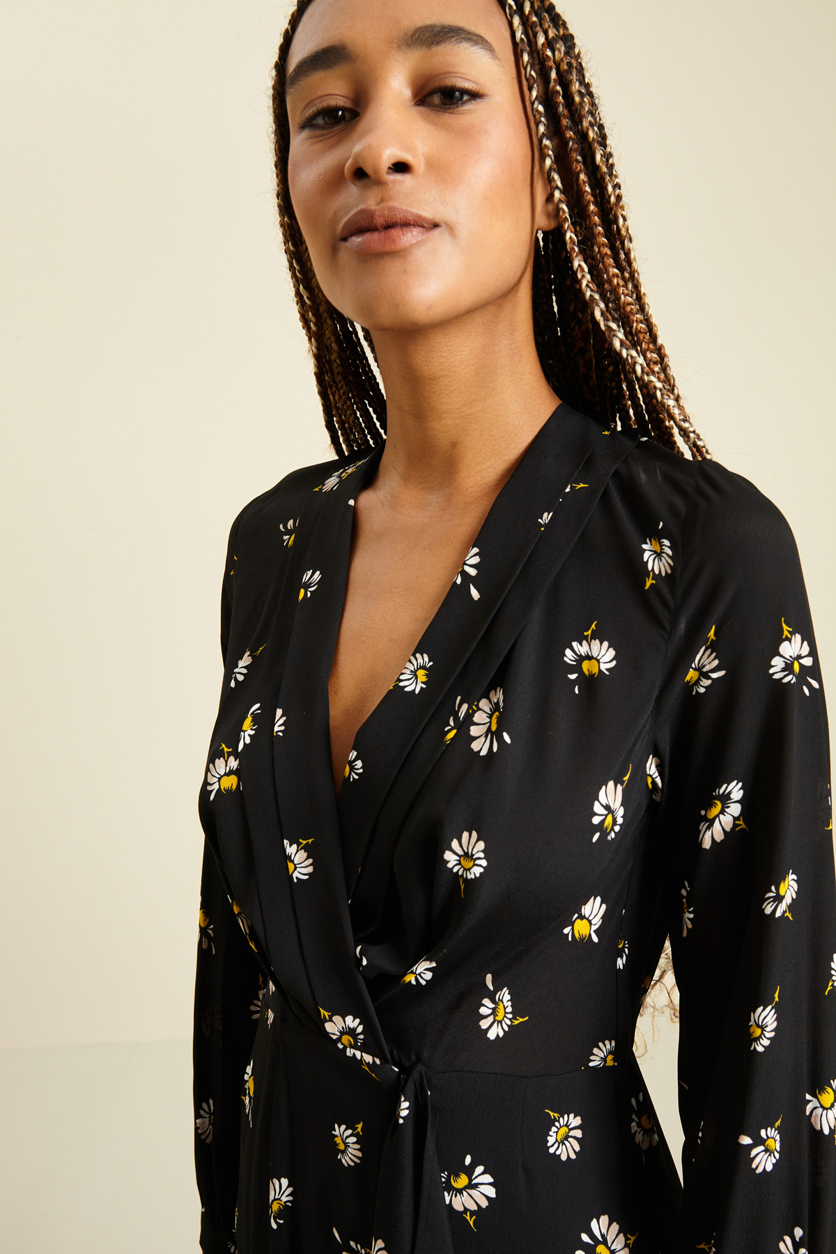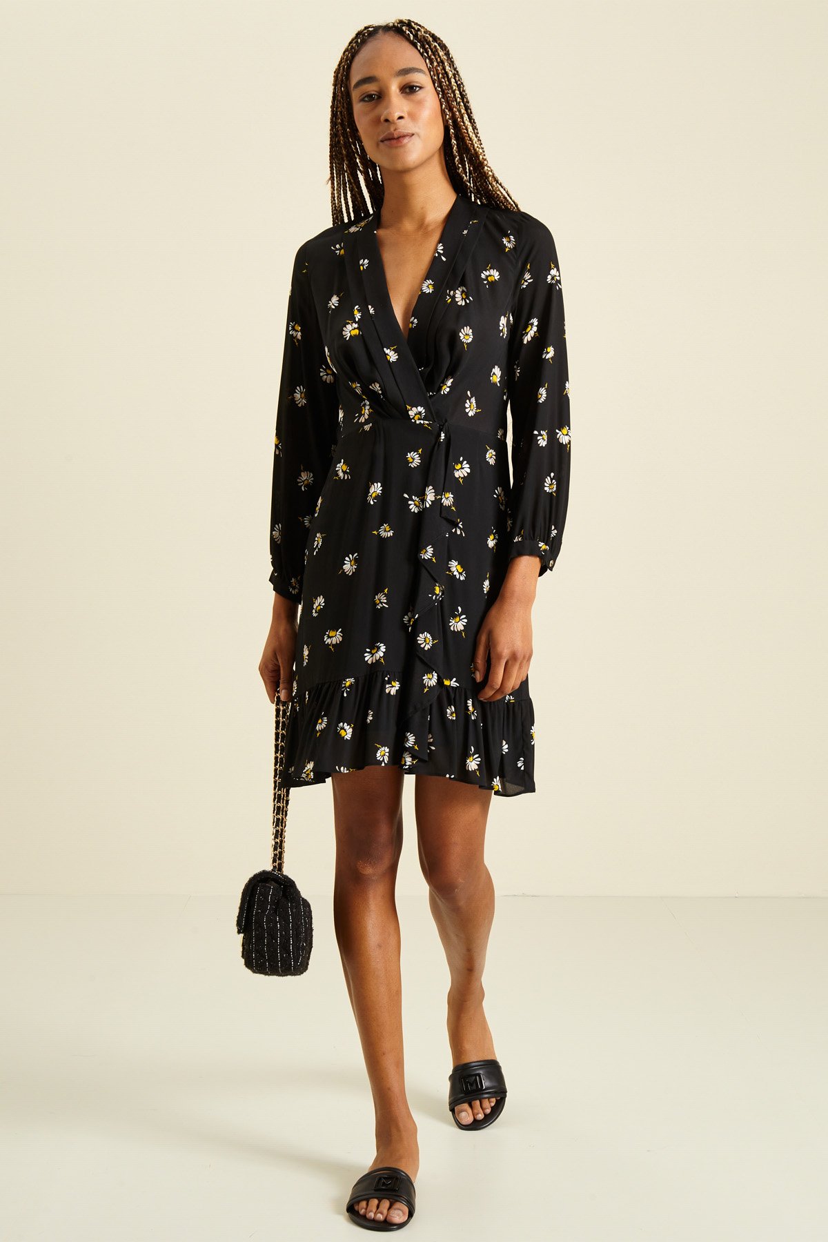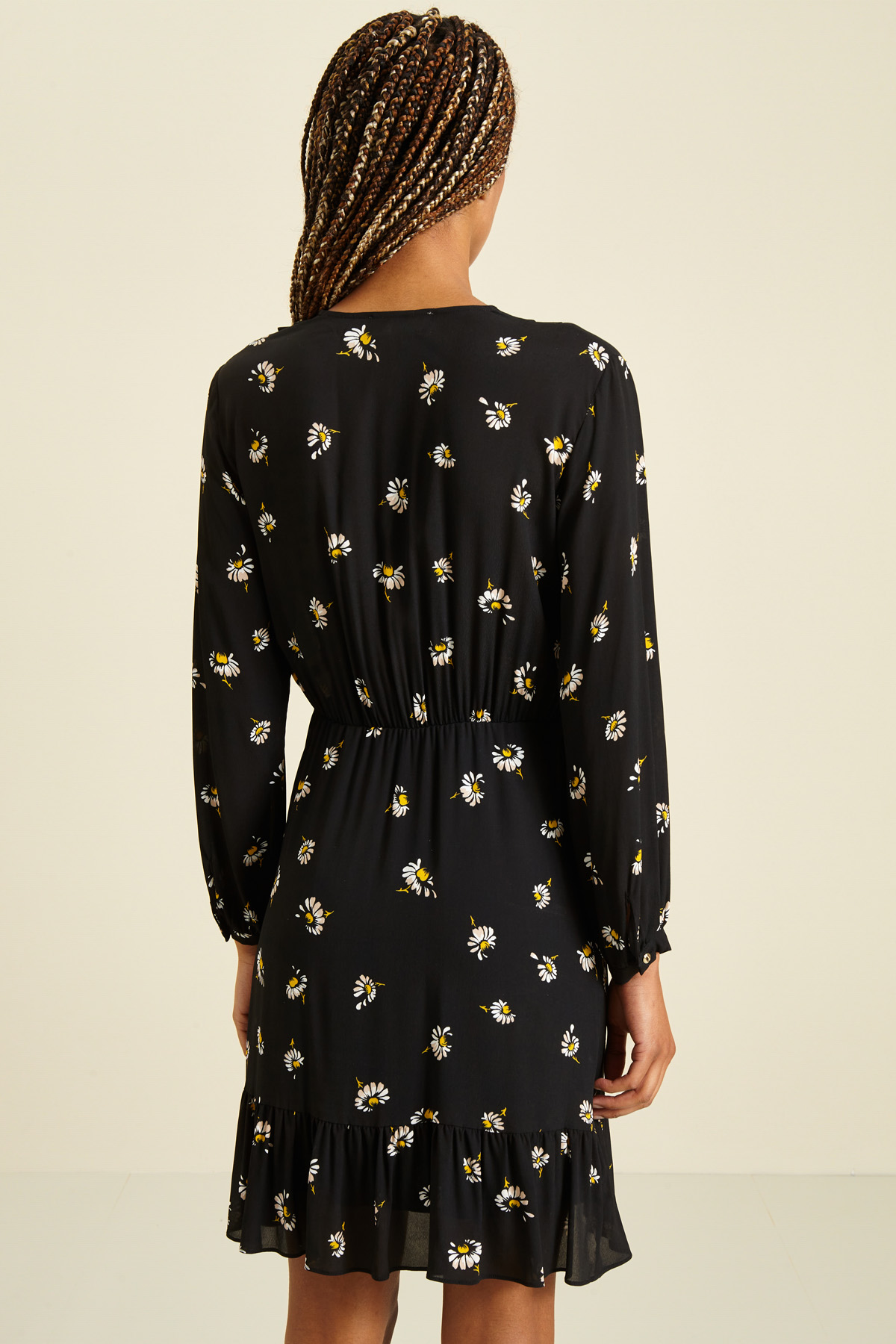Abito corto dalla linea fluida realizzato in crèpe de chine di pura viscosa stampata, scollo a V con pieghe decorative, maniche lunghe con polsino sottile e bottone, inserto elastico in vita, dettaglio di volant e balza sulla gonna e chiusura a finto portafoglio tramite zip invisibile e bottone sul fianco. Semifoderato.