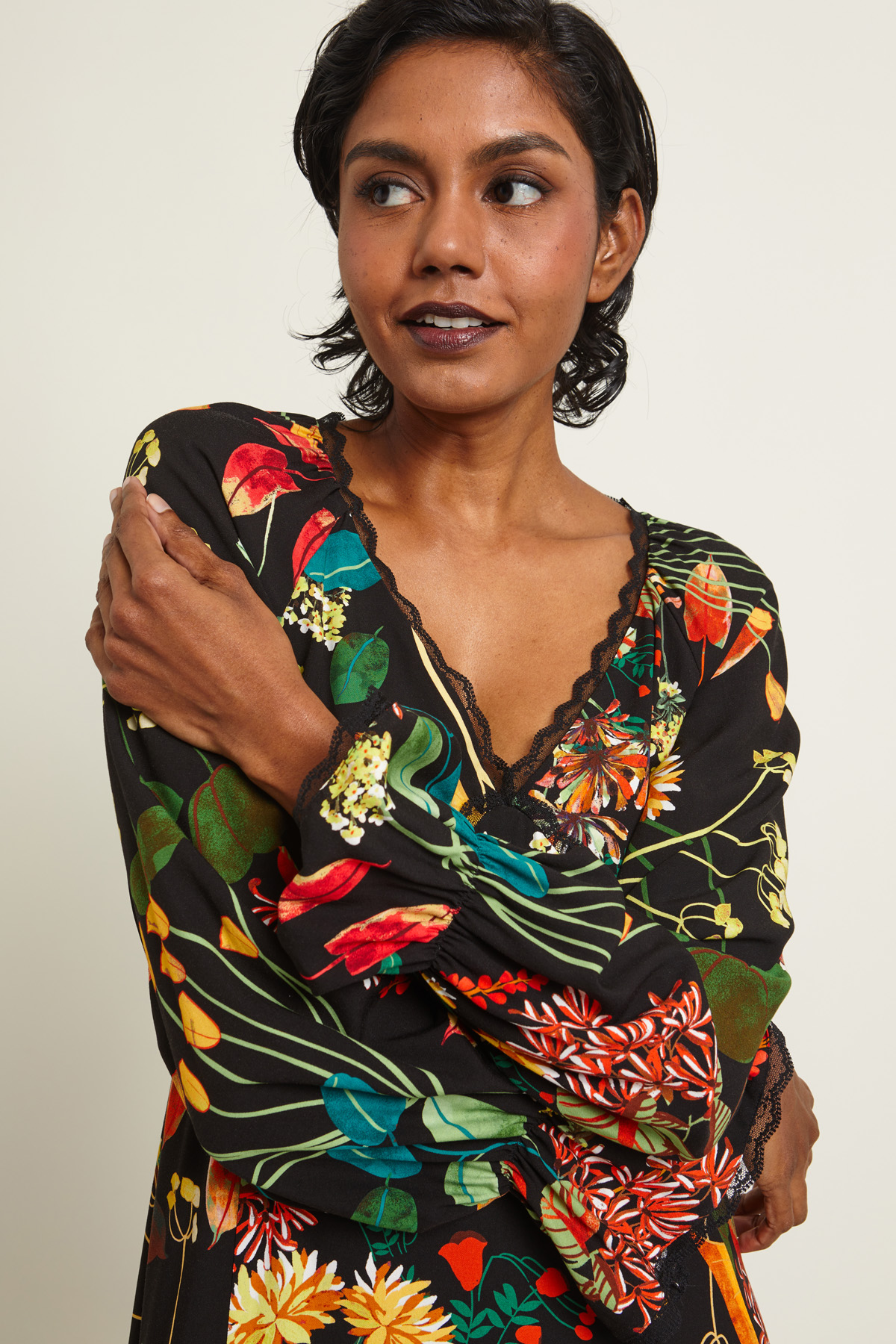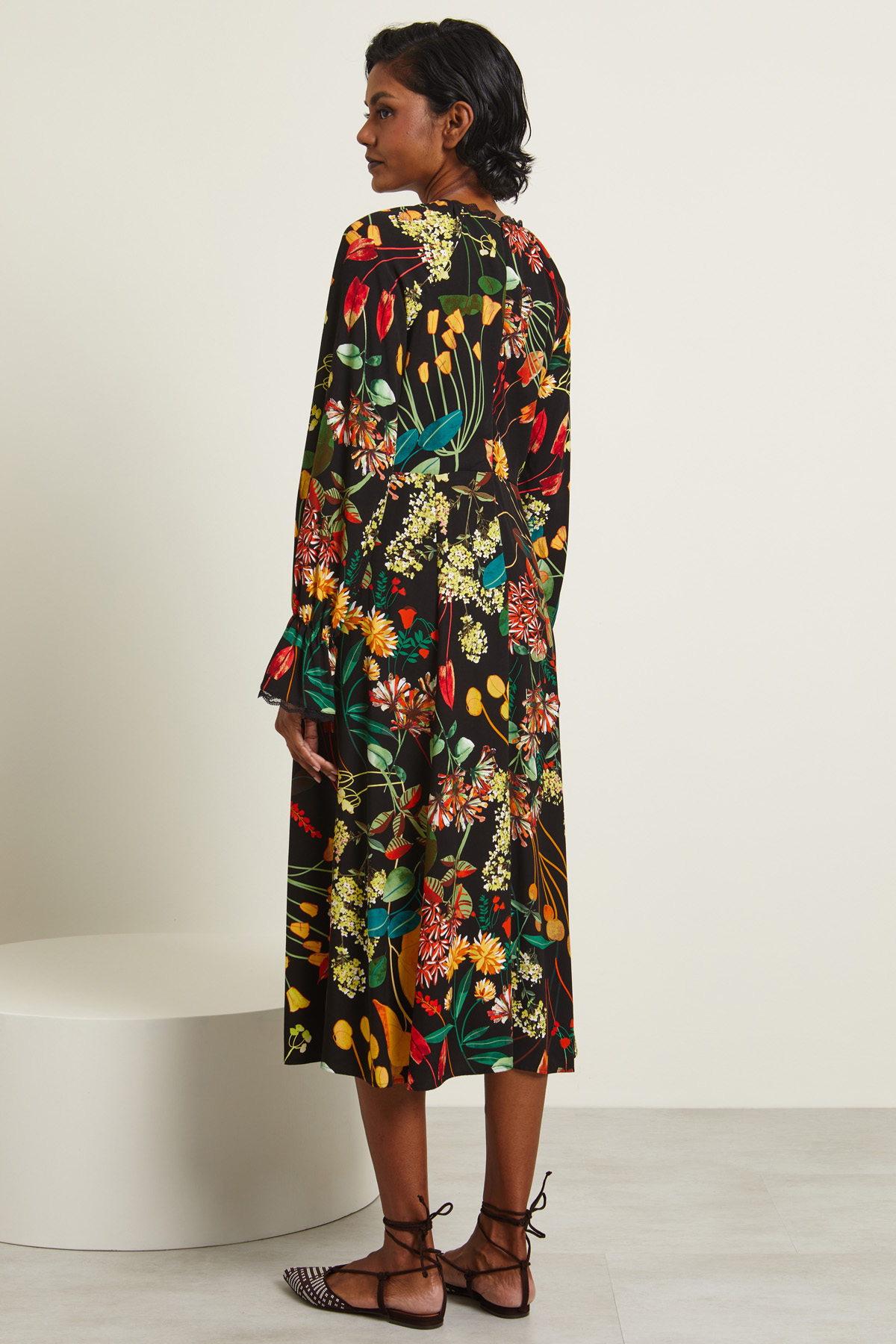 Abito dalla linea fluida realizzato in levantina di viscosa con scollo a V, maniche lunghe raglan con inserto elastico al polso e dettaglio di bordi rifiniti in pizzo. Allacciatura tramite zip invisibile nel retro.