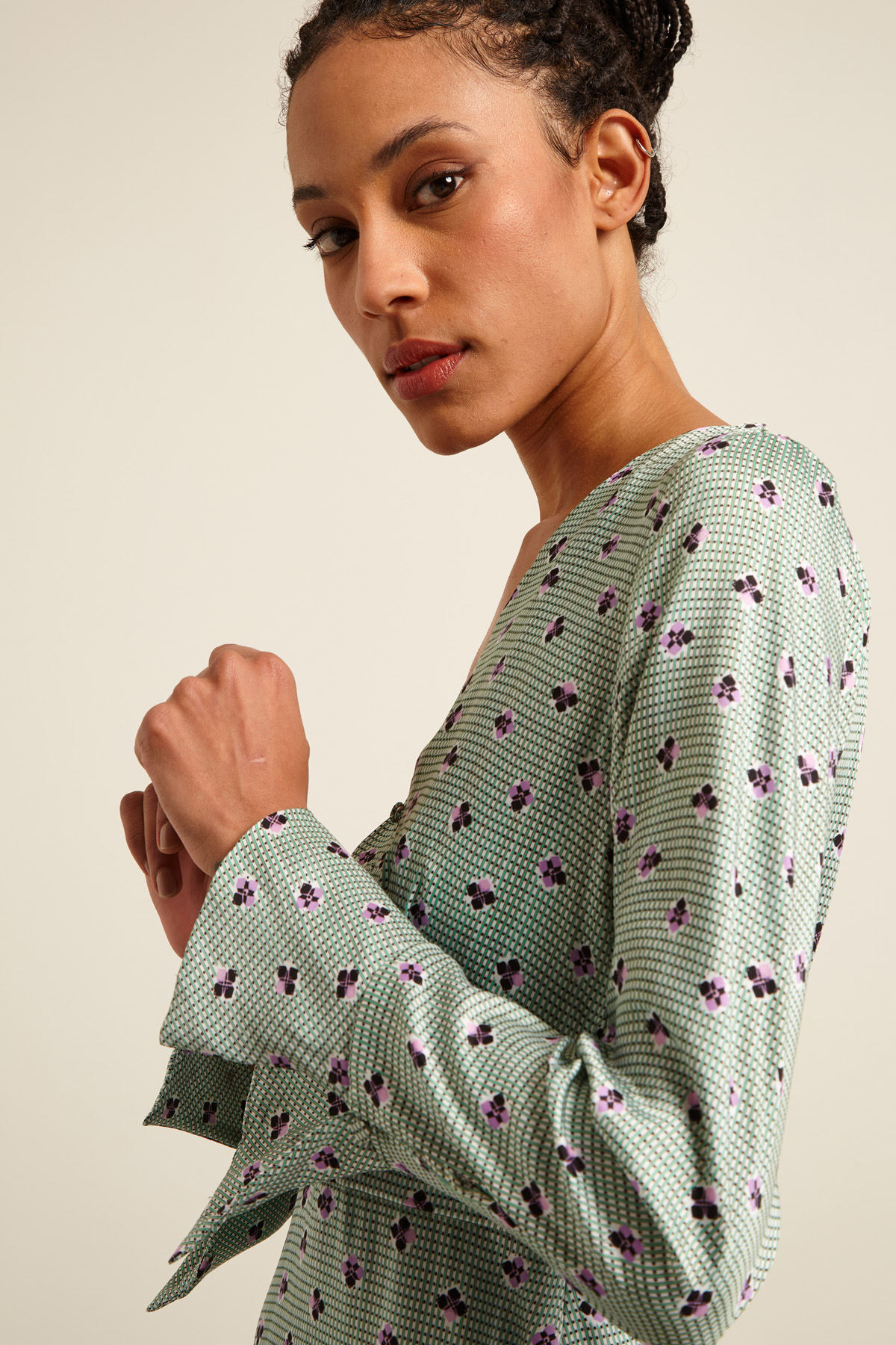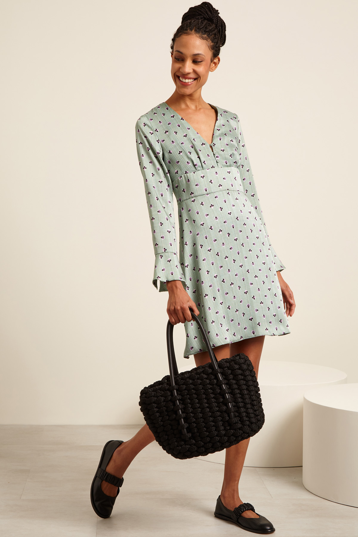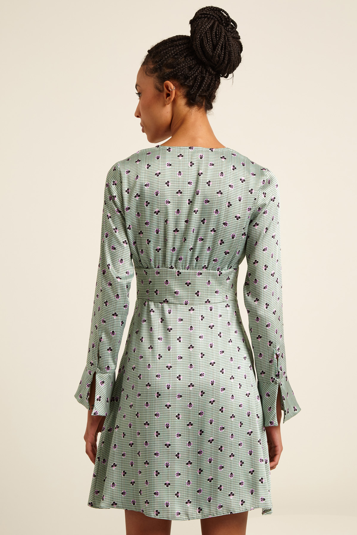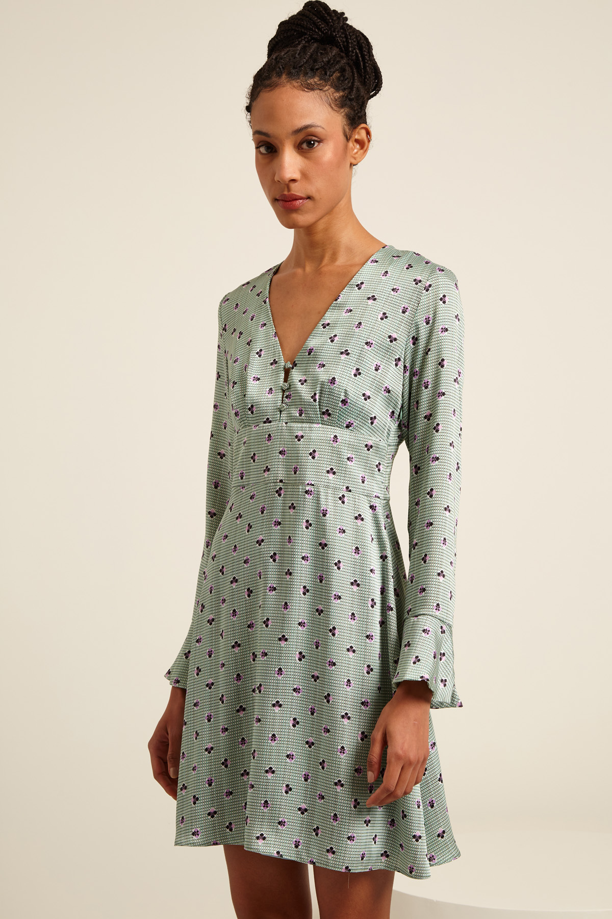 Abito corto dalla linea morbida realizzato in twill stampato con scollo a V e apertura con bottoni ricoperti, maniche lunghe con balza al fondo e taglio in vita. Allacciatura tramite zip invisibile sul fianco. Capo dotato di sottoveste.