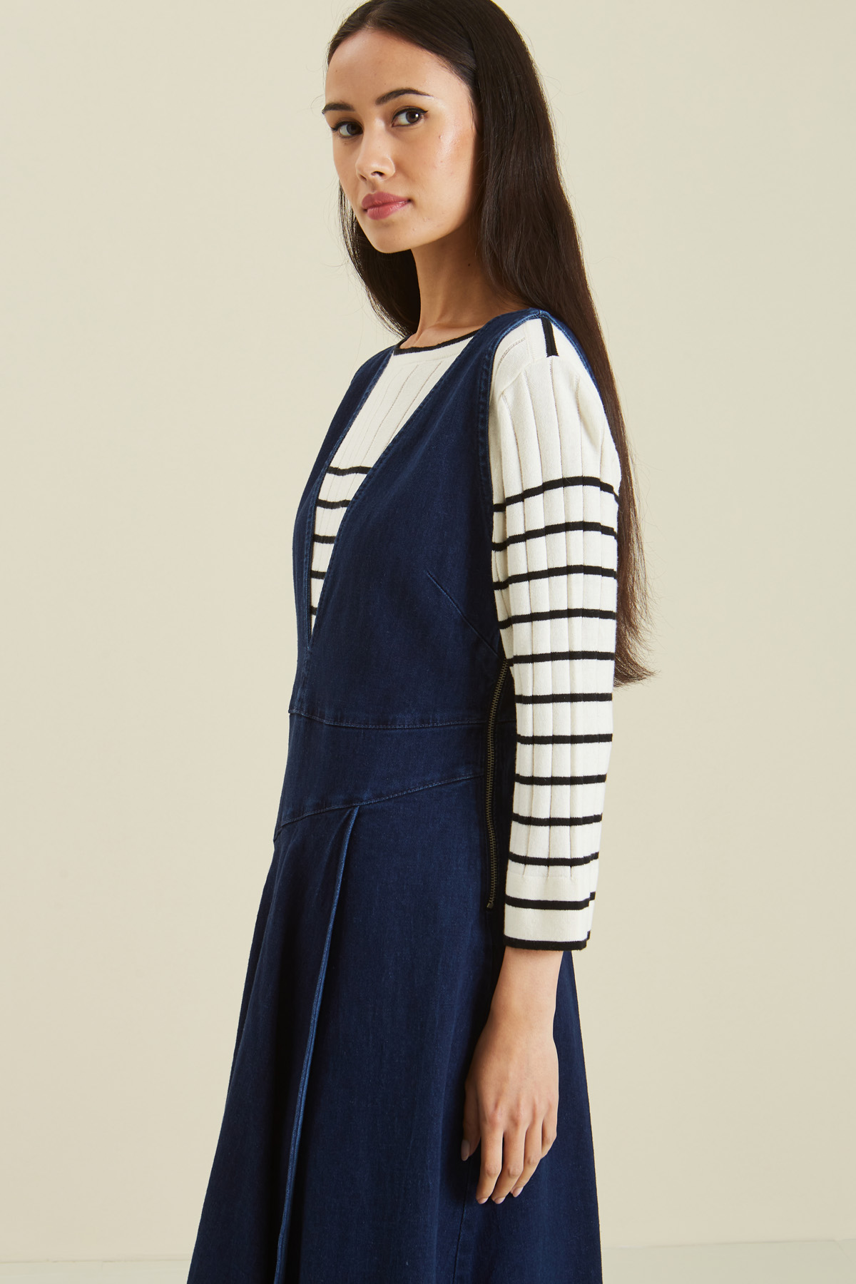 Abito realizzato in denim di puro cotone stretch, composto da top dalla linea sfiancata con profondo scollo a V davanti e dietro, e gonna a finto portafoglio dalla linea svasata. Modello con orlo asimmetrico sfrangiato e chiusura tramite zip laterale.