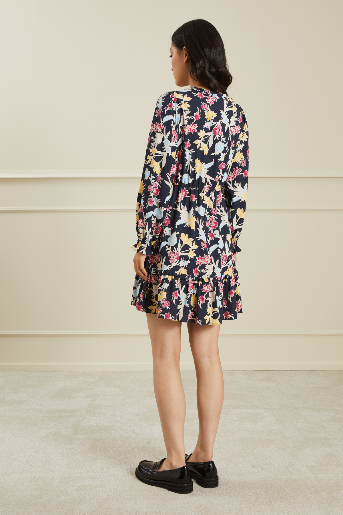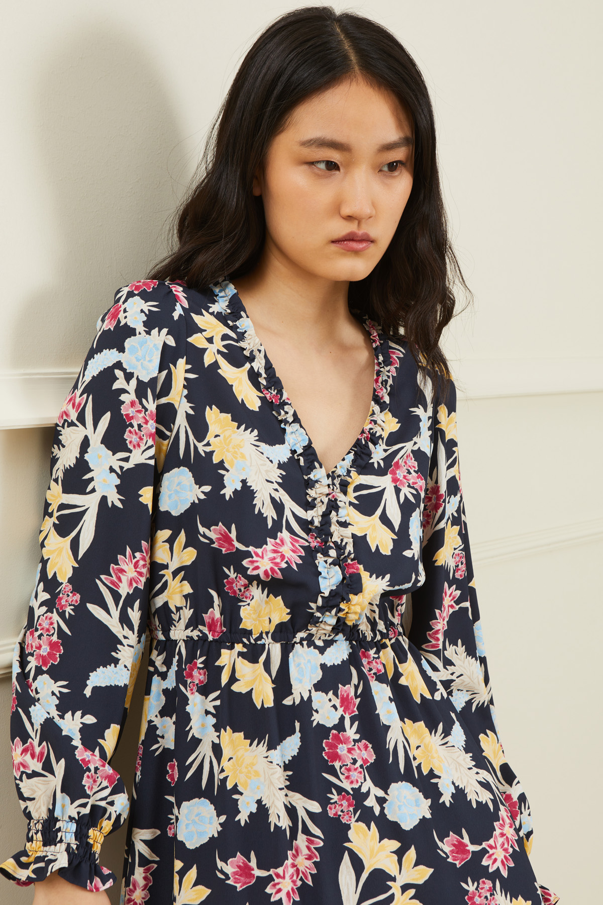 Abito dalla linea svasata realizzato in georgette, con scollo a V rifinito da rouches, inserto elastico in vita, maniche ampie con arricciatura elasticizzata al polso e balza a fondo capo.