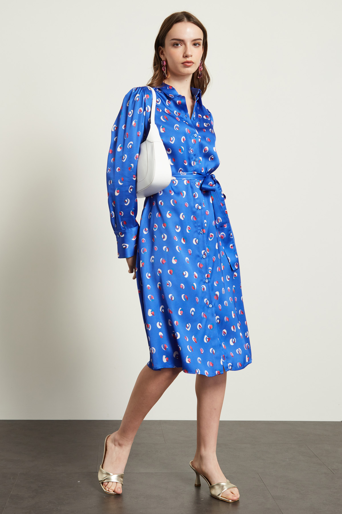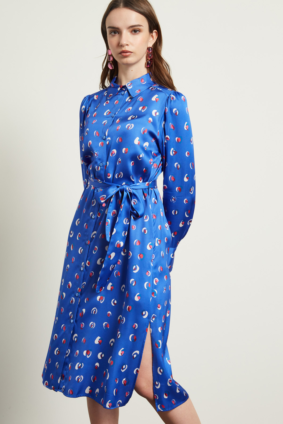 Chemisier dalla linea dritta realizzato in raso di viscosa, con colletto classico, maniche lunghe con polsino alto e bottone, tasche inserite in cucitura e spacchi laterali al fondo. Allacciatura tramite bottoni.