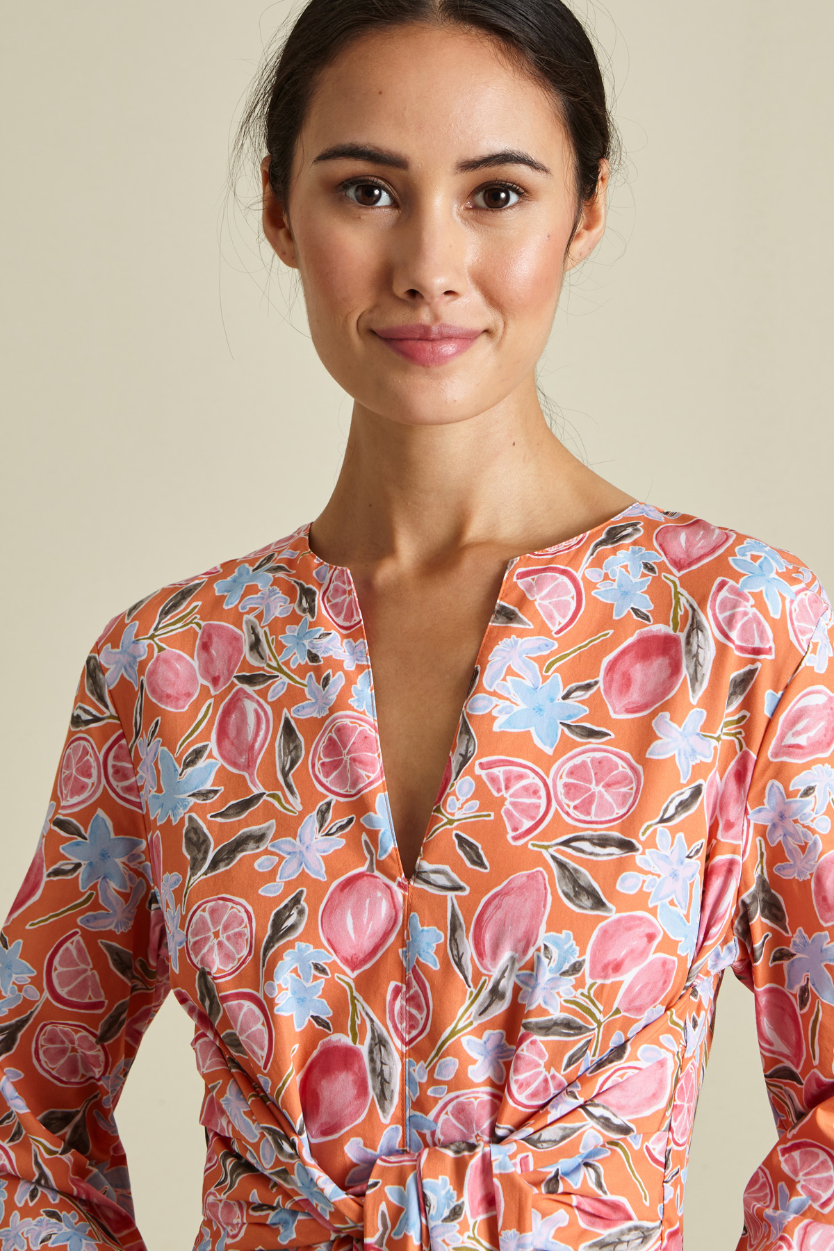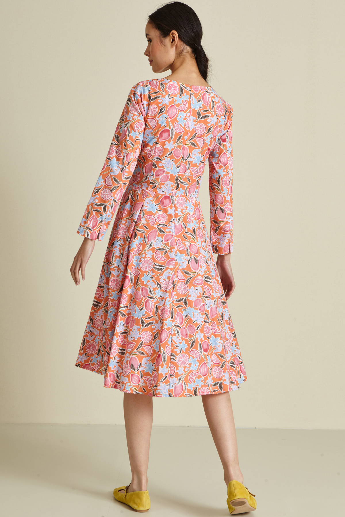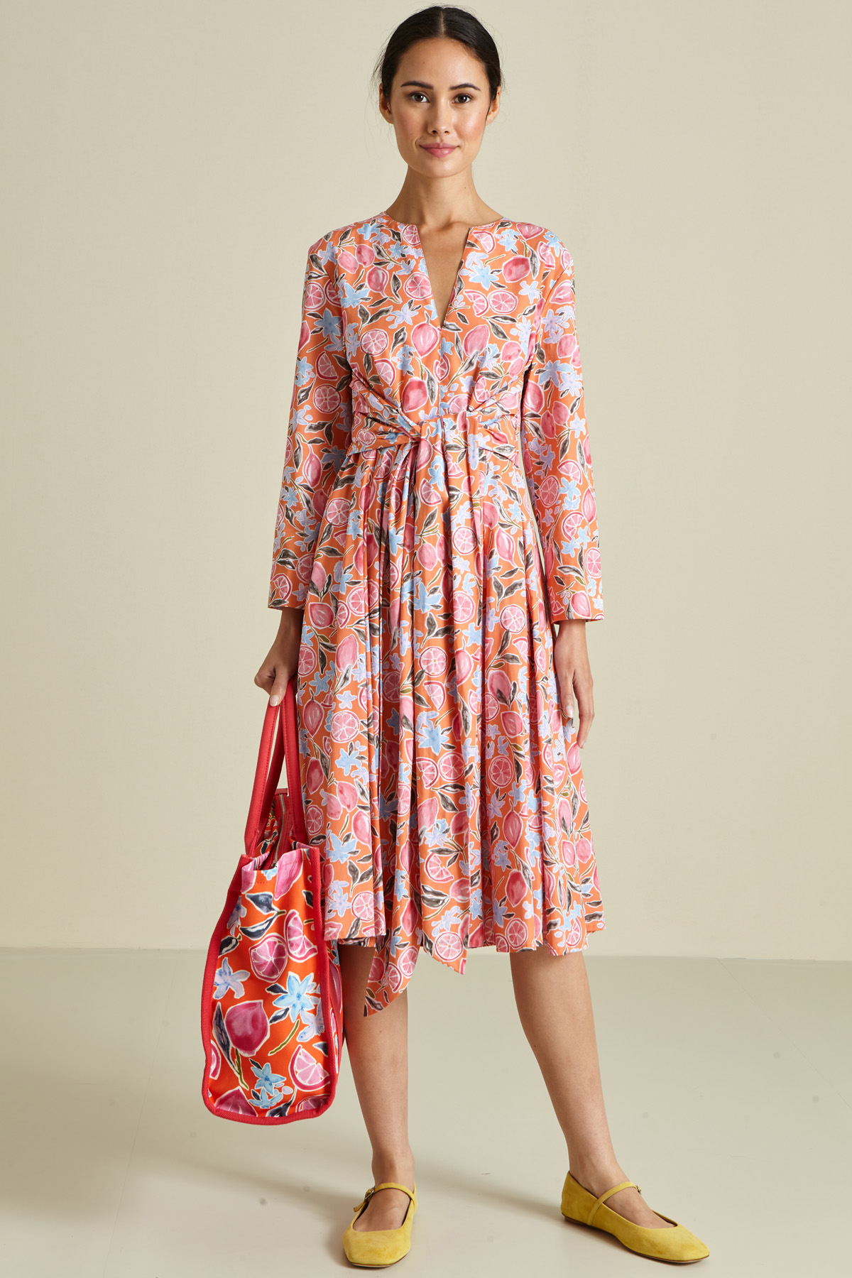 Abito dalla linea stretta in vita realizzato in popeline di puro cotone, con scollo a giro e apertura centrale a V, piccolo spacco a fondo manica, fusciacca cucita da annodate in vita e tasche laterali inserite in cucitura. Capo con chiusura tramite zip invisibile dietro.