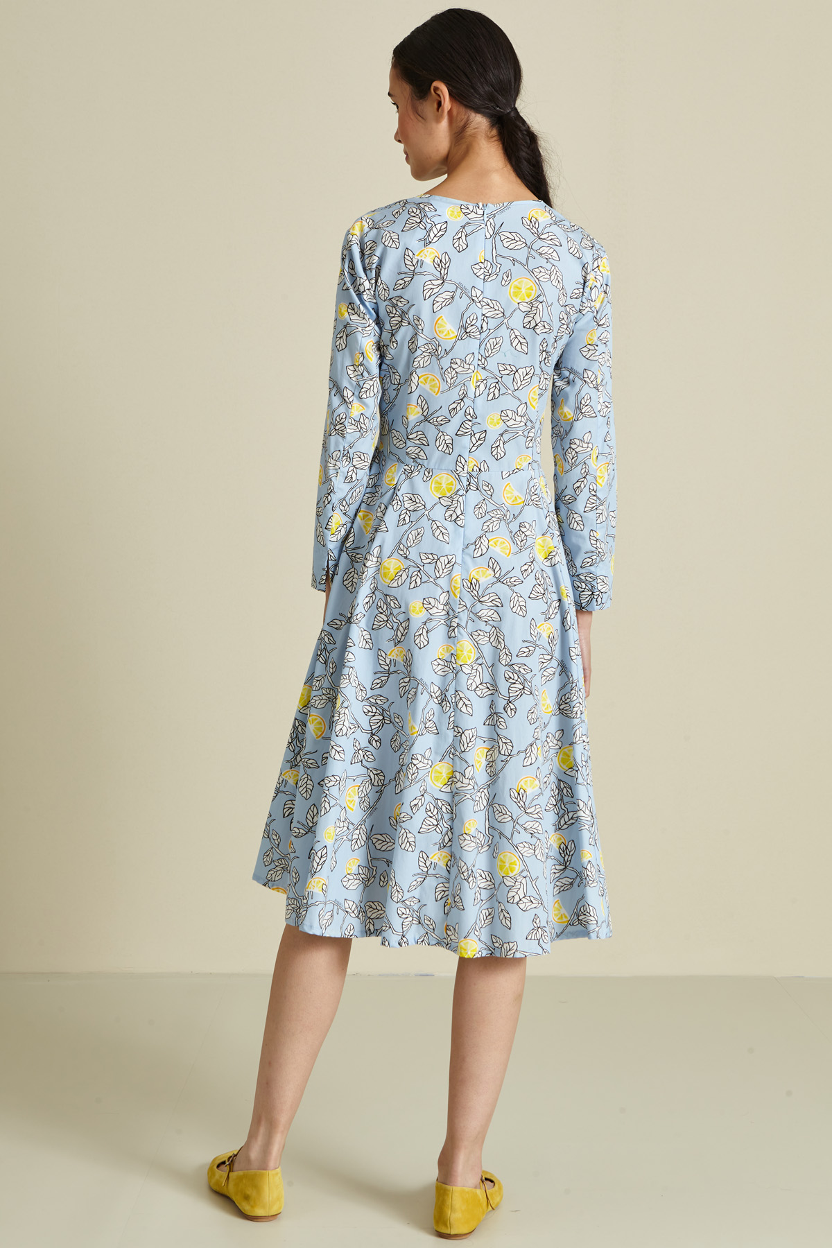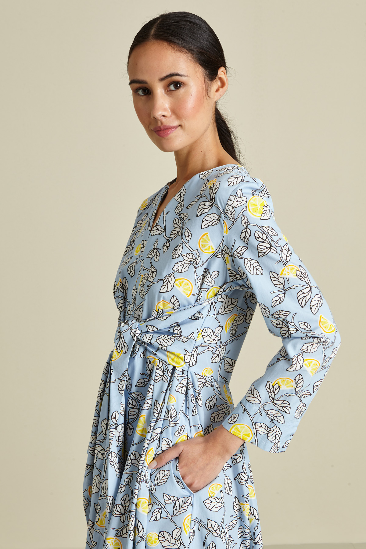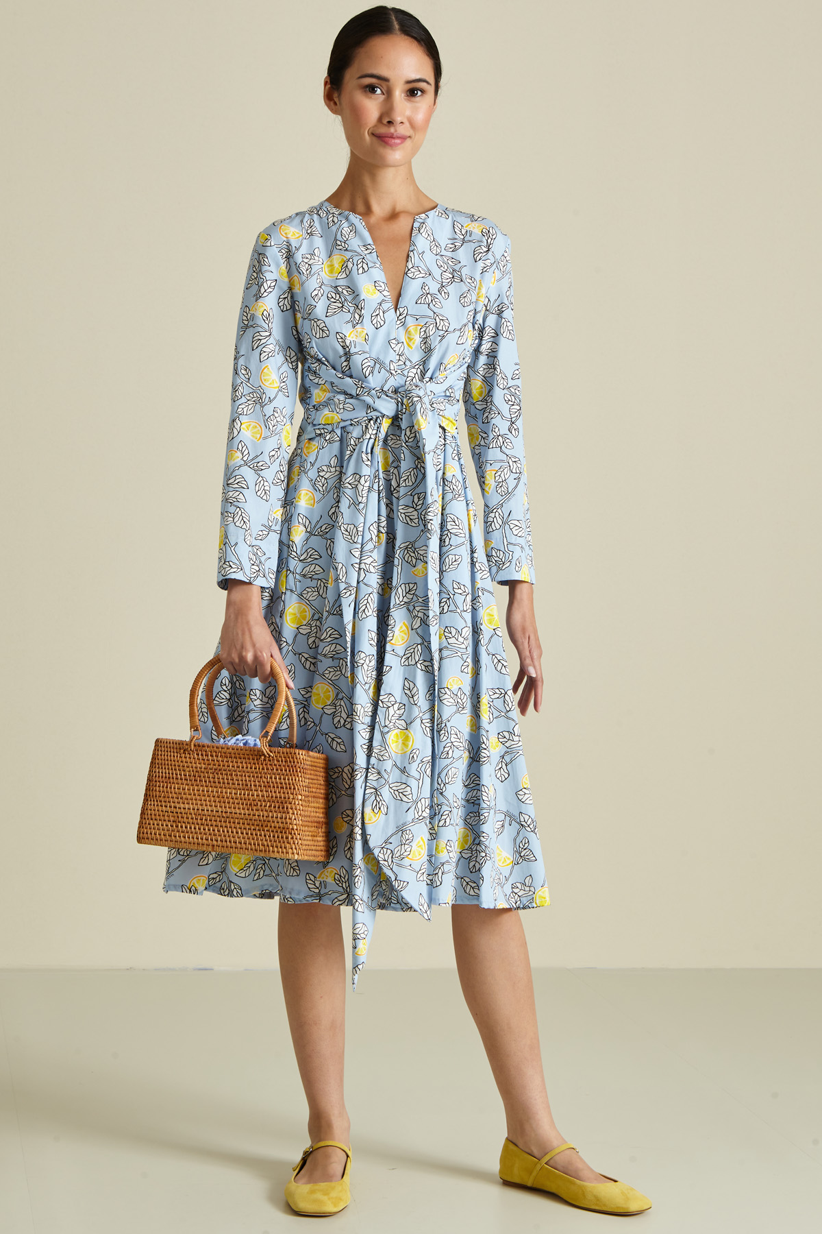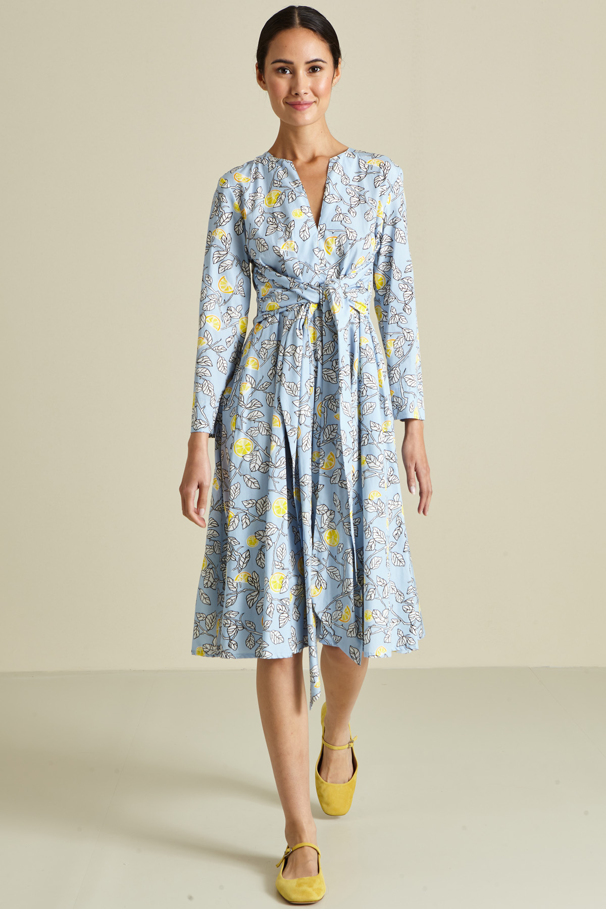 Abito dalla linea stretta in vita realizzato in popeline di puro cotone, con scollo a giro e apertura centrale a V, piccolo spacco a fondo manica, fusciacca cucita da annodate in vita e tasche laterali inserite in cucitura. Capo con chiusura tramite zip invisibile dietro.