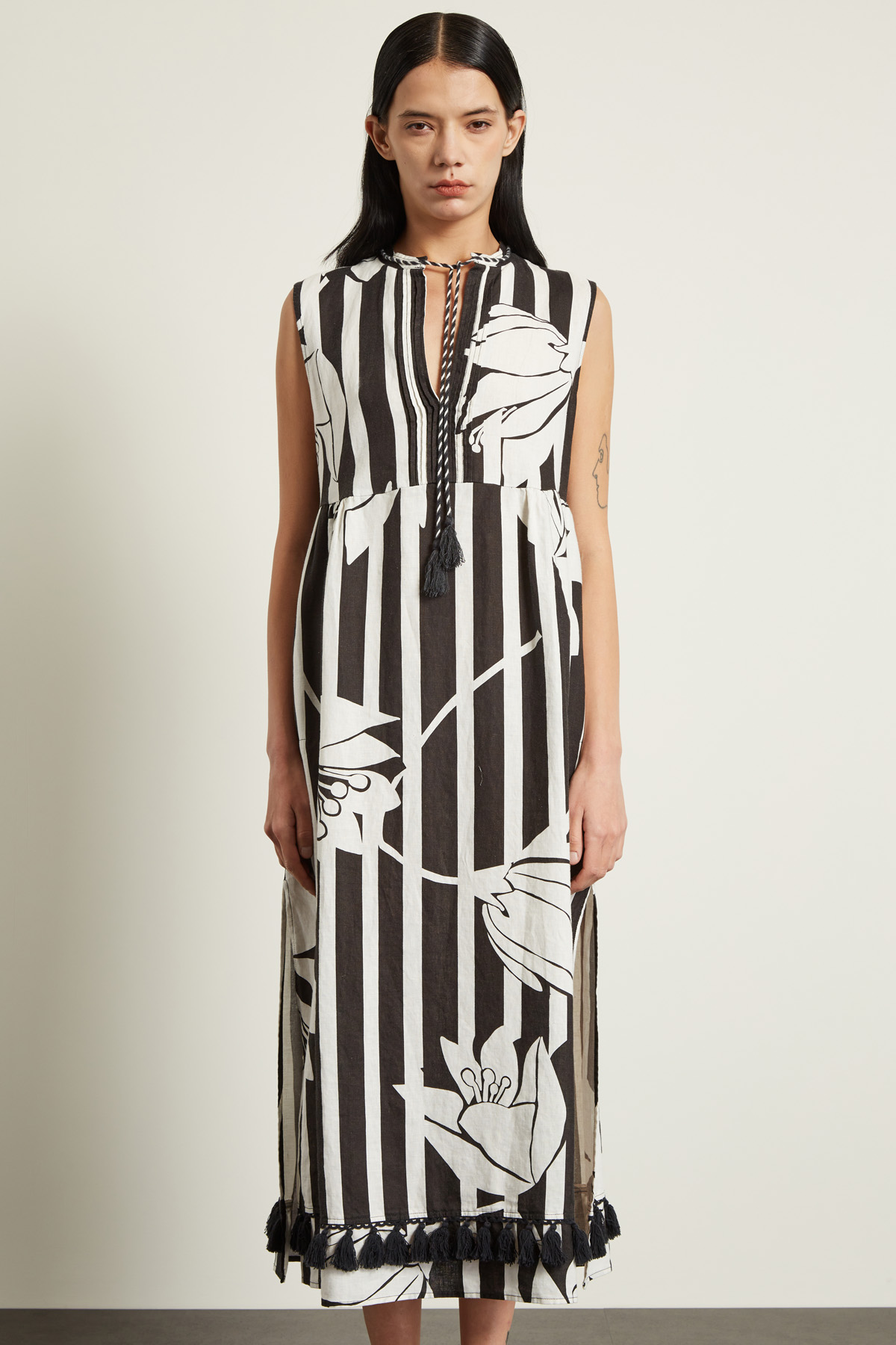 Abito smanicato longuette dalla linea svasata realizzato in tela di puro lino, con scollo a giro rifinito con cordini da annodare e apertura a goccia, dettaglio di pieghe cucite sul davanti e tasche laterali inserite in cucitura. Motivo di nappine al fondo e spacchi laterali.