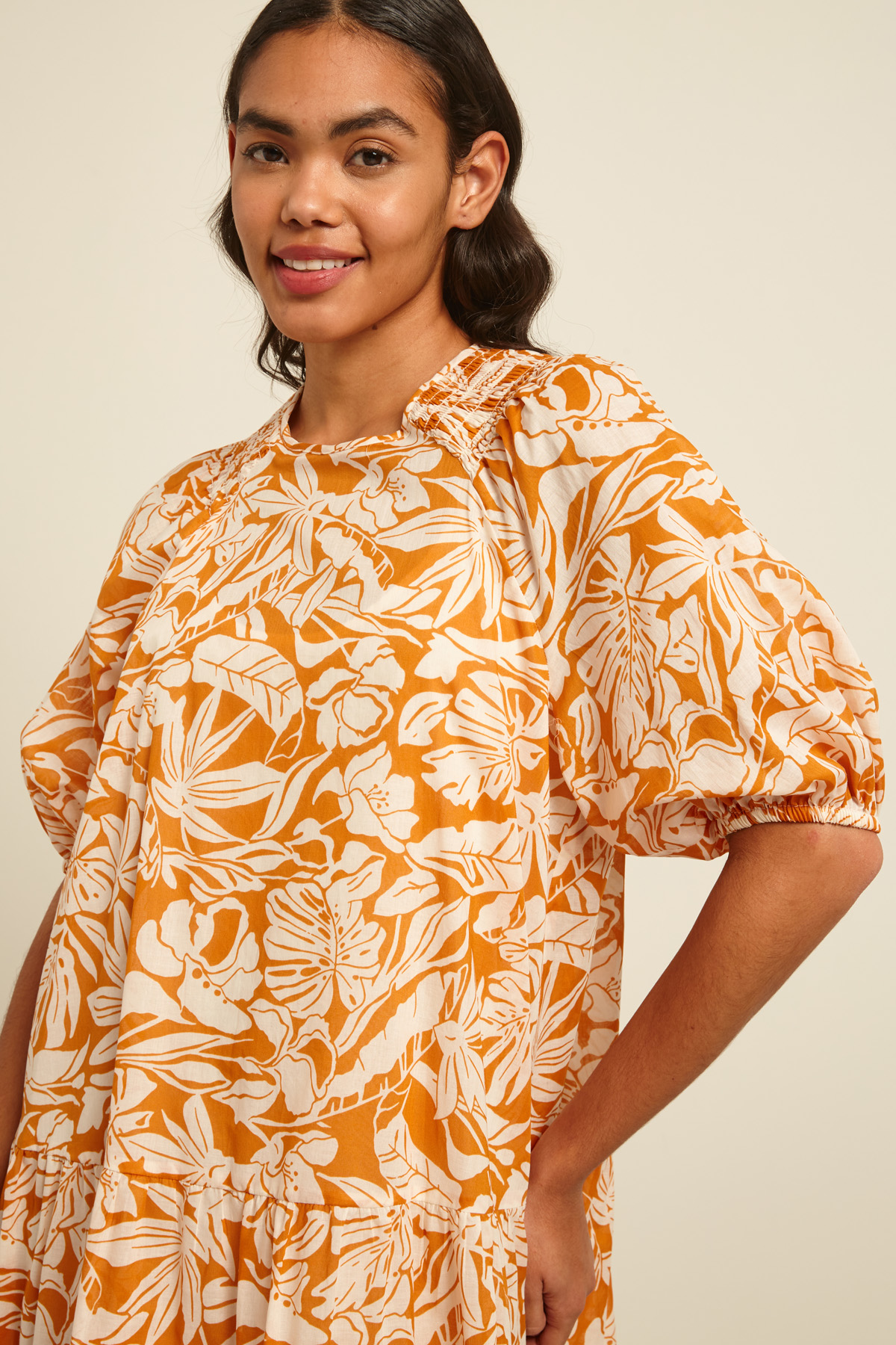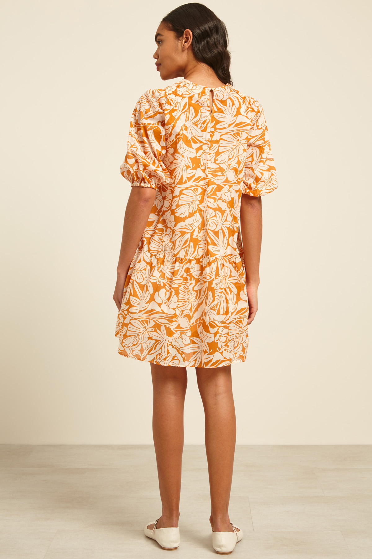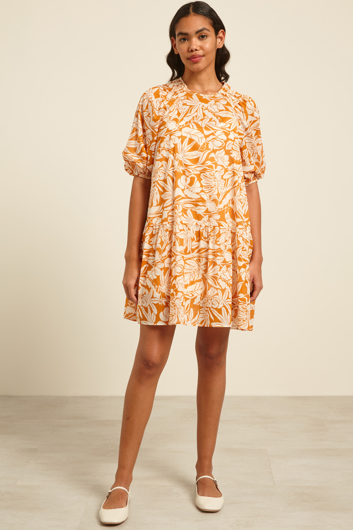 Abito corto a grembiule realizzato in mussola di puro cotone stampato, con scollo a giro, arricciatura elastica sulle spalle, maniche corte raglan a palloncino con inserto elastico al fondo, balza a fondo capo e apertura a goccia con bottone nel retro. Capo dotato di sottoveste in abbinamento.