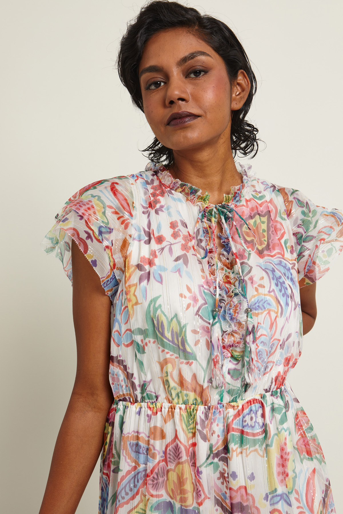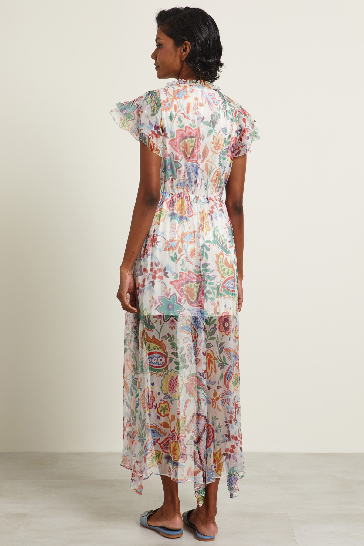 Etereo l'abito lungo in chiffon di pura seta con disegno gessato lamé e stampa paisley floreale. Ha le maniche a farfalla con orli a micro dentelli, lo scollo profilato di piccole ruches e lacci e nappine sfrangiate. Taglio morbido con arricciatura elastica in vita, foderato.