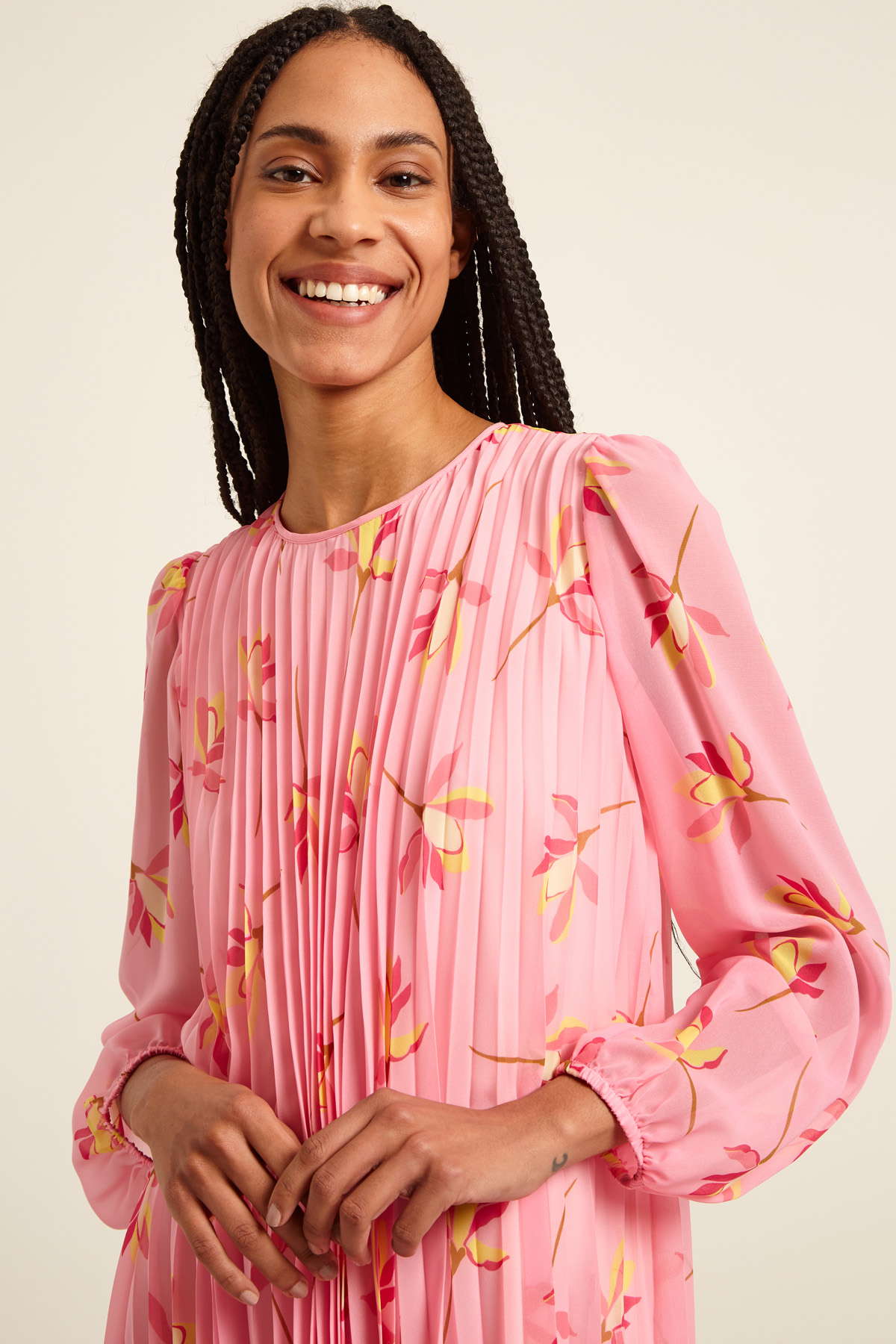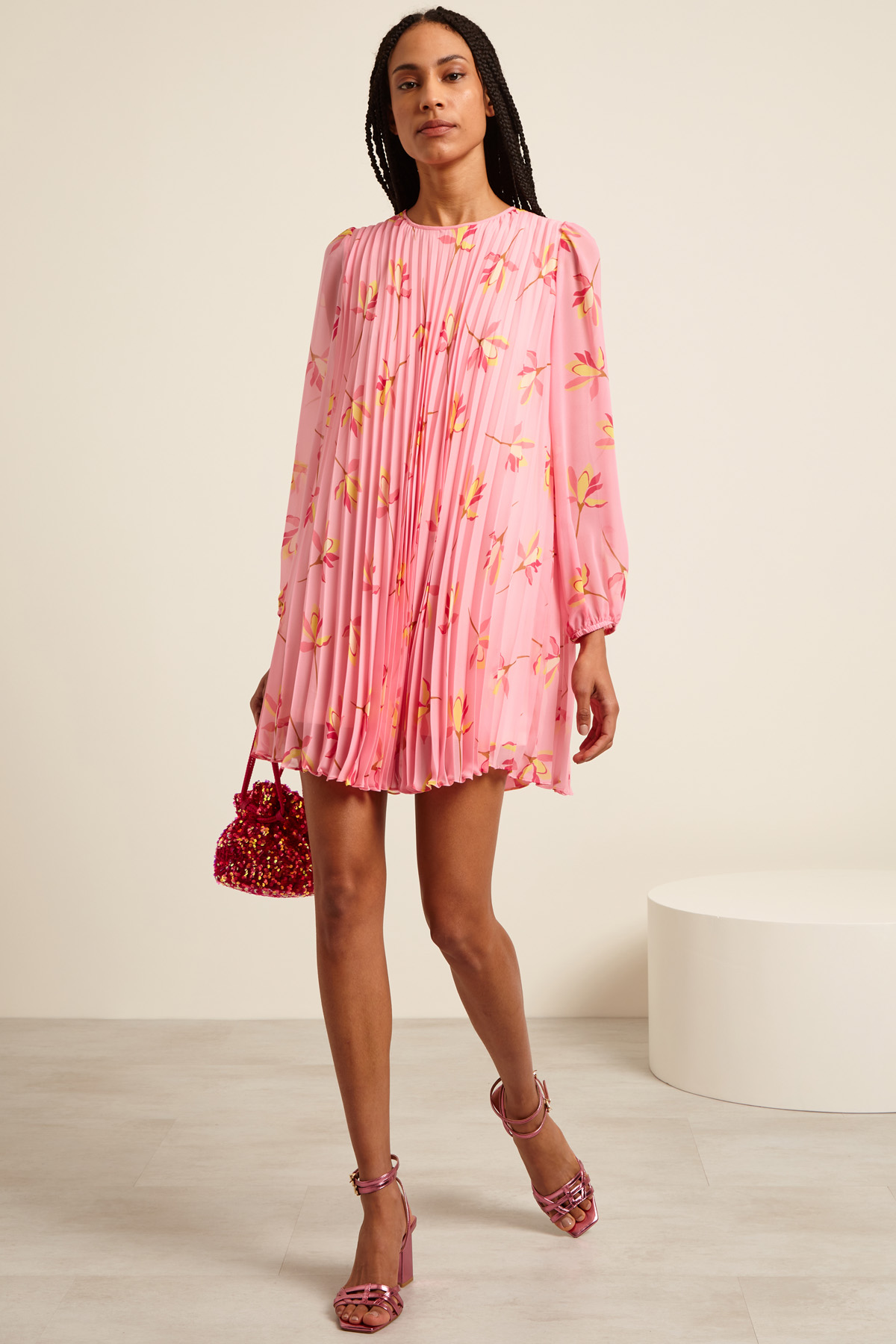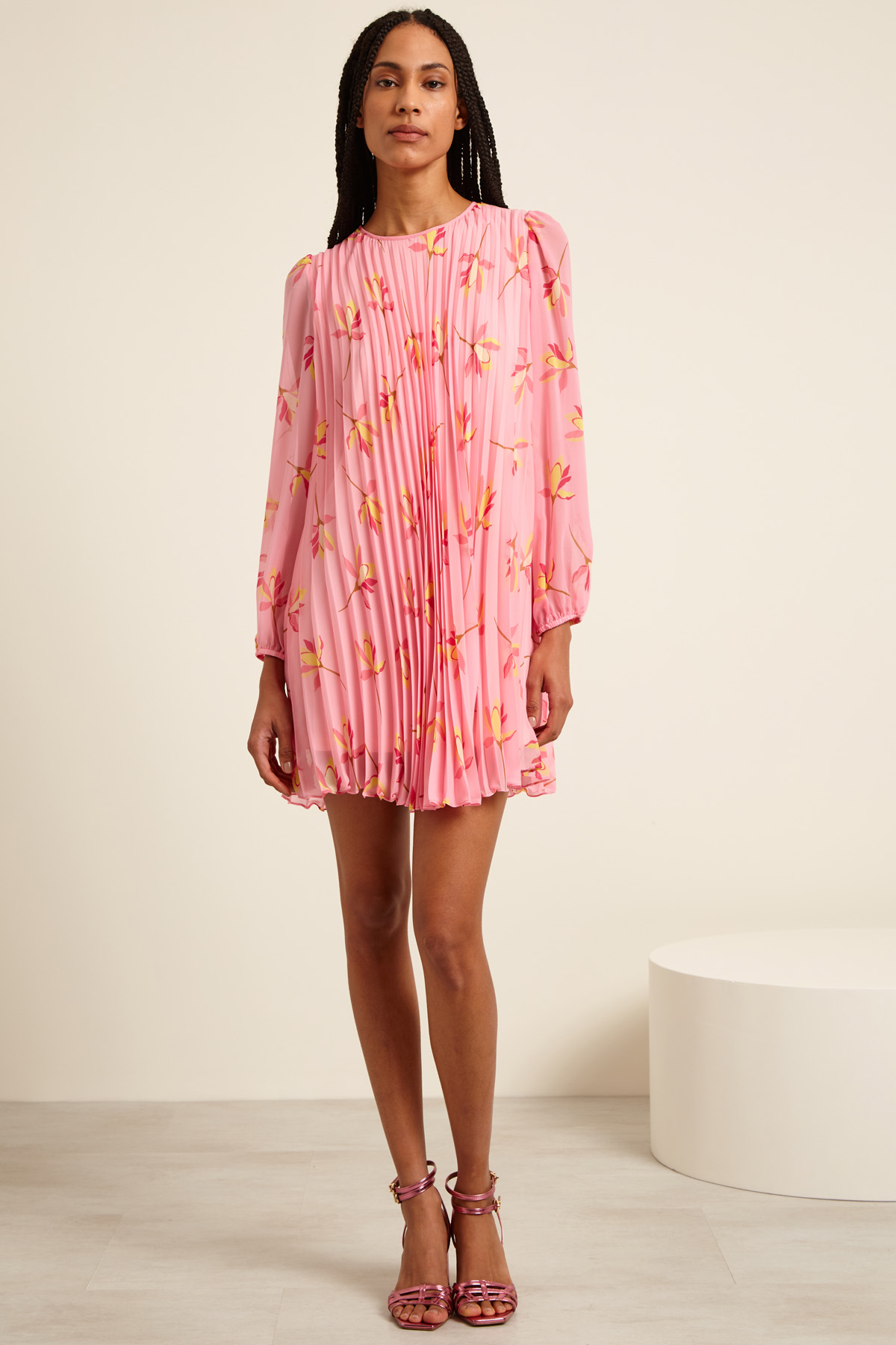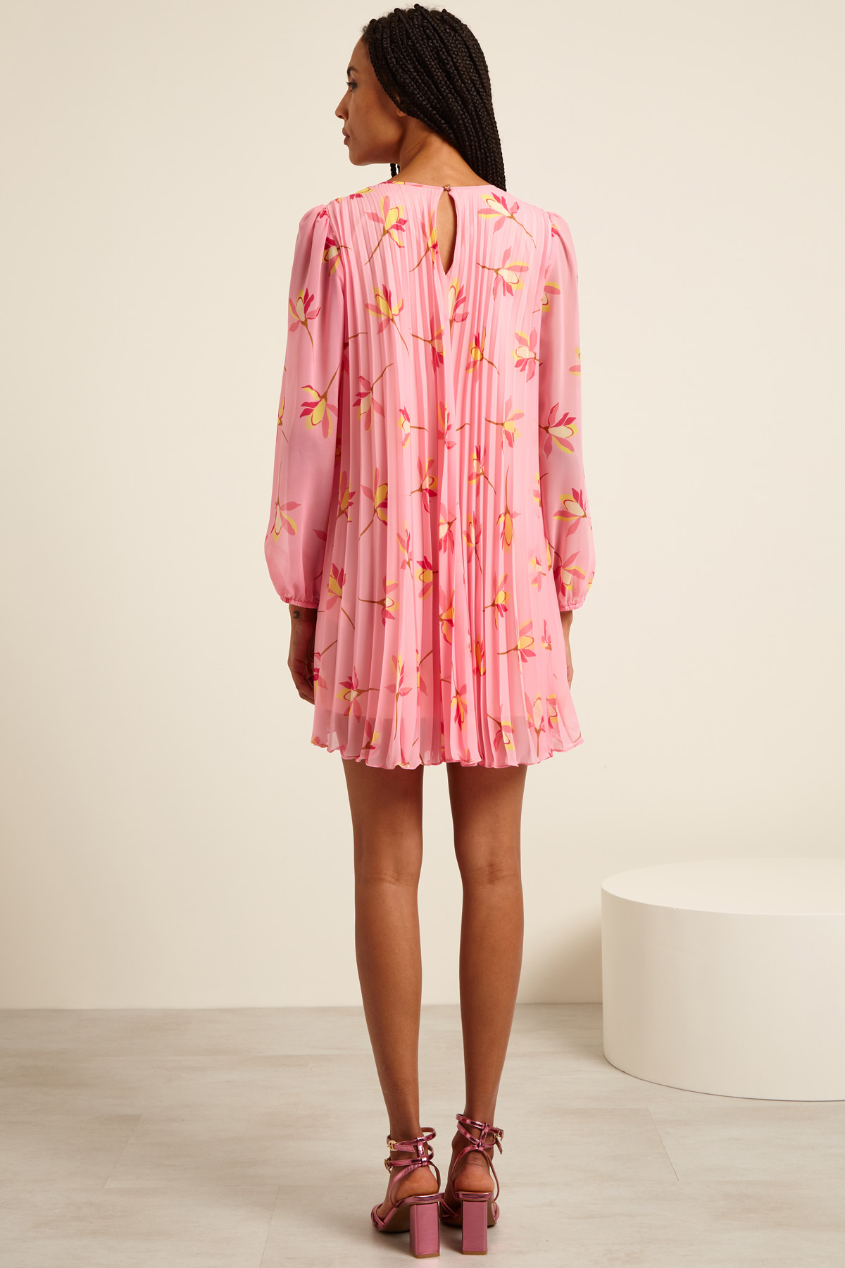 Abito corto dalla linea morbida realizzato in chiffon con lavorazione plissè, scollo a giro con apertura a goccia nel retro e maniche lunghe con inserto elastico al polso. Foderato.