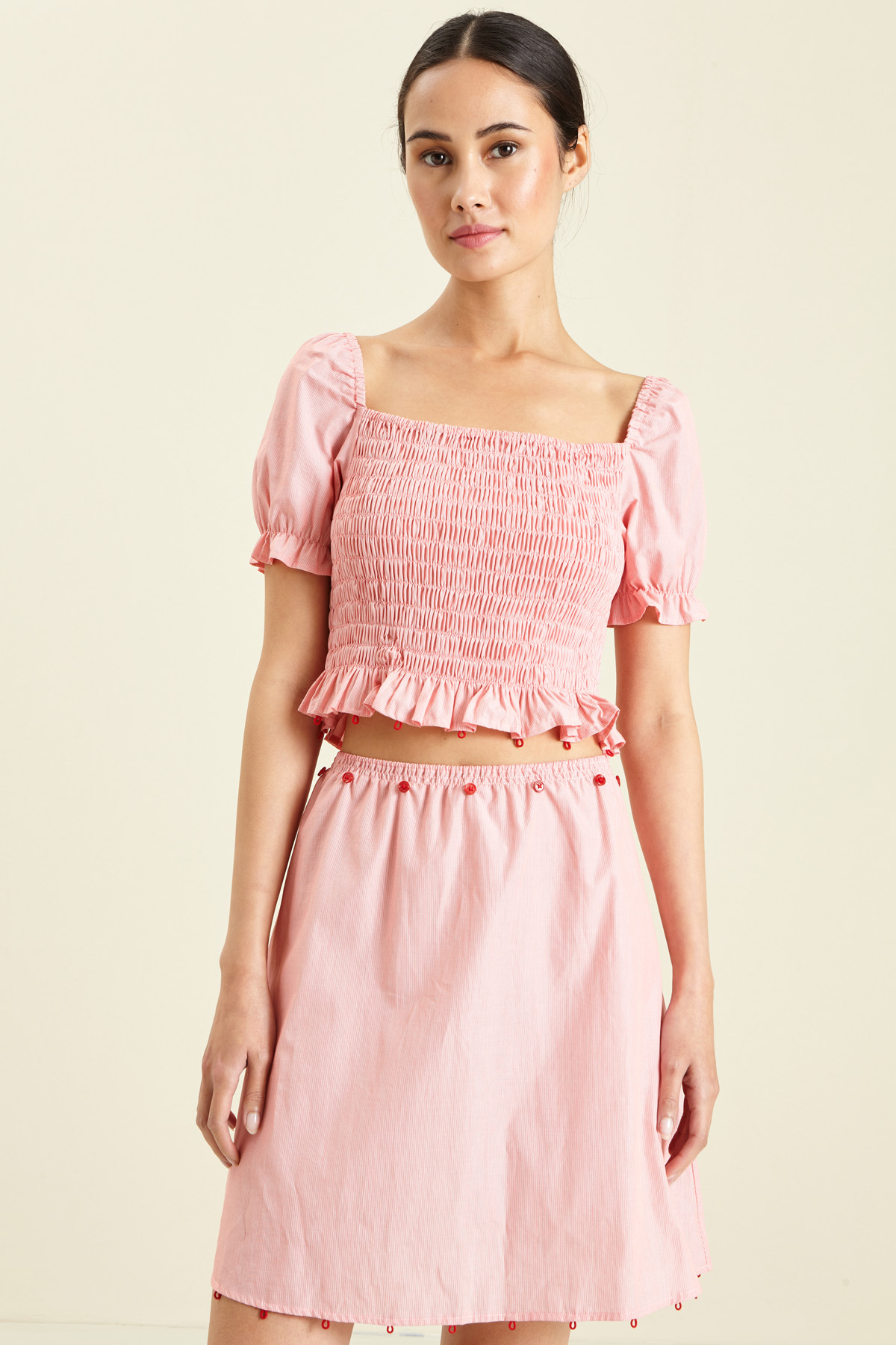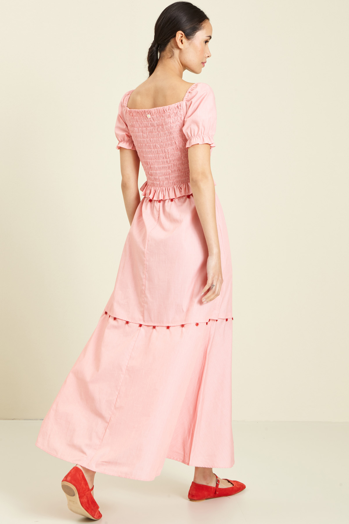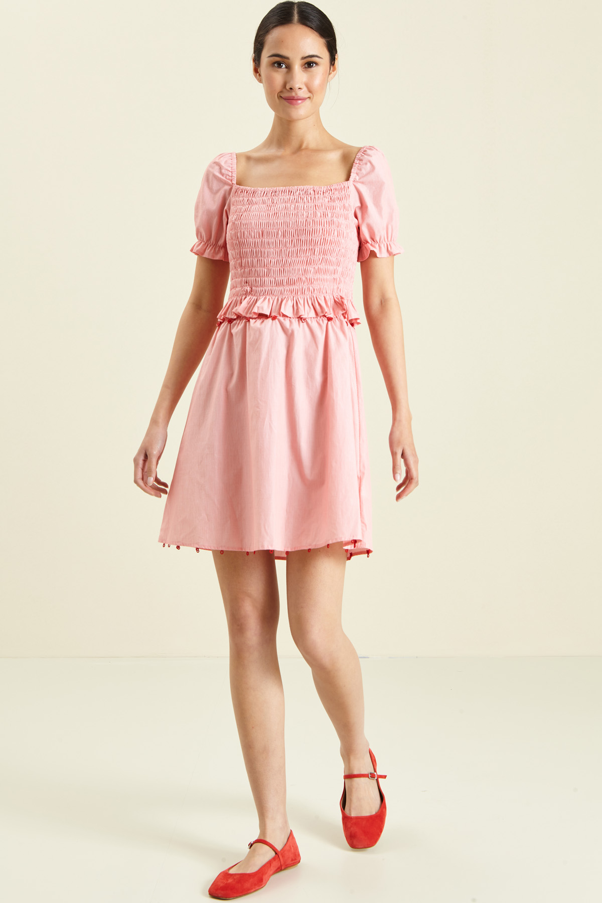 Abito dalla linea svasata realizzato in popeline di cotone, con scollo quadrato, maniche a sbuffo, inserto elastico sul giromanica, arricciatura elastica sul top e dettaglio di bottoni per modificare la lunghezza.
