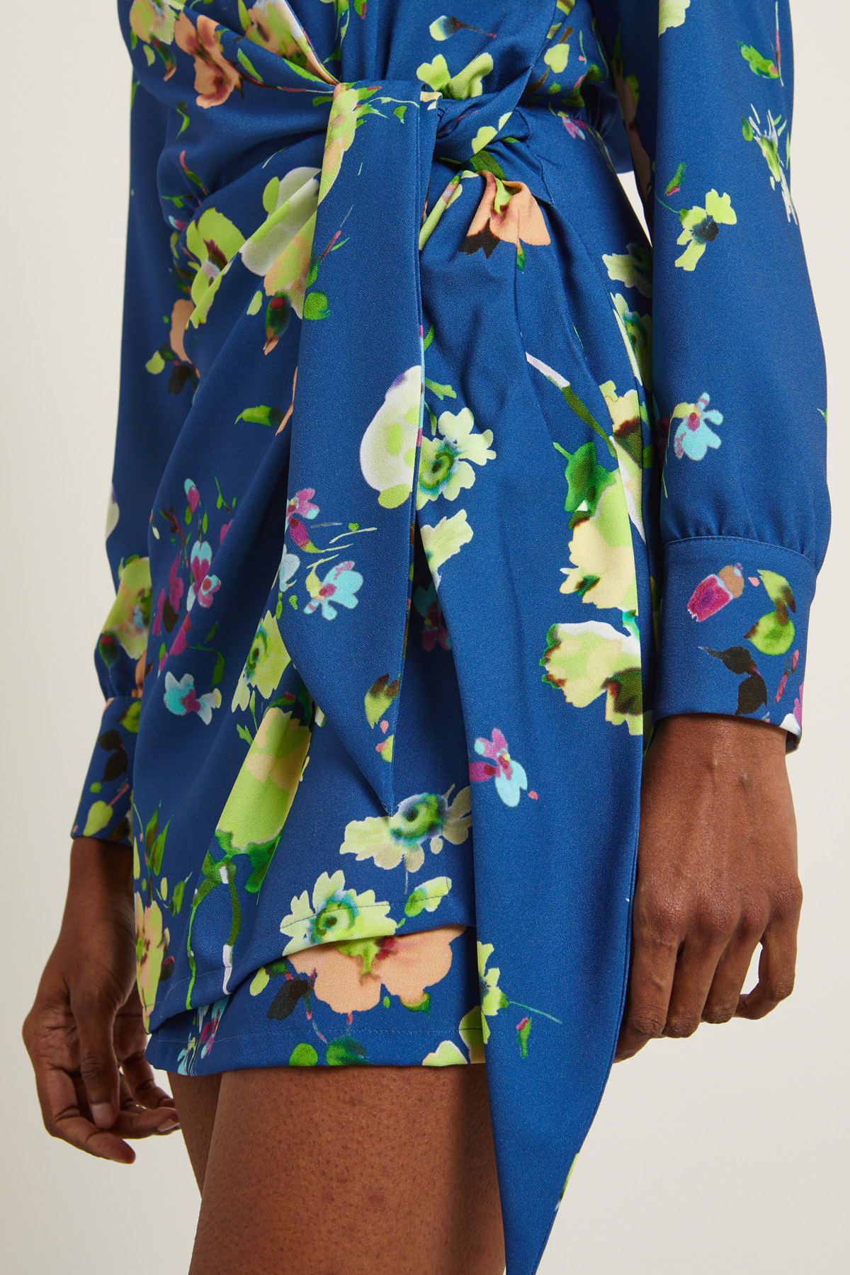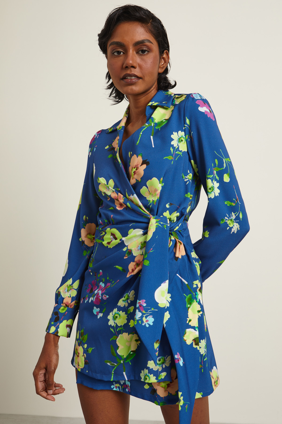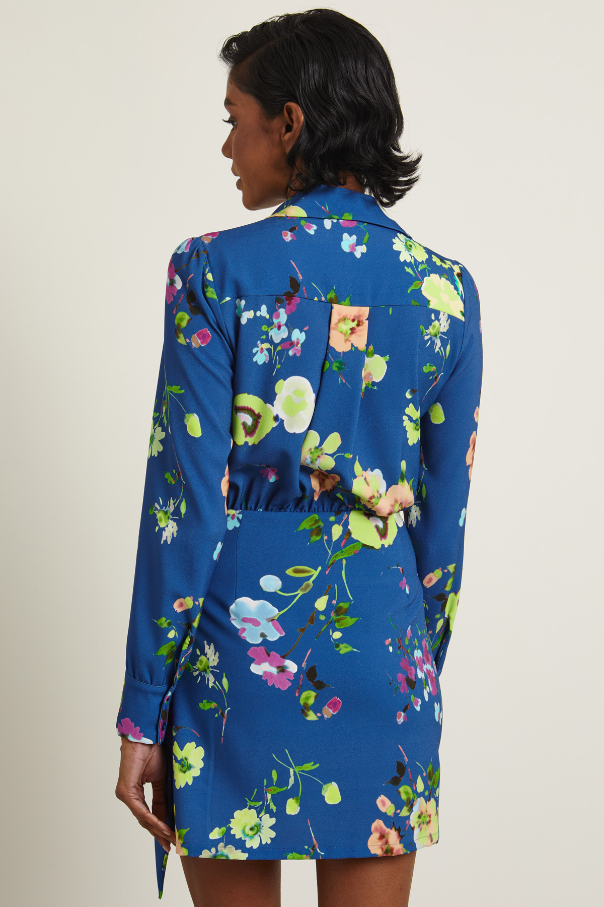 Abito a portafoglio realizzato in sablè stampato con colletto a camicia, scollo a V, maniche lunghe con polsino e bottoni, taglio in vita, carrè e cannoncino nel retro. Allacciatura tramite lacci da annodare. Capo