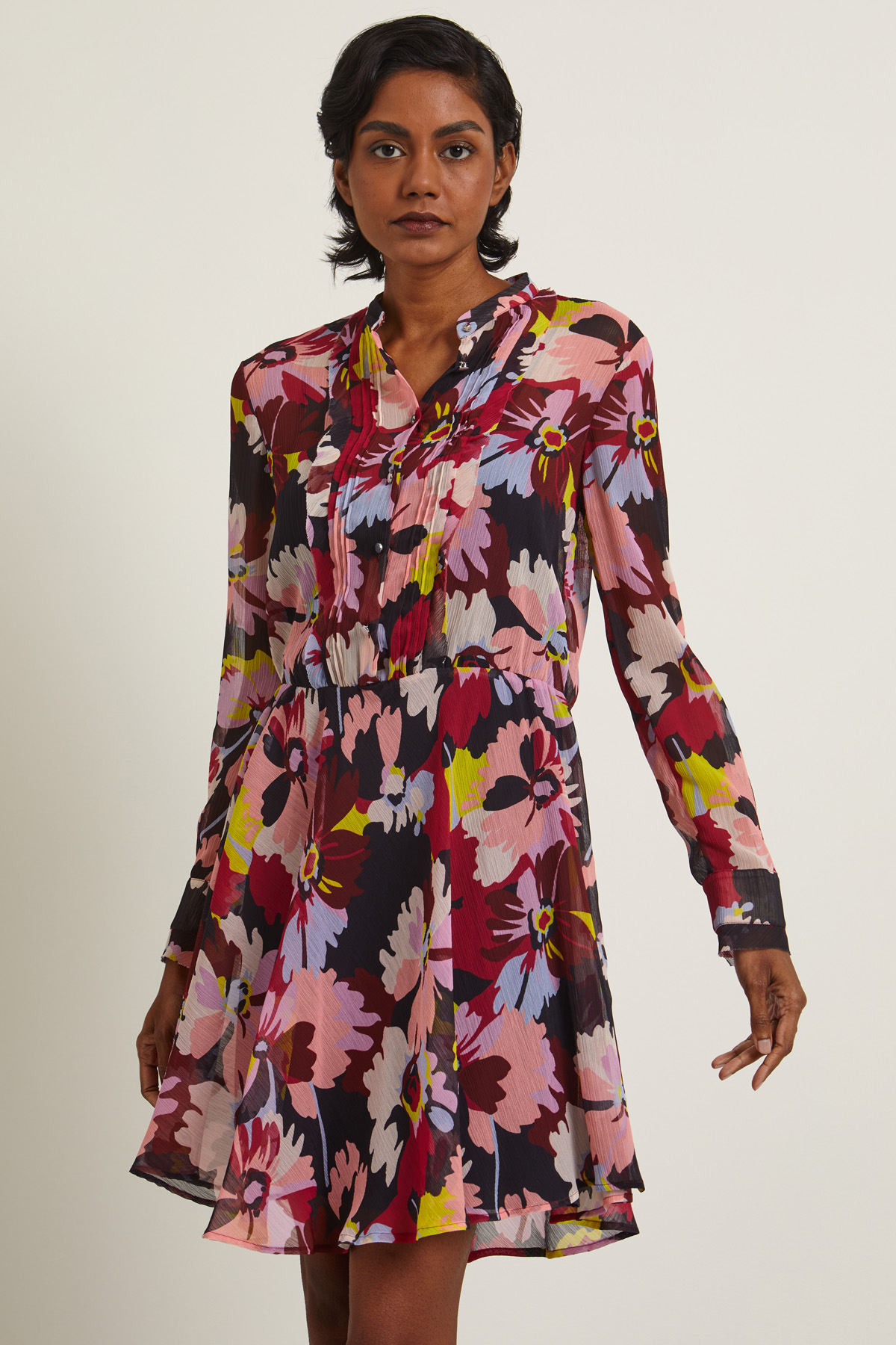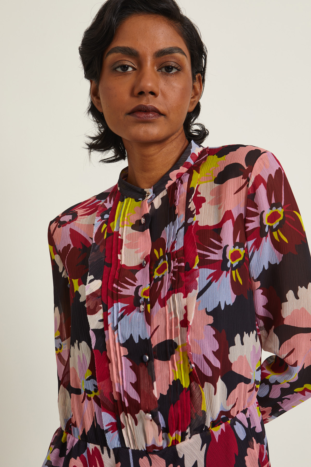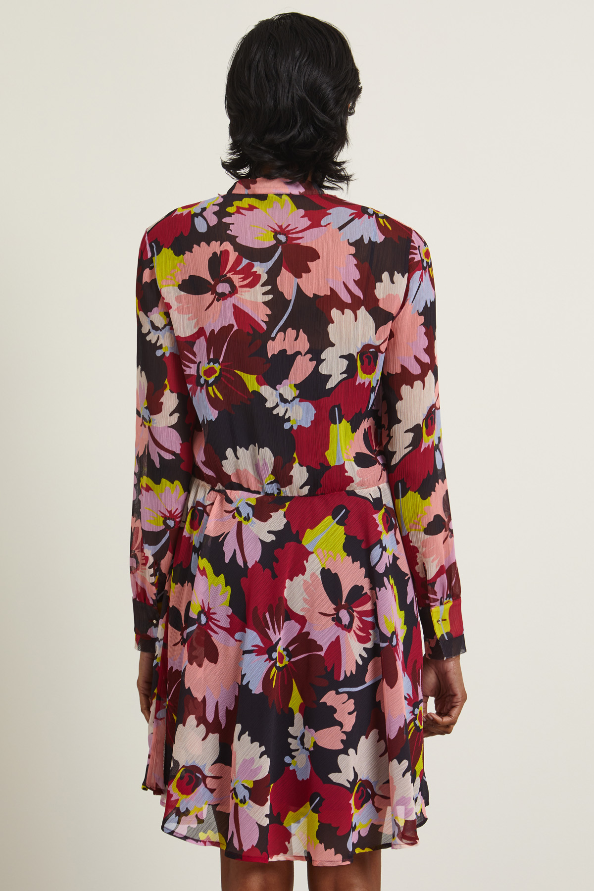 Abito chemisier realizzato in creponne stampato con colletto rotondo e abbottonatura a vista, dettagli di pieghe cucite sul davanti, maniche lunghe con polso e bottone e inserto elastico in vita. Capo dotato di sottoveste.