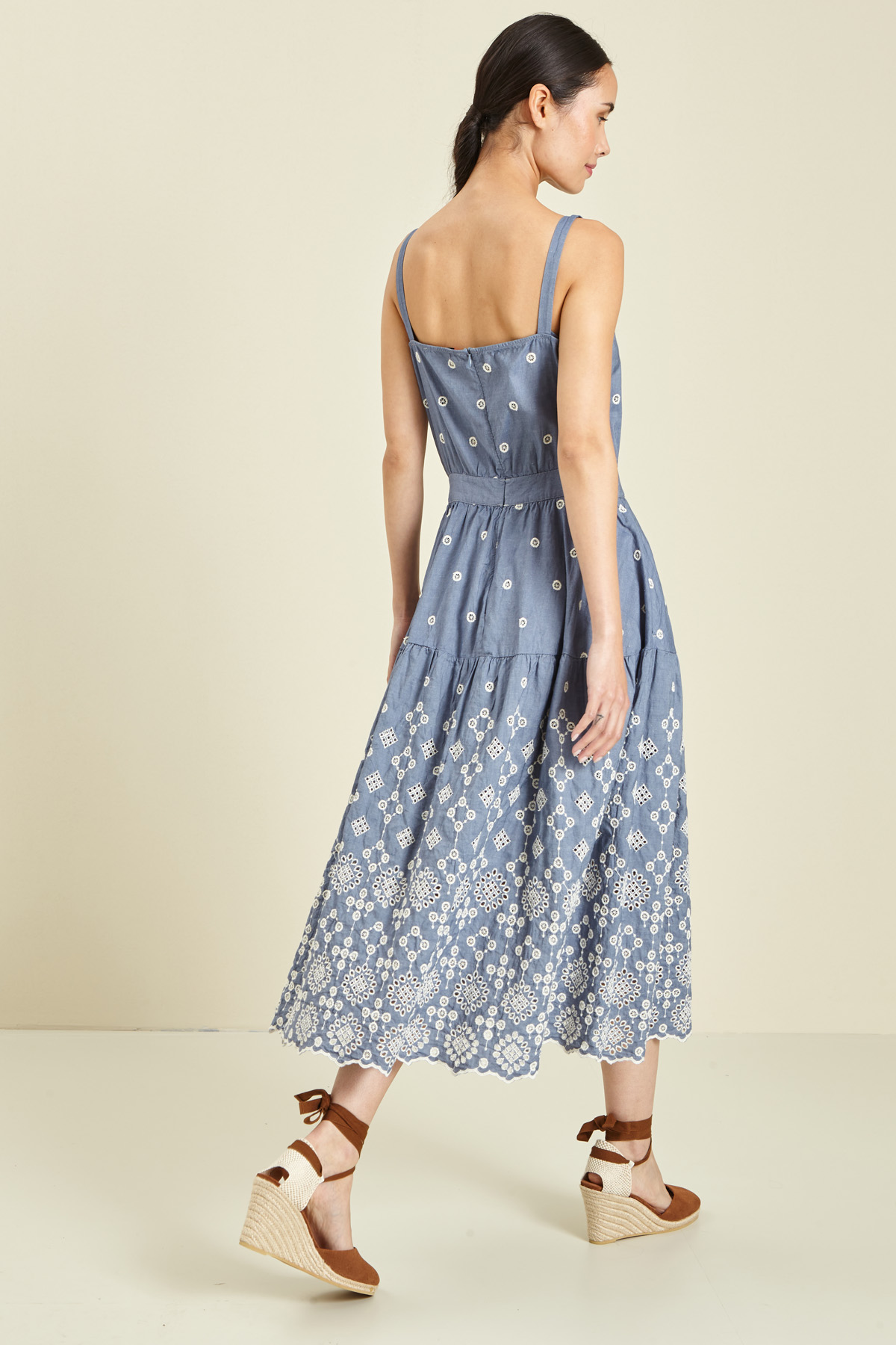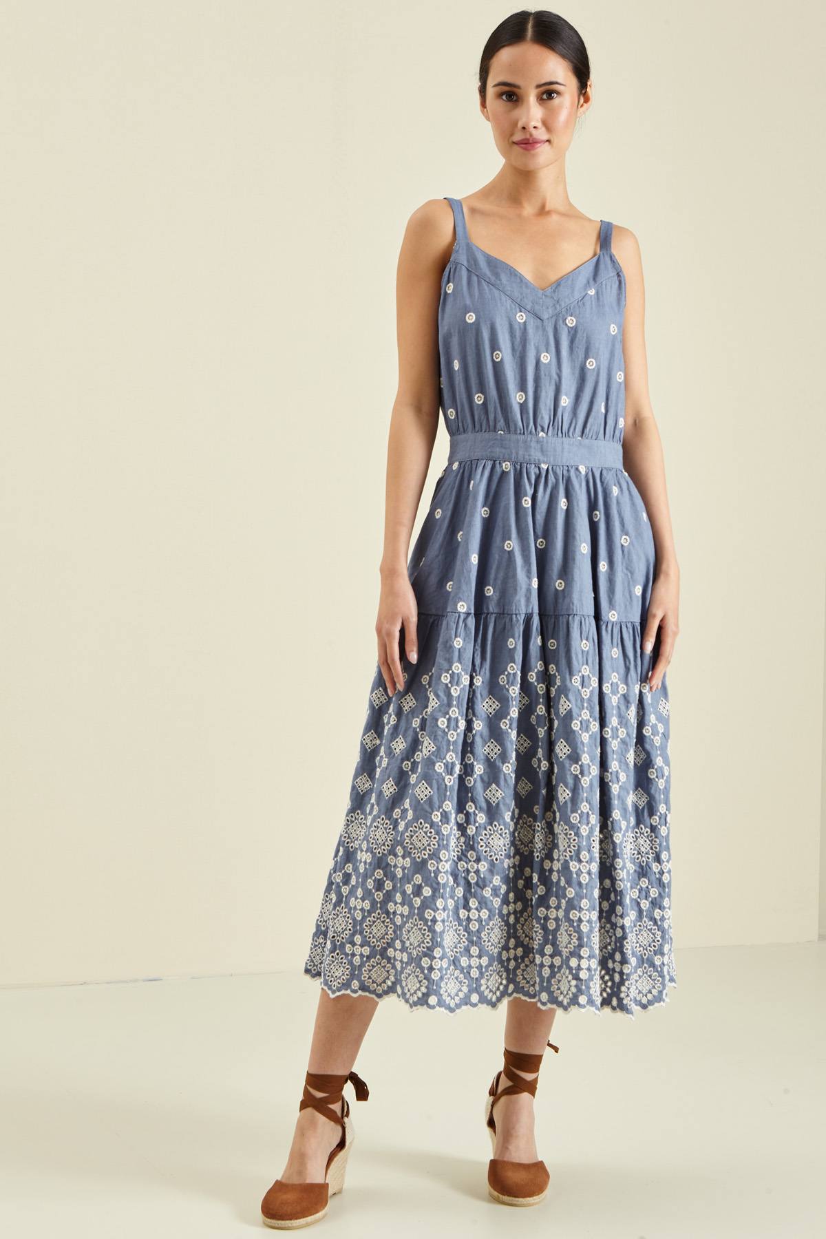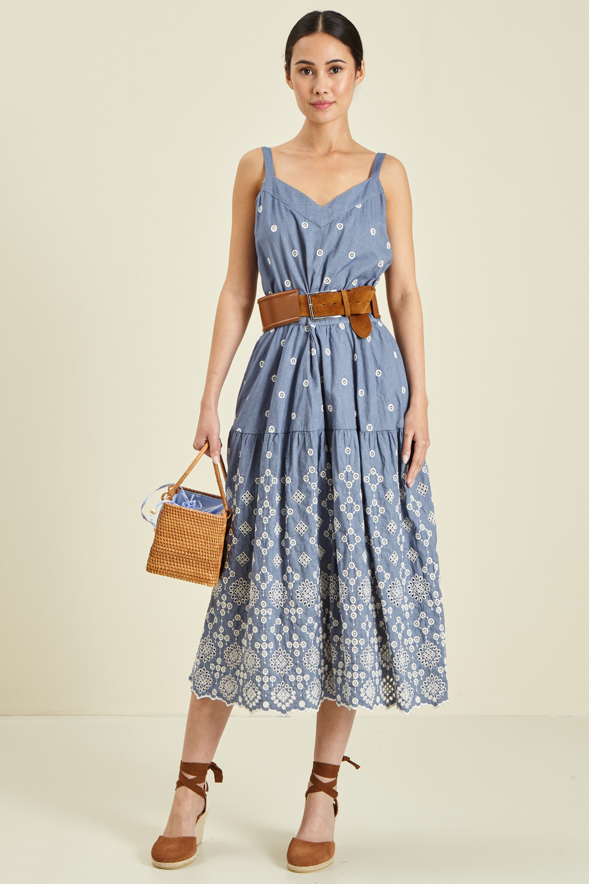 Abito dalla linea sfiancata realizzato in tela di cotone e lino con lavorazione sangallo. Modello con scollo a V, spallini stretti, cintone in vita e inserto di balza leggermente arricciata sulla lunghezza. Capo foderato, con allacciatura tramite zip invisibile dietro.