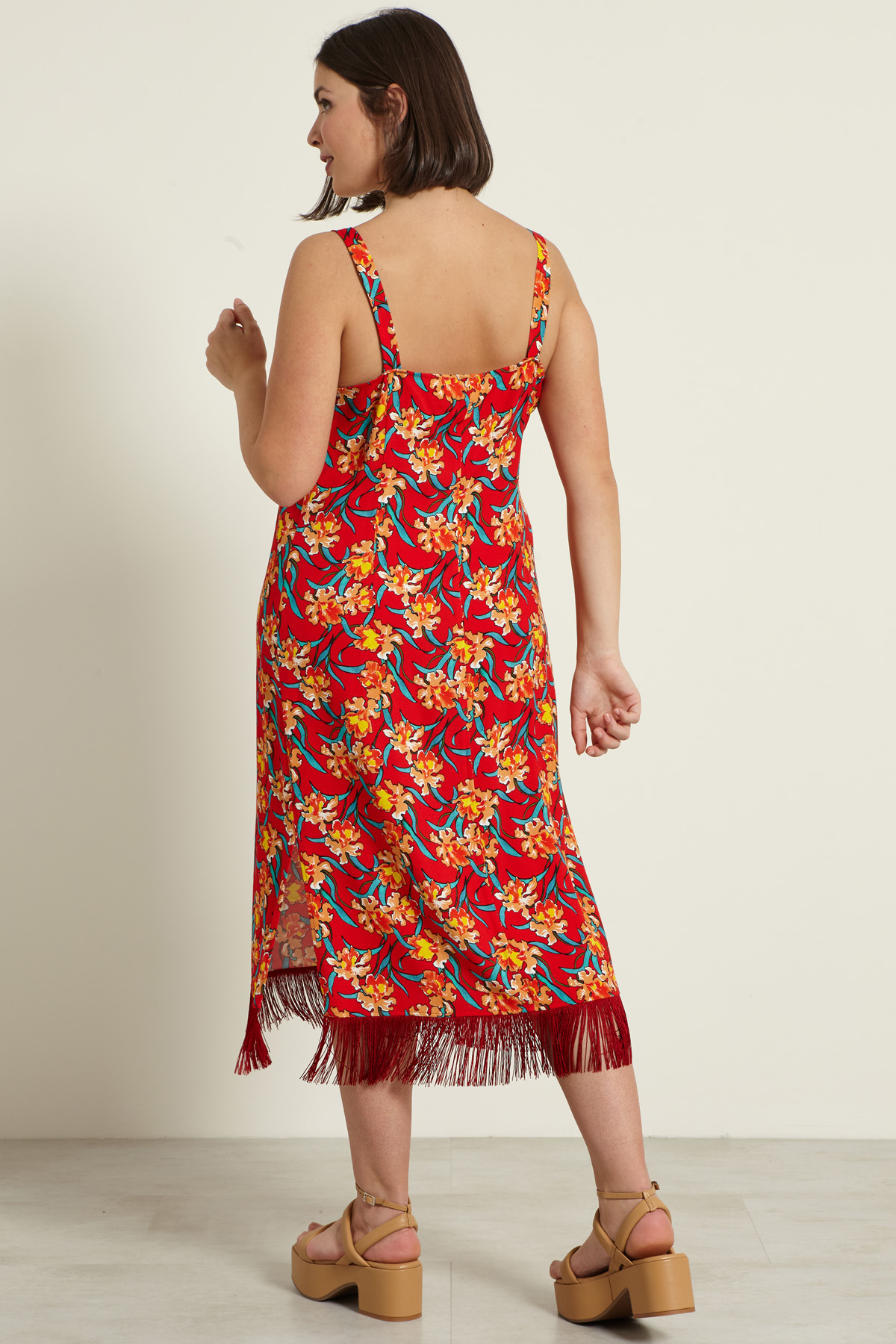 Abito smanicato midi dalla linea dritta realizzato in sablè di pura viscosa stampata, con scollo a V, spalline sottili e motivo di frange al fondo.