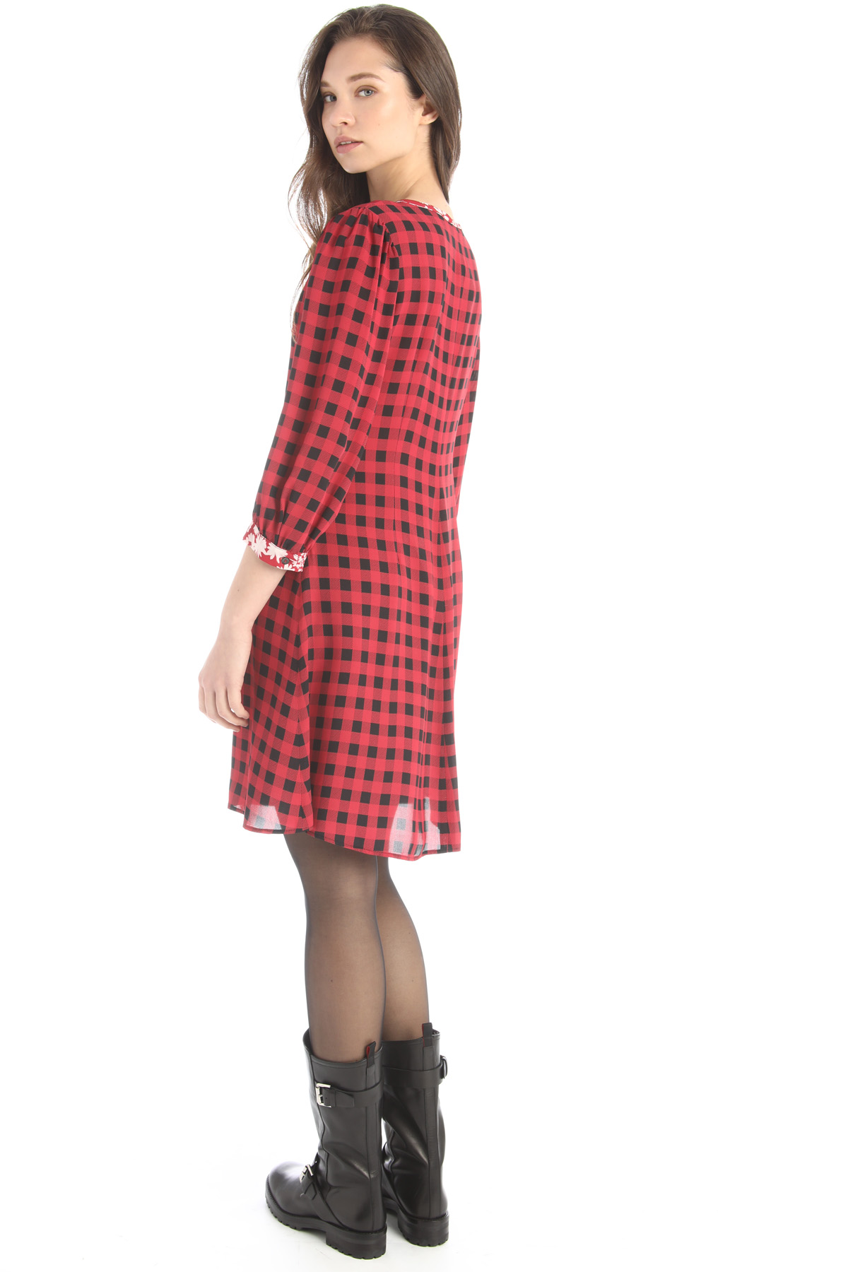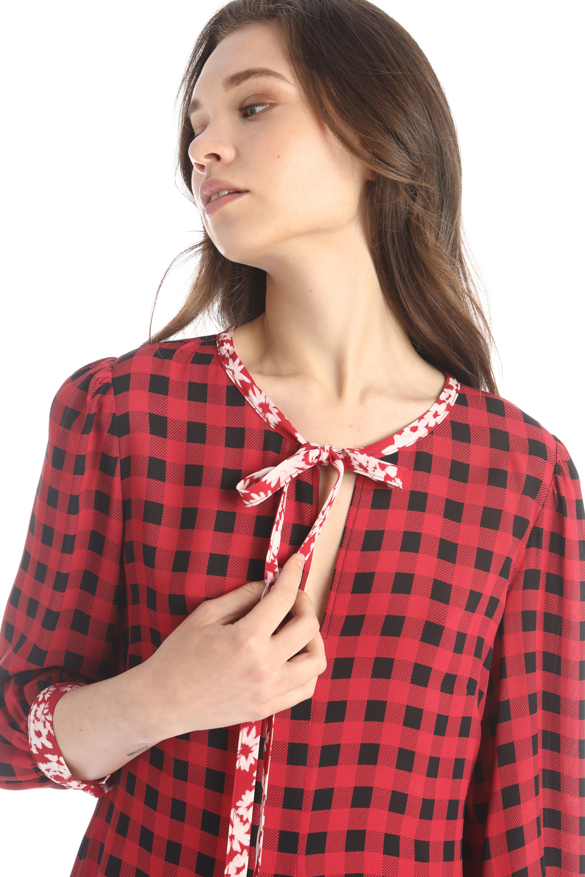 Abito dalla linea fluida realizzato in georgette di pura viscosa stampato, con collo a foulard e apertura a V, maniche a tre quarti con polsino e bottone. Capo sfoderato.