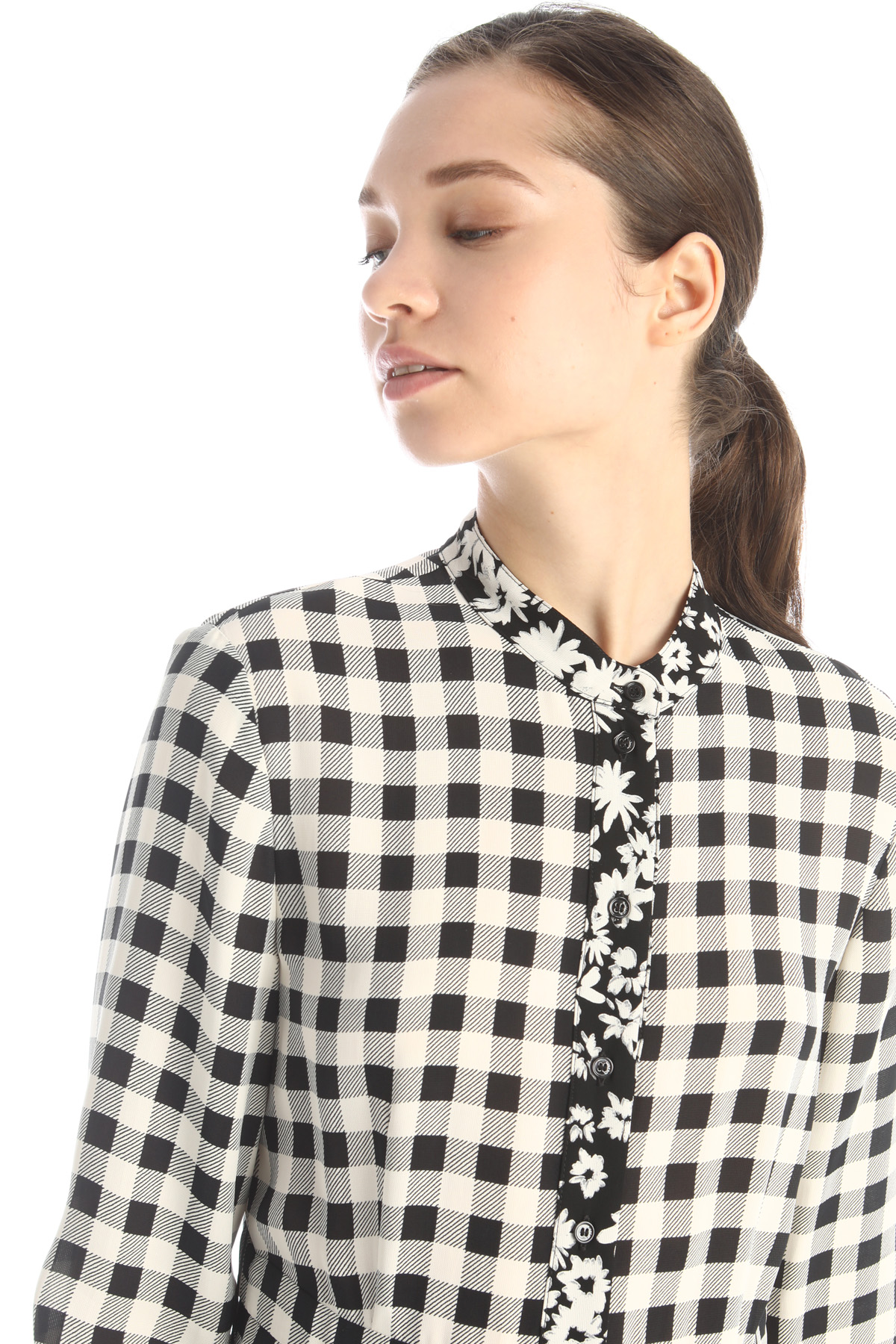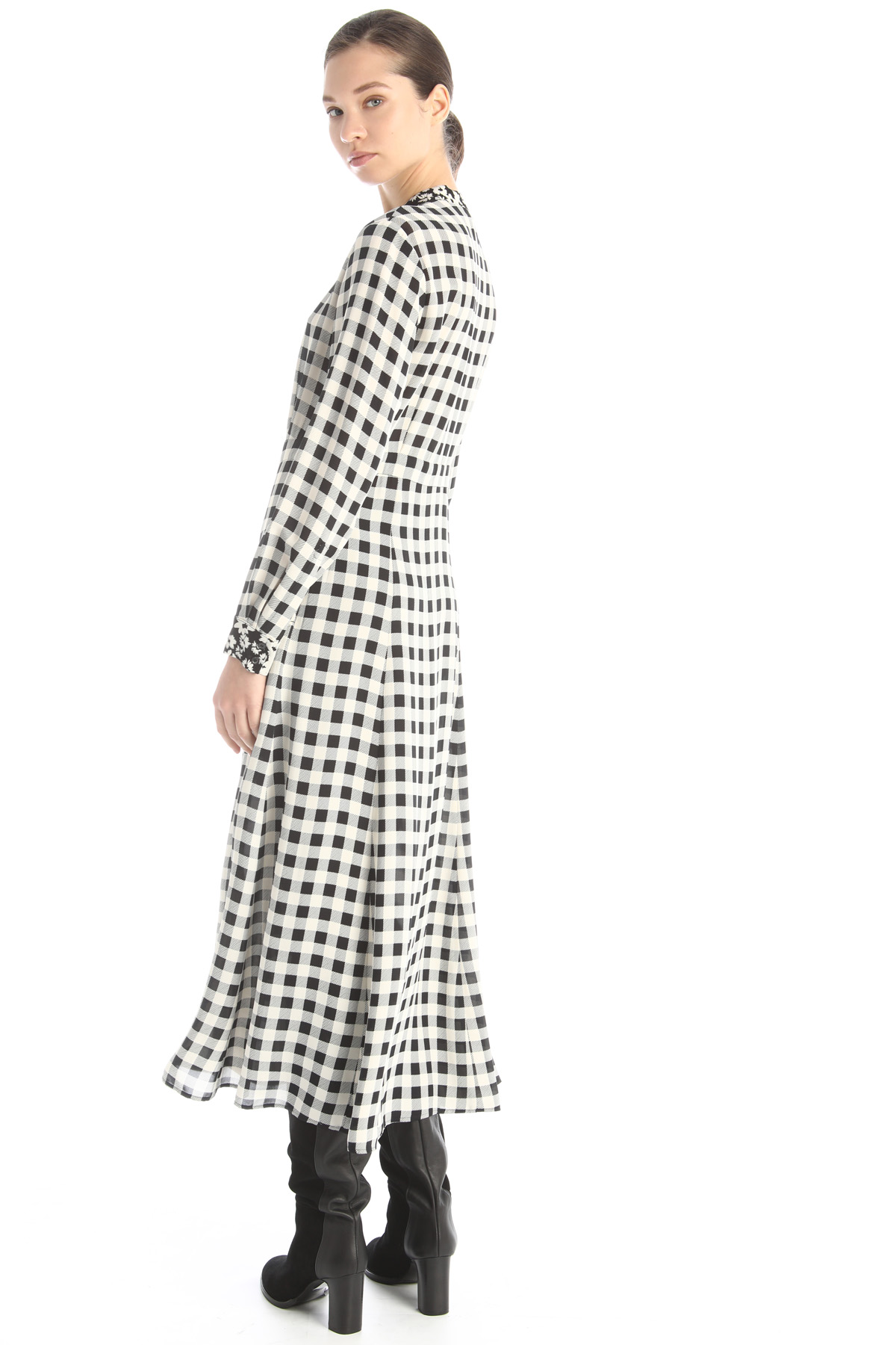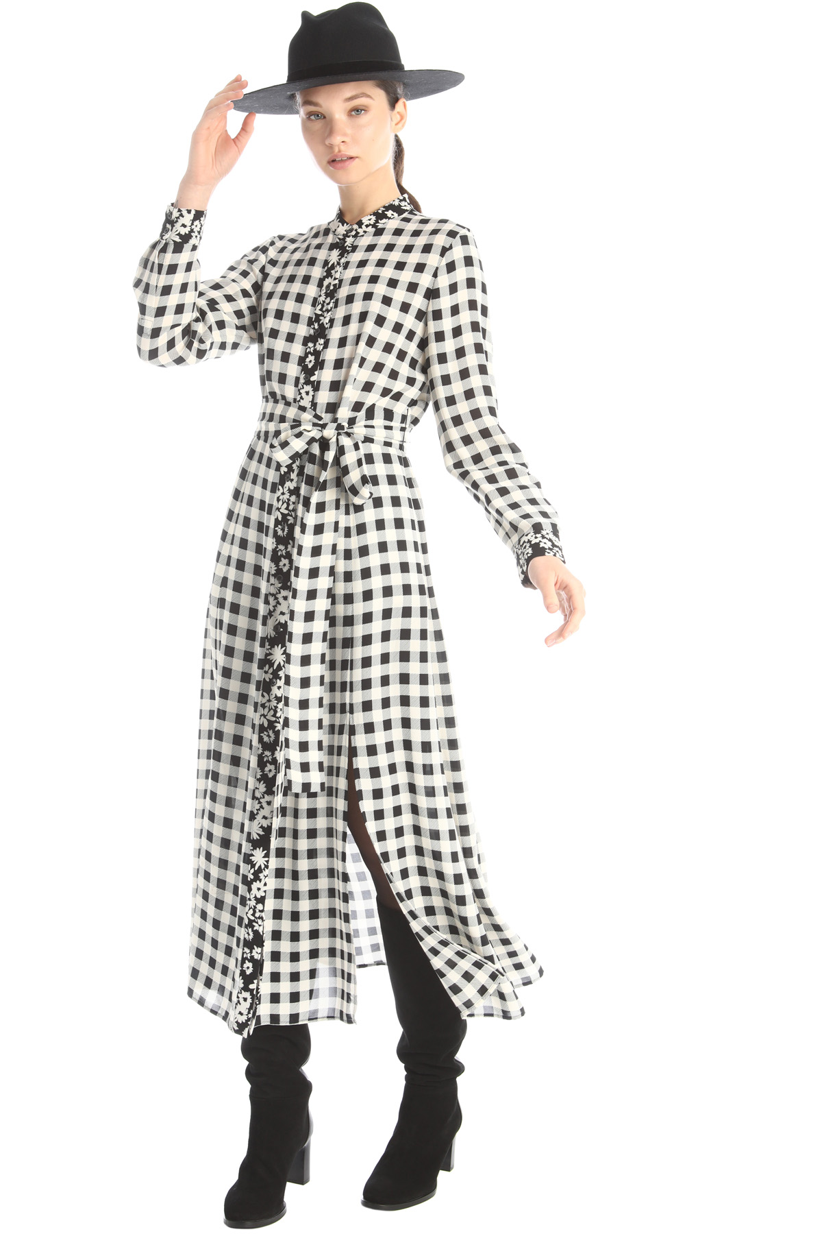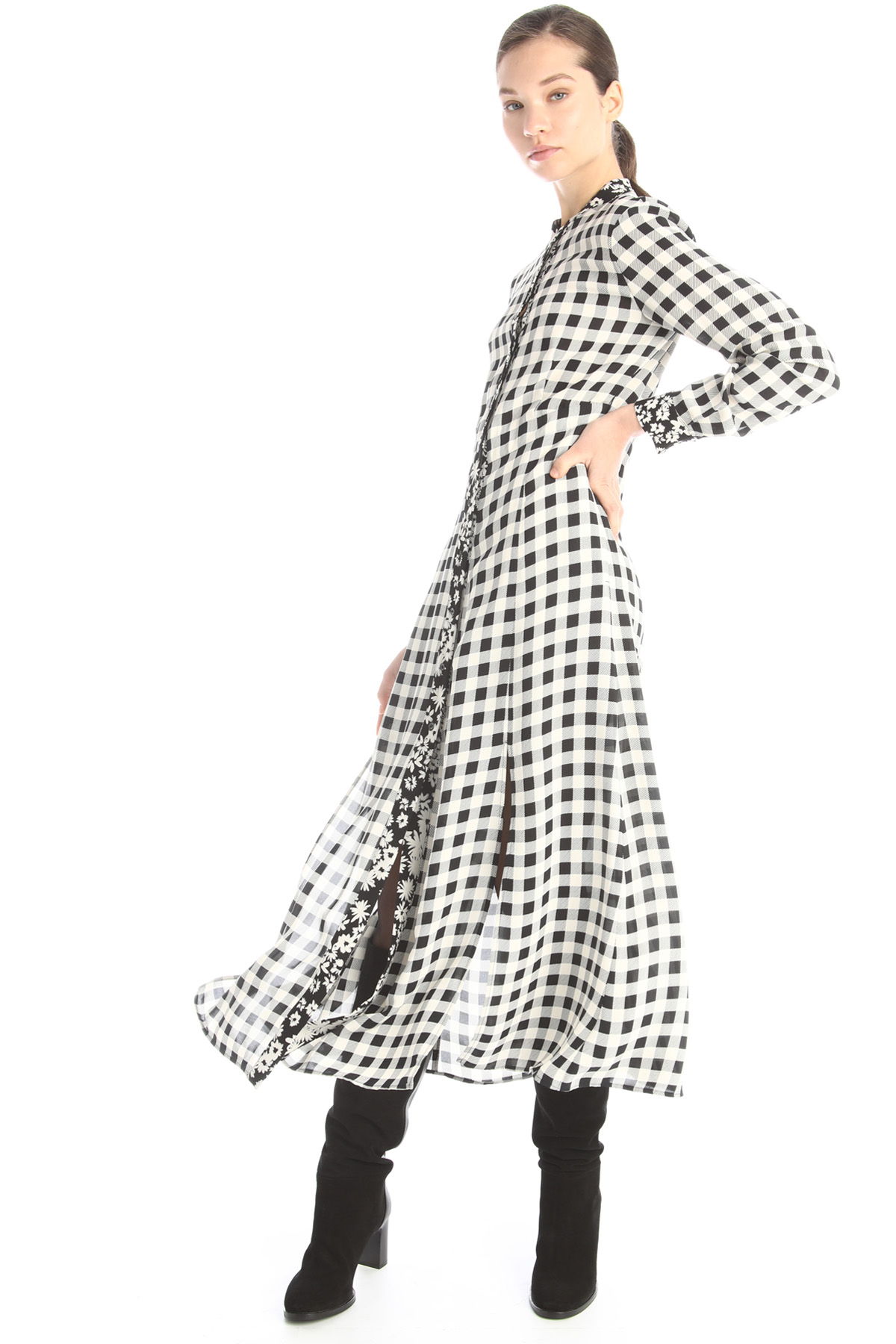 Abito chemisier dalla linea fluida realizzato in georgette di pura viscosa stampata, con colletto alla coreana, maniche lunghe con polsino e bottone, spacco laterale a fondo capo e allacciatura tramite bottoni a vista e cintura coordinata.
