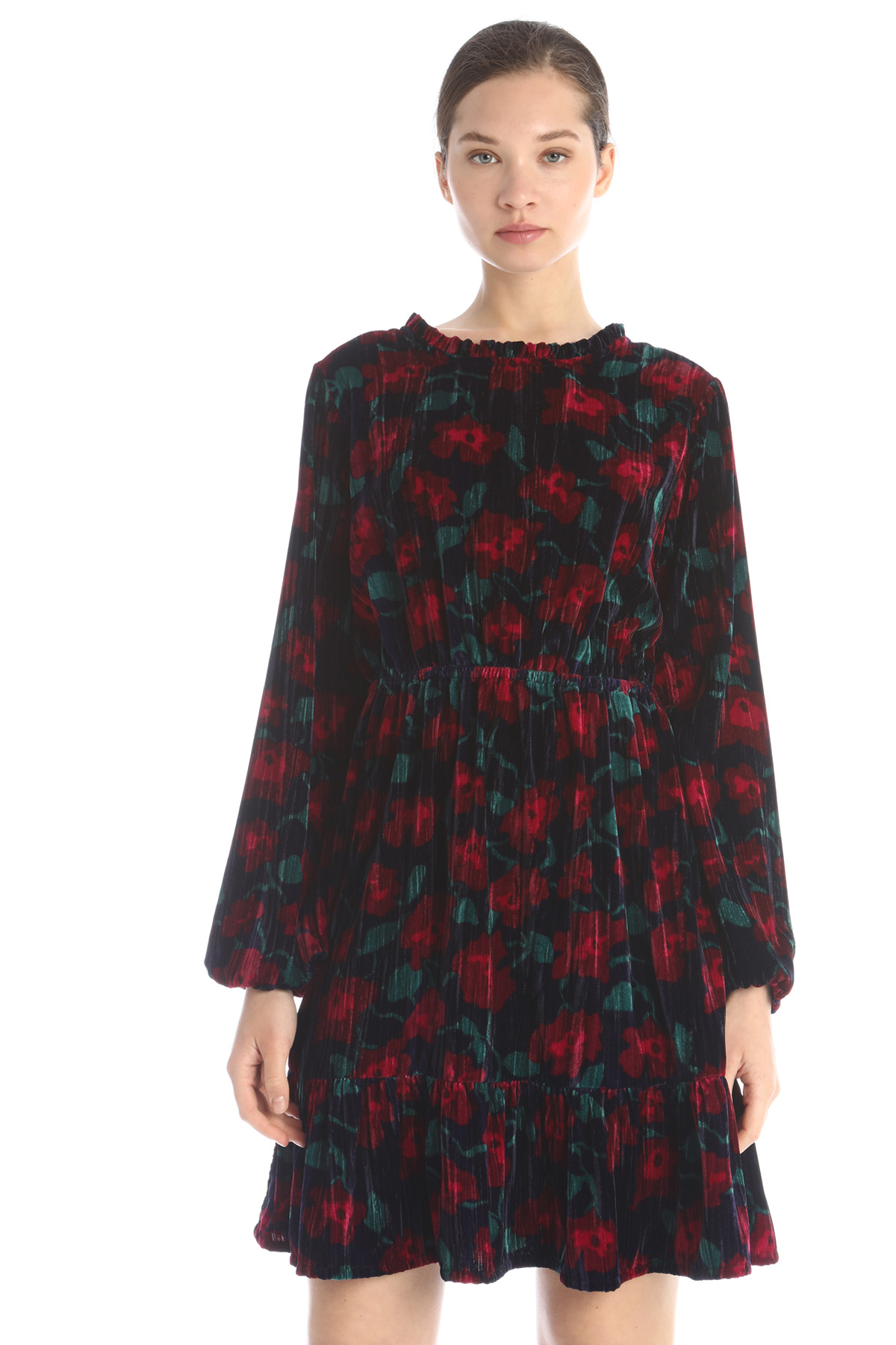 Abito dalla linea svasata realizzato in velluto, scollo a barchetta con motivo di rouches, maniche lunghe, inserto elastico in vita e a fondo manica, balza a fondo capo e apertura a goccia con bottone sul retro. Capo sfoderato.