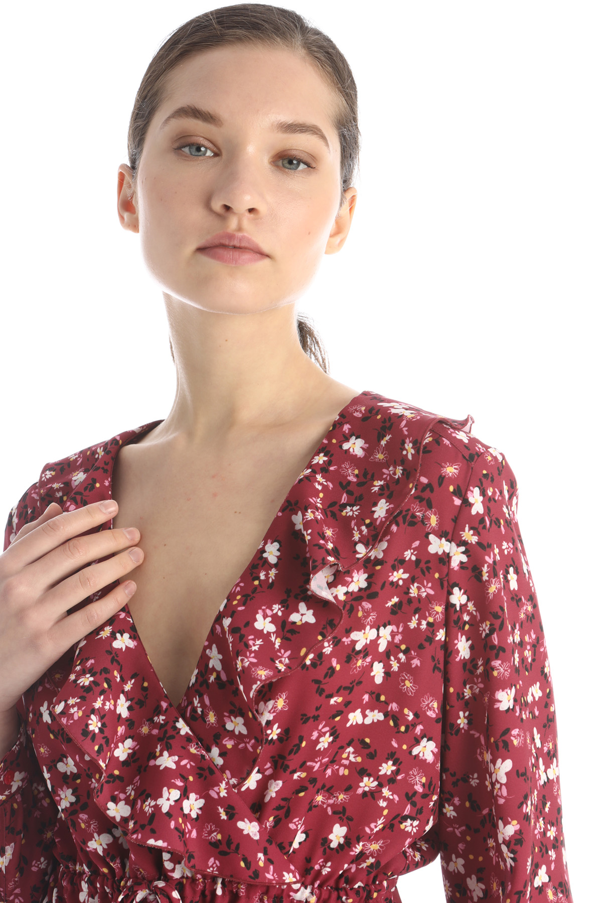 Abito dalla linea fluida realizzato in doppia georgette stampata, scollo a V con motivo a volant, maniche lunghe con polsino e bottone, doppia coulisse in vita e arricciatura sul retro.