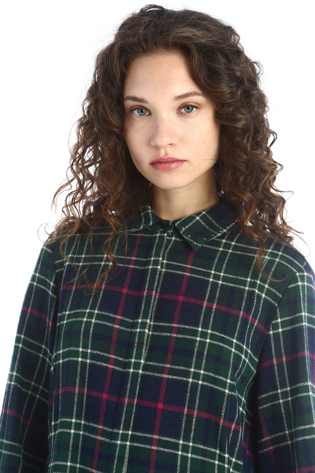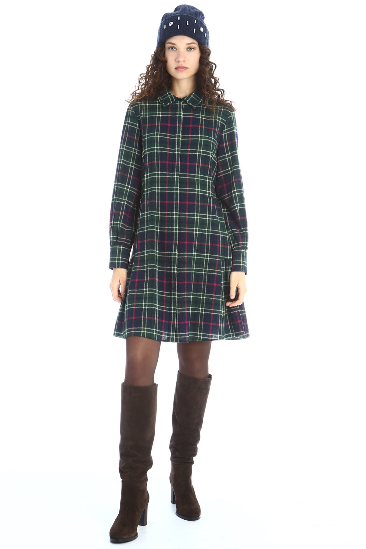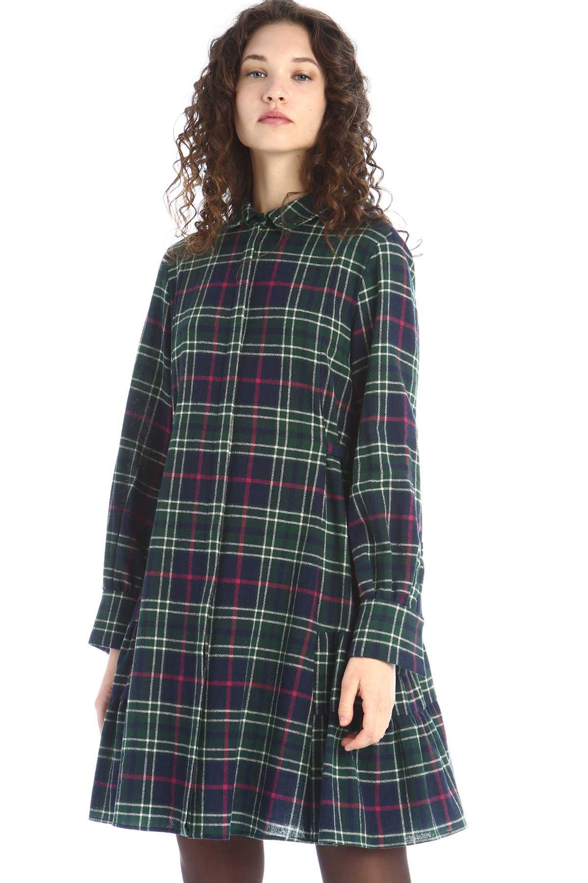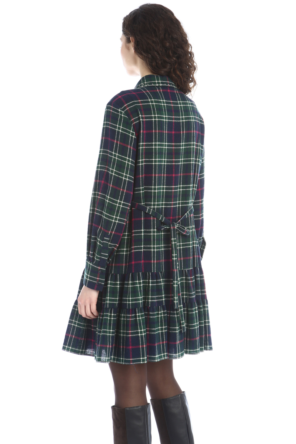 Abito chemisier dalla linea svasata realizzato in tessuto di misto viscosa e lana tinto filo, colletto a camicia con dettaglio di borchie applicate, maniche lunghe con polsino e bottoni, motivo di balze a fondo capo e allacciatura nascosta tramite bottoni e cintura coordinata.