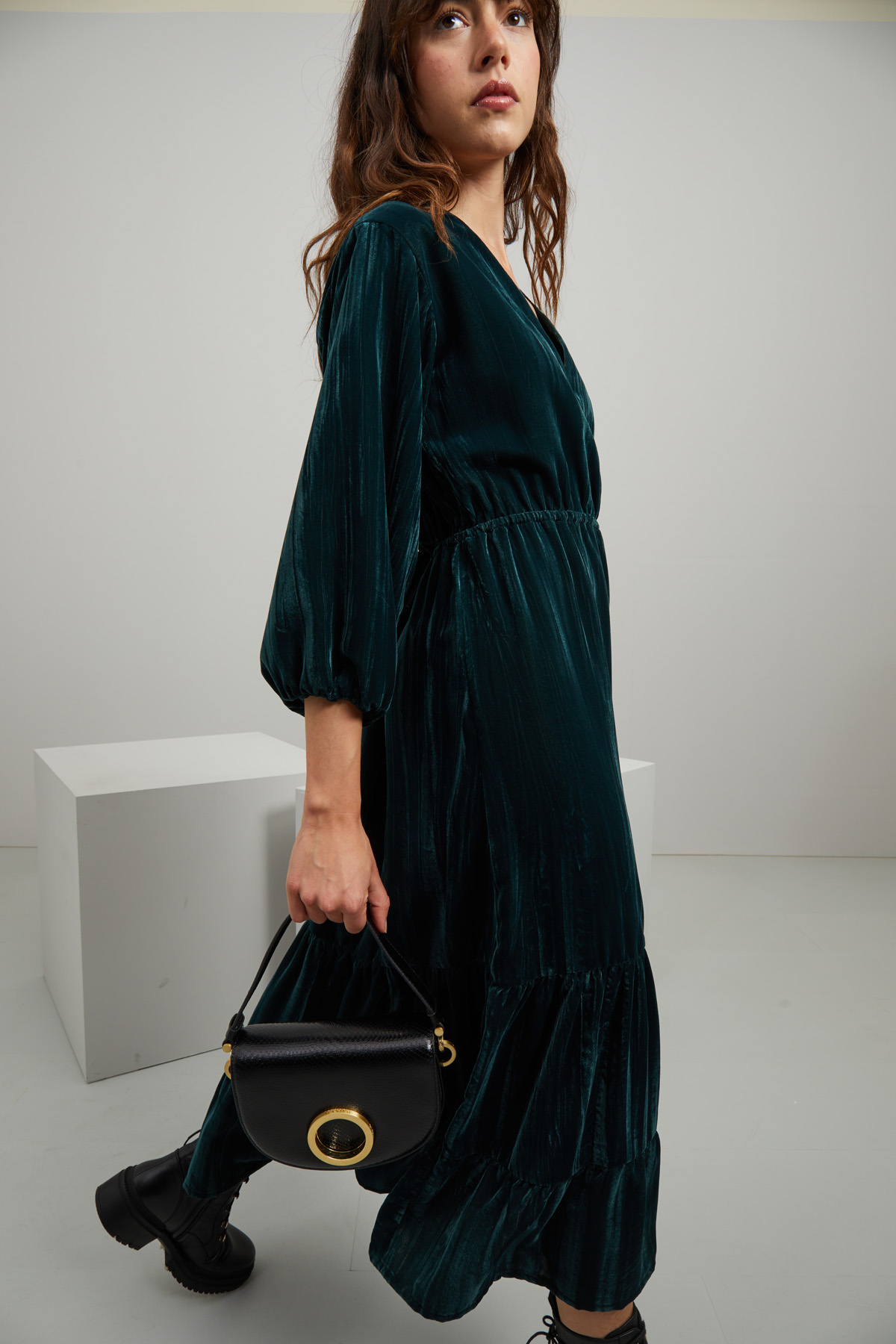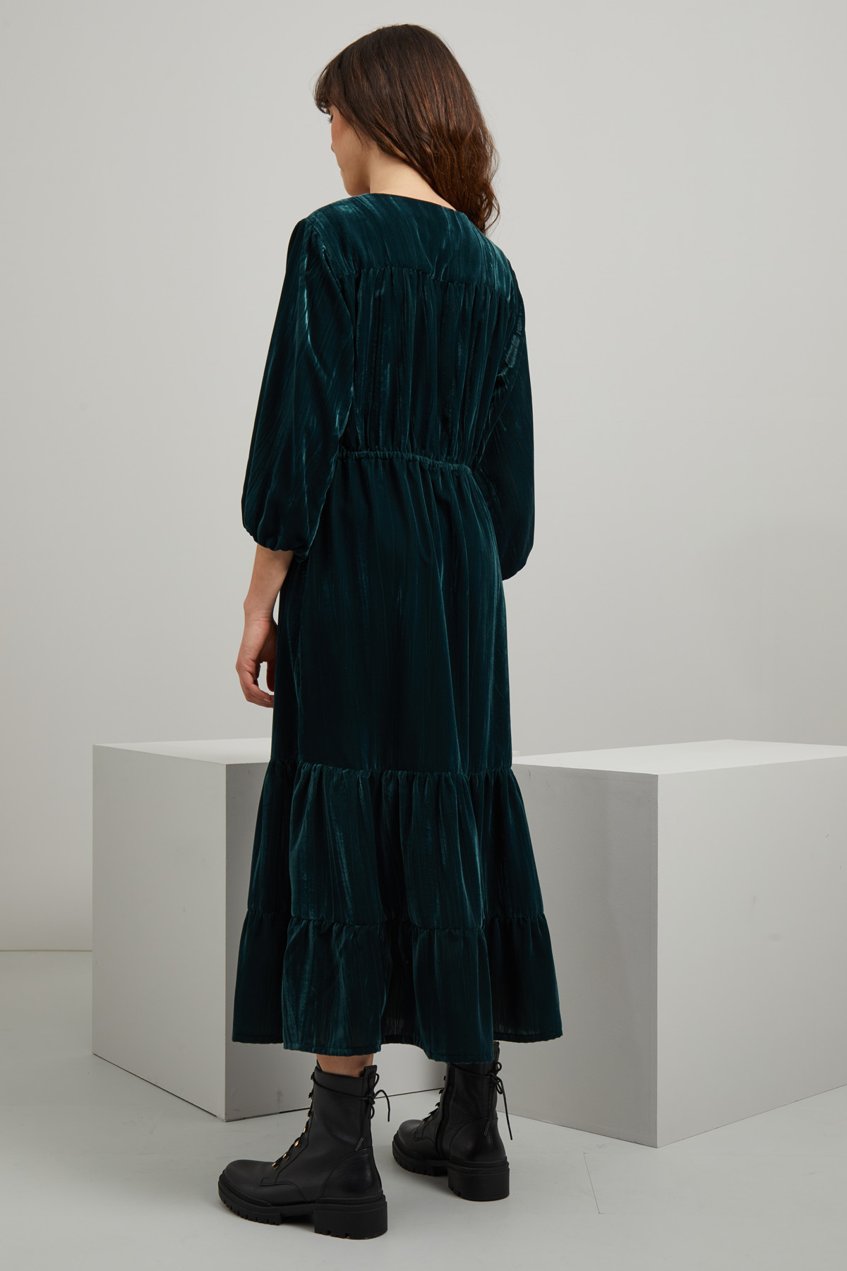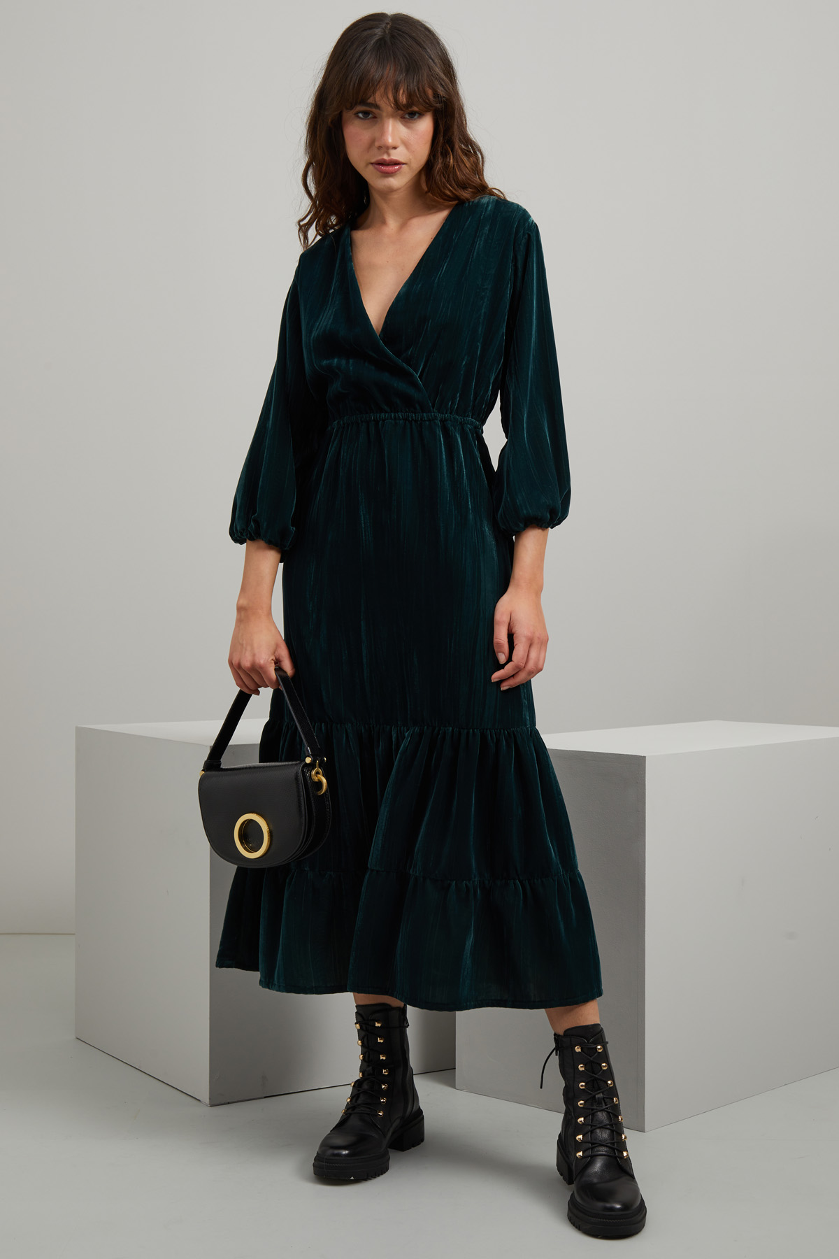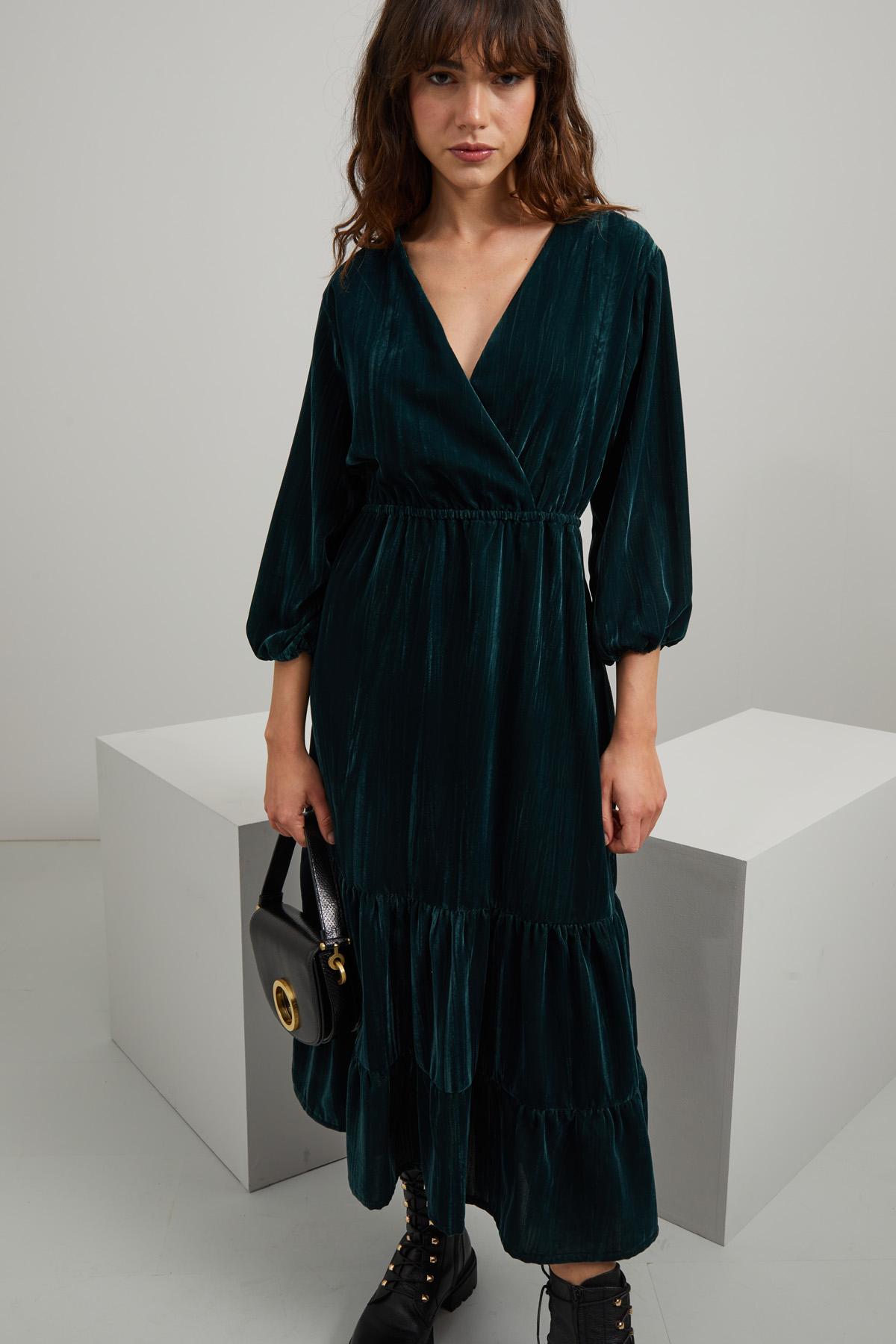 Abito lungo dalla linea svasata realizzato in velluto, con scollo a V incrociato sul davanti, maniche a tre quarti, inserto elastico al polso e in vita, motivo di balza al fondo.