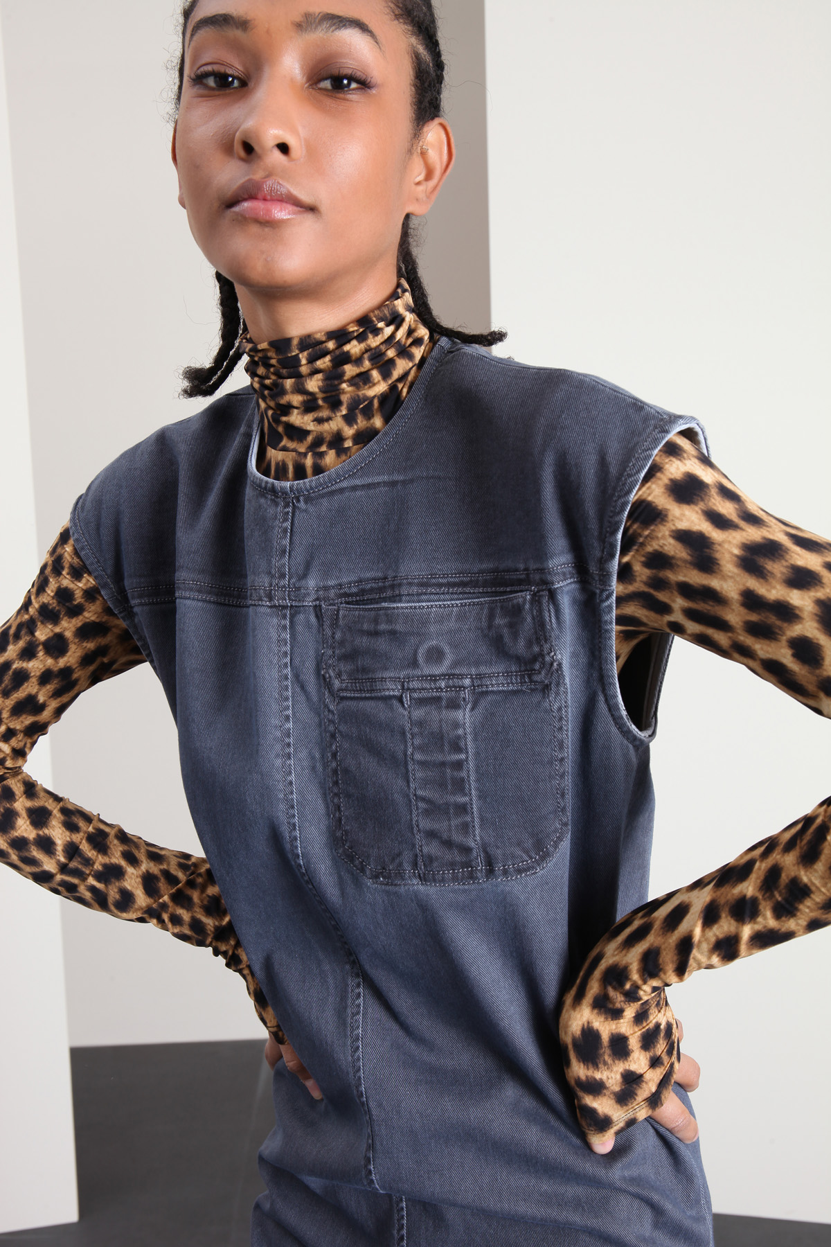 Abito longuette dalla linea dritta realizzato in bull di cotone stretch, con scollo a giro, senza maniche e taschino applicato al petto. Modello con motivo drappeggiato in vita, spacco laterale con bottoni al fondo e allacciatura tramite zip nel retro.